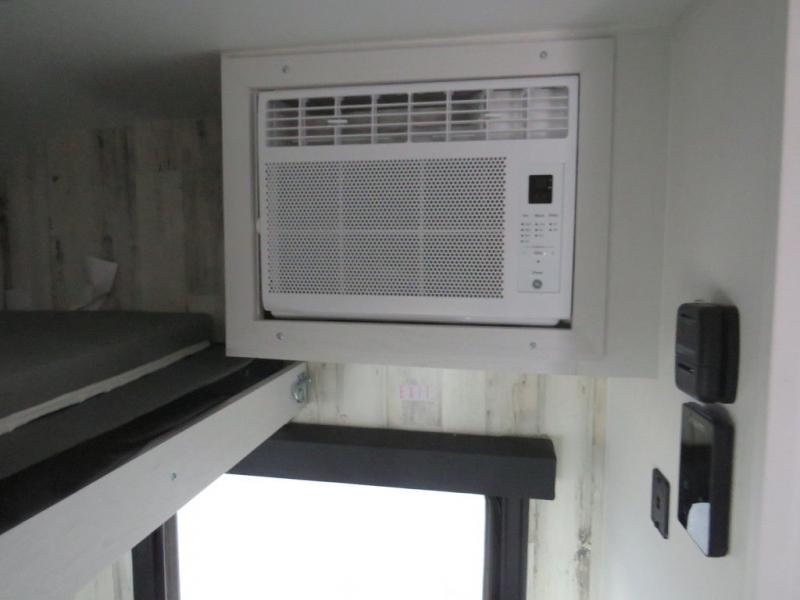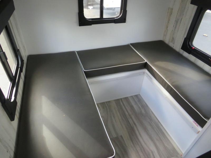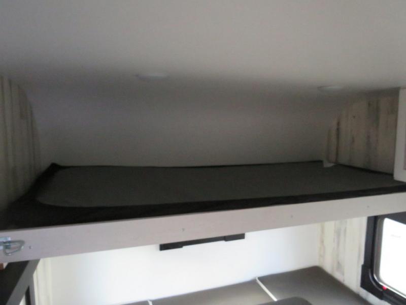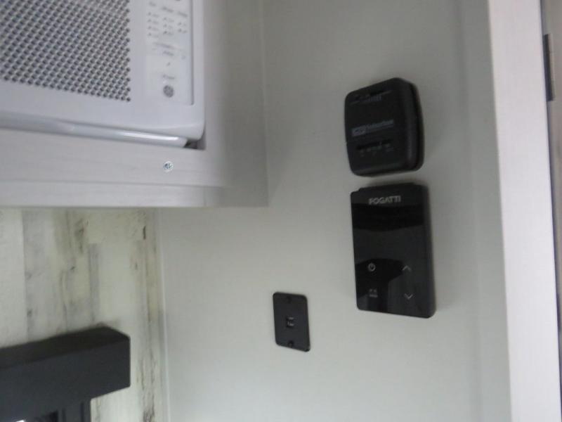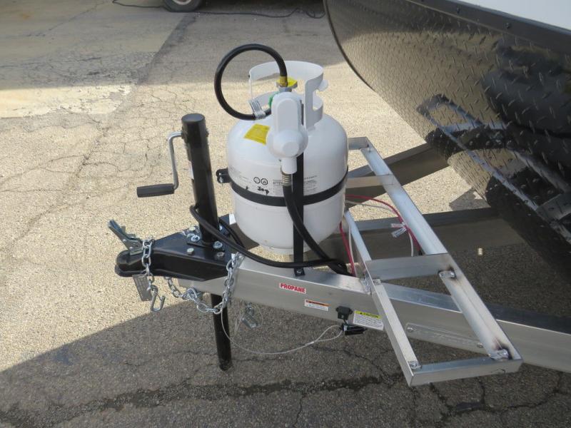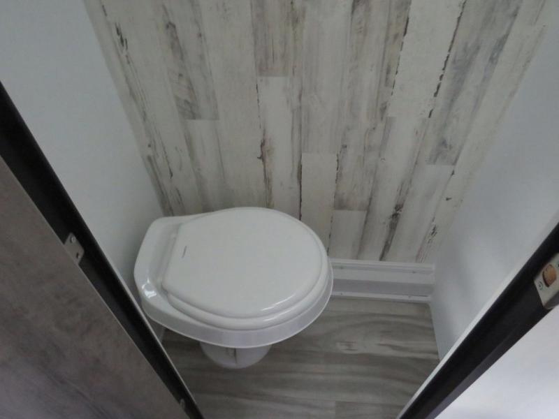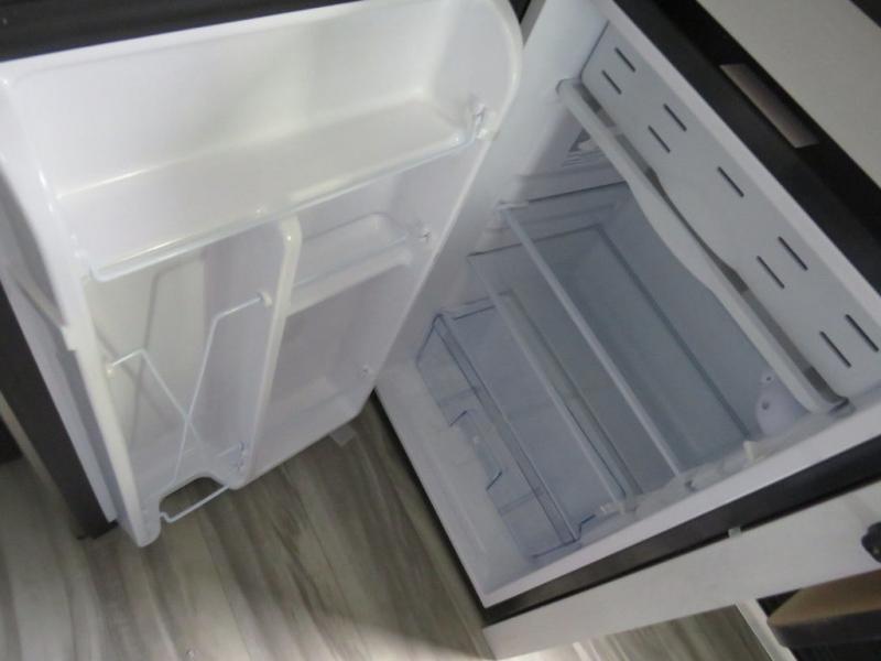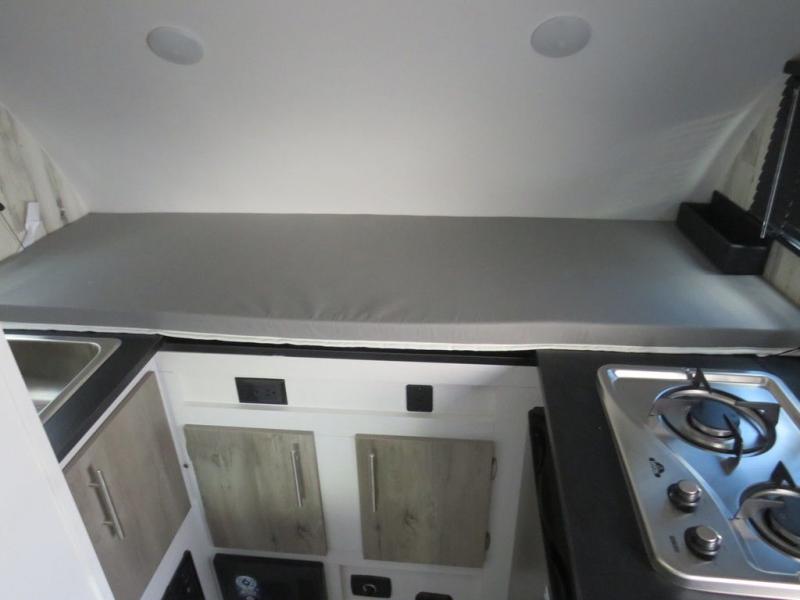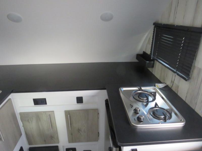 Pack your bags and head off on adventure in this lightweight travel trailer for two! Once you've unloaded your bags, you can set up the 7'6" awning, then head inside to make lunch on the two burner stainless steel stovetop. There is also ample counter space in the rear kitchen, plus a 3 cu. ft. 12V refrigerator to keep your food fresh. This unit also includes a private toilet for added convenience!