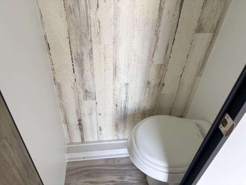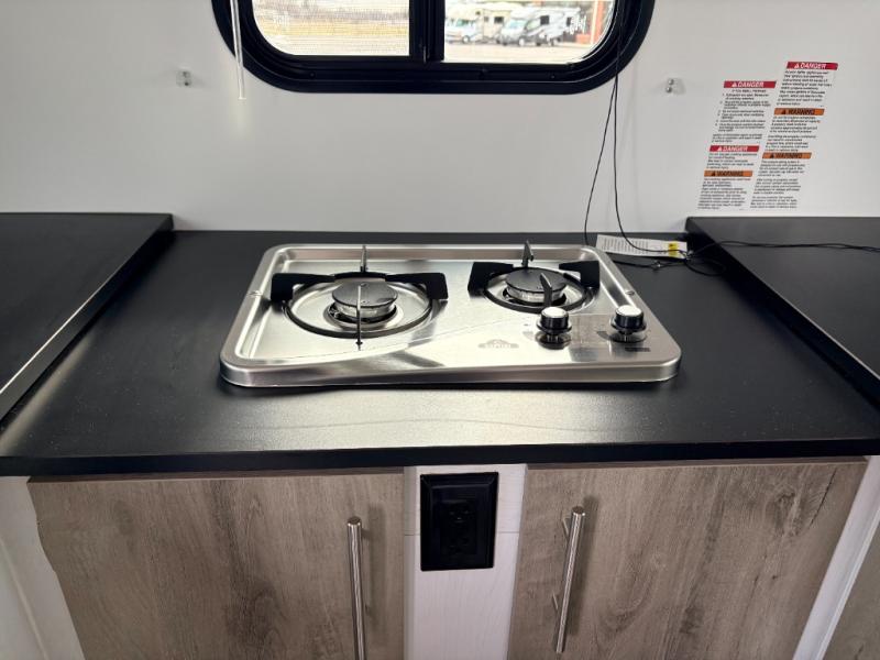 Pack your bags and head off on adventure in this lightweight travel trailer for two! Once you've unloaded your bags, you can set up the 7'6" awning, then head inside to make lunch on the two burner stainless steel stovetop. There is also ample counter space in the rear kitchen, plus a 3 cu. ft. 12V refrigerator to keep your food fresh. This unit also includes a private toilet for added convenience!