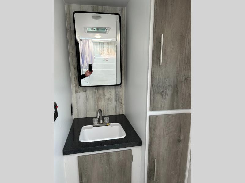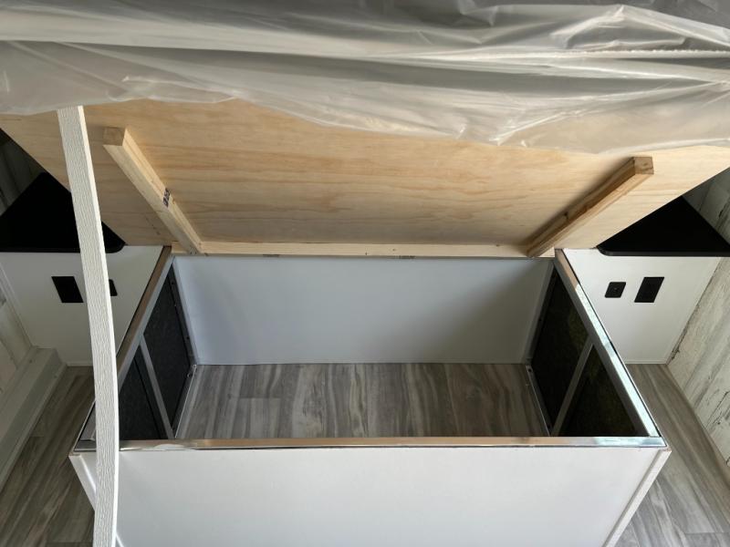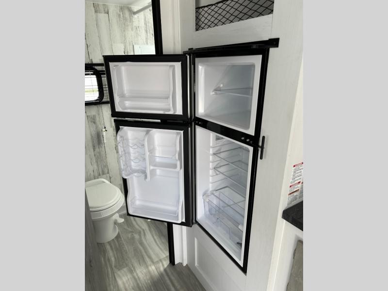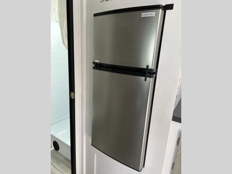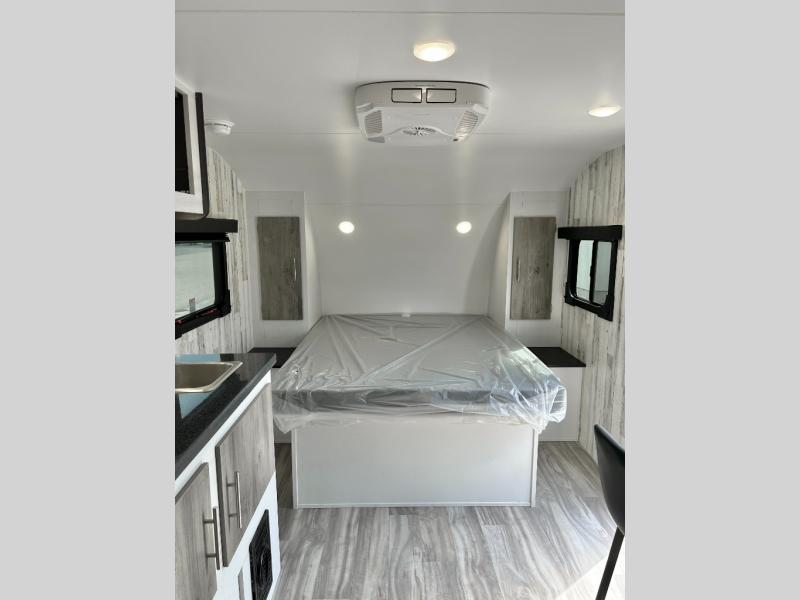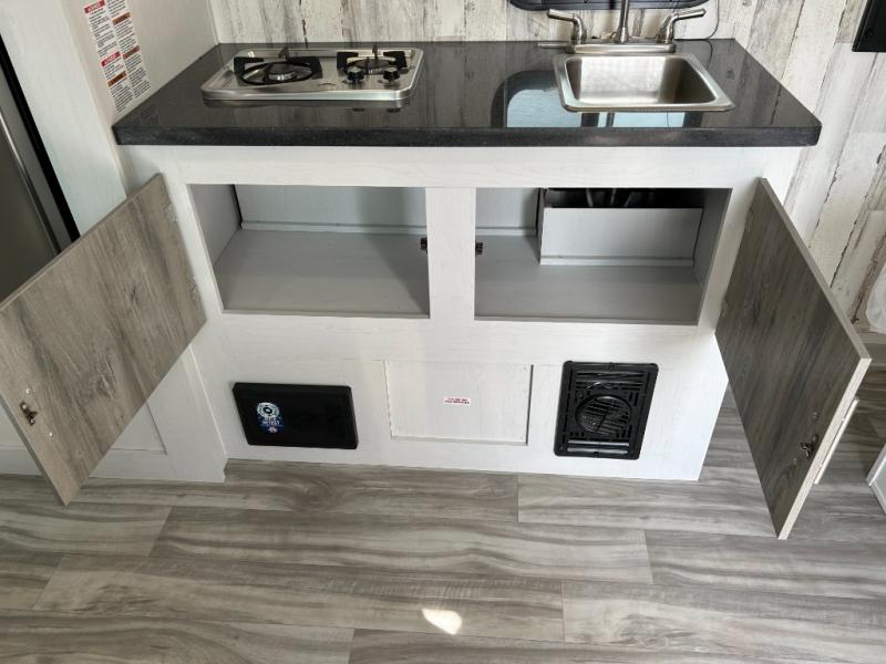 Weekends at the campground are made easy with this travel trailer that can sleep two each night. Once you've unpacked your things, you can stretch your legs around the camp, then head inside to make lunch. You'll find a two burner stainless steel cooktop in the kitchen, along with a 12V refrigerator for food storage. When it's time to turn in for the night, there is a rear bath, plus a front queen bed for comfortable sleeping space. This travel trailer also includes plenty of storage space, including storage shelves in the bath and storage throughout!