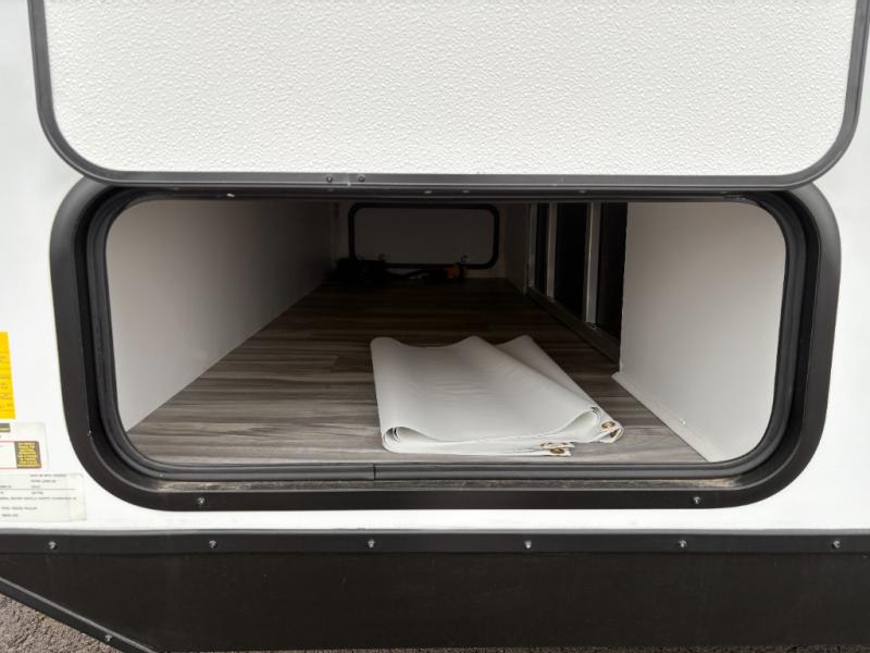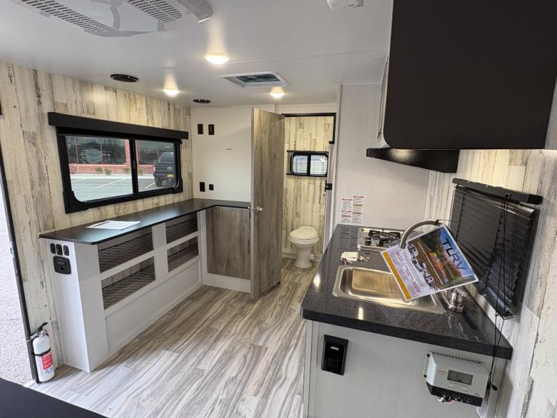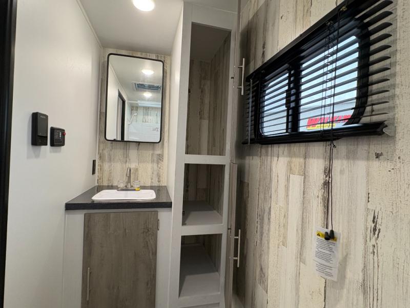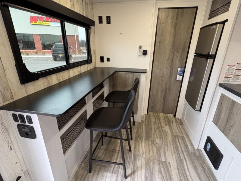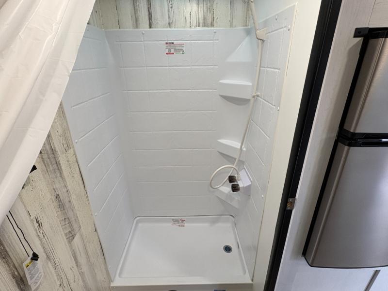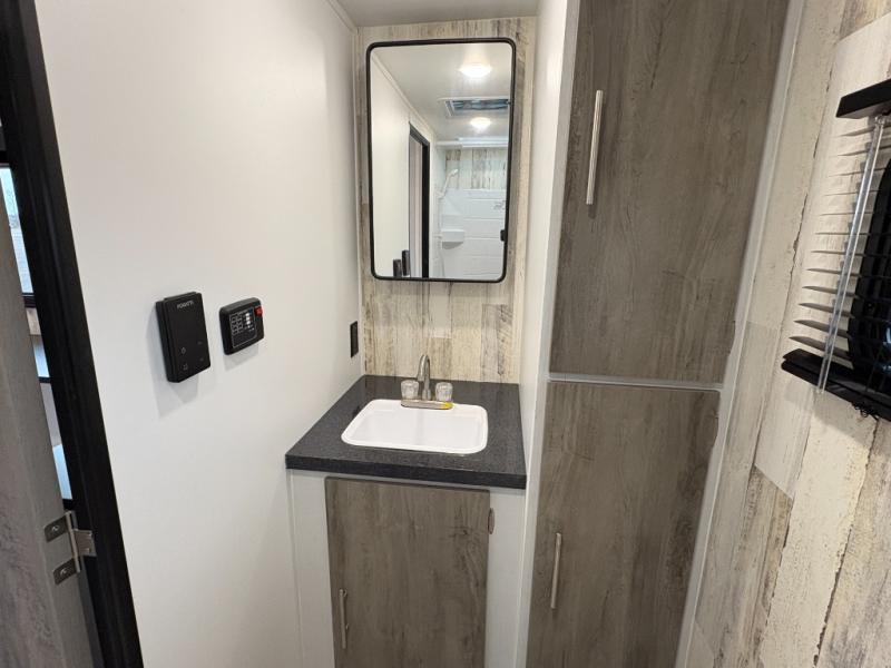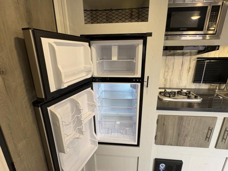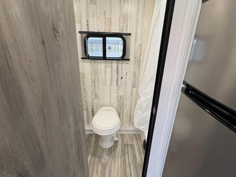 Whether you're looking for a permanent residence, a vacation home, or a weekend getaway, this travel trailer is the perfect choice. Inside, you'll find a spacious rear bathroom, complete with a 24” x 36” shower, closet, and medicine cabinet for all your storage needs—the perfect place to freshen up and feel at home. The kitchen is very complete, featuring a refrigerator, a two-burner cooktop, and a bar top with stools for all your cooking and dining needs. Whether you're cooking up a storm or simply enjoying a quiet breakfast, this kitchen has everything you need to make mealtime a breeze. You will find the perfect place to rest and recharge after a long day of adventure in the comfortable 60” x 80” bed with shirt closets on each side for all your storage needs.