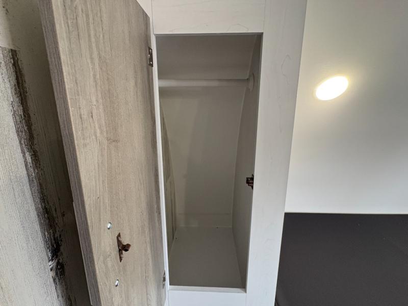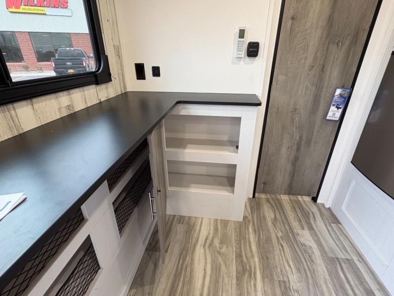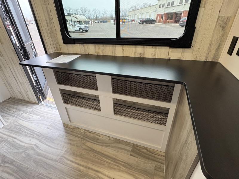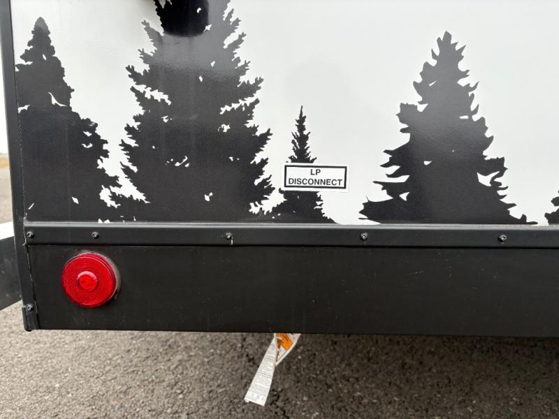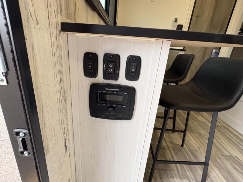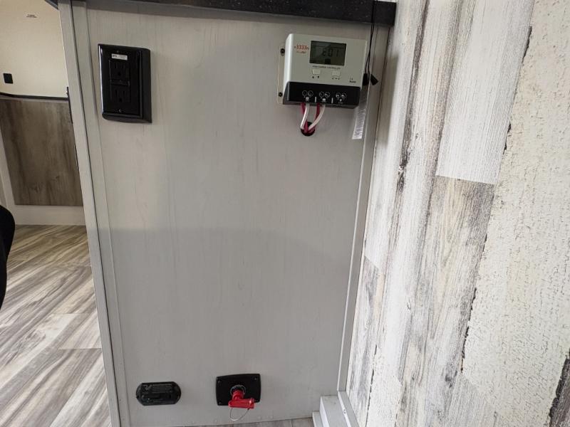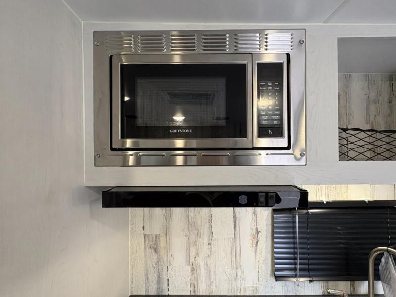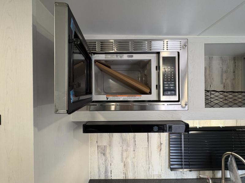 Whether you're looking for a permanent residence, a vacation home, or a weekend getaway, this travel trailer is the perfect choice. Inside, you'll find a spacious rear bathroom, complete with a 24” x 36” shower, closet, and medicine cabinet for all your storage needs—the perfect place to freshen up and feel at home. The kitchen is very complete, featuring a refrigerator, a two-burner cooktop, and a bar top with stools for all your cooking and dining needs. Whether you're cooking up a storm or simply enjoying a quiet breakfast, this kitchen has everything you need to make mealtime a breeze. You will find the perfect place to rest and recharge after a long day of adventure in the comfortable 60” x 80” bed with shirt closets on each side for all your storage needs.
