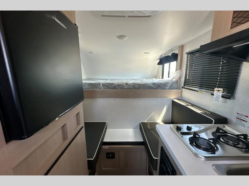 You'll love traveling the country with this cozy truck camper on your back! The front 48" x 75" bed provides a place to rest your head each night, and there are two bench seats for seating space during the day. A two burner cooktop will let you cook meals, and the 12V refrigerator will be perfect to keep cold items fresh. This unit also includes a pantry for paper goods and snacks, and the shower on board is sure to come in handy!
