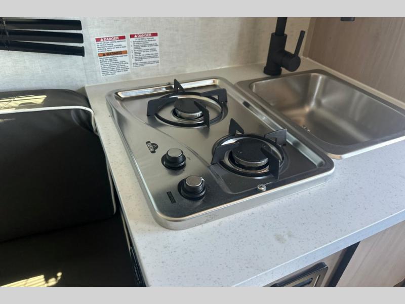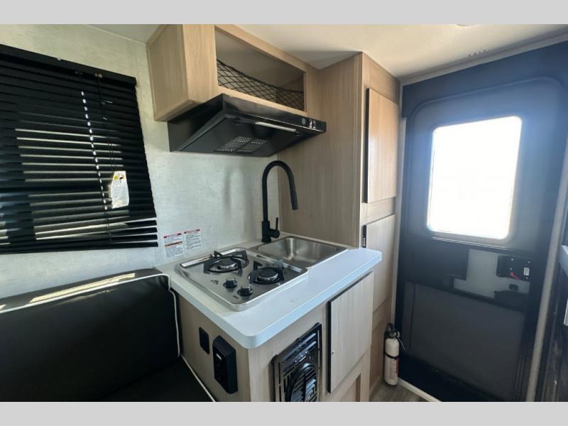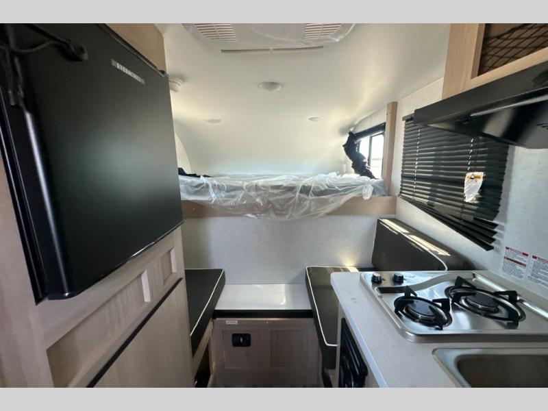 You'll love traveling the country with this cozy truck camper on your back! The front 48" x 75" bed provides a place to rest your head each night, and there are two bench seats for seating space during the day. A two burner cooktop will let you cook meals, and the 12V refrigerator will be perfect to keep cold items fresh. This unit also includes a pantry for paper goods and snacks, and the shower on board is sure to come in handy!