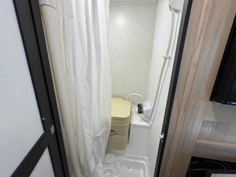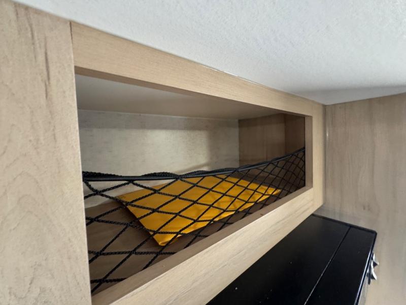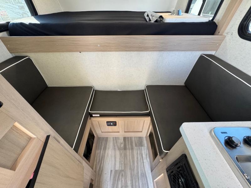 You'll love traveling the country with this cozy truck camper on your back! The front 48" x 75" bed provides a place to rest your head each night, and there are two bench seats for seating space during the day. A two burner cooktop will let you cook meals, and the 12V refrigerator will be perfect to keep cold items fresh. This unit also includes a pantry for paper goods and snacks, and the shower on board is sure to come in handy!