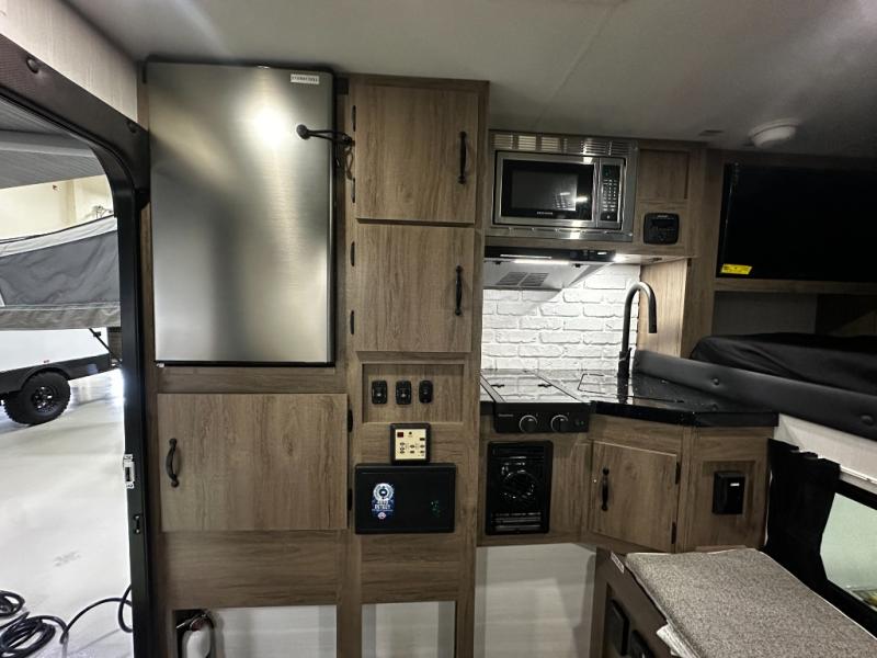 The Up Country by Travel Lite is a sturdy yet lightweight truck camper that can go deep into the woods. The wood-free construction includes a Hydro-Lite exterior, aluminum trussed roof, and laminated floors. A monitor panel allows you to keep an eye on the systems, and there's prep for a backup camera as well. A 20K BTU furnace extends the camping season into the cooler months, and you can add an optional 15K BTU roof mount air conditioner for the hot summer too! No matter the weather, you'll enjoy the stereo with indoor and outdoor speakers.