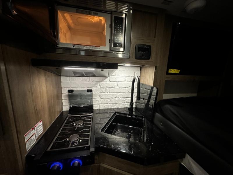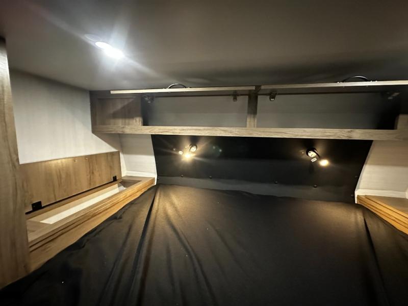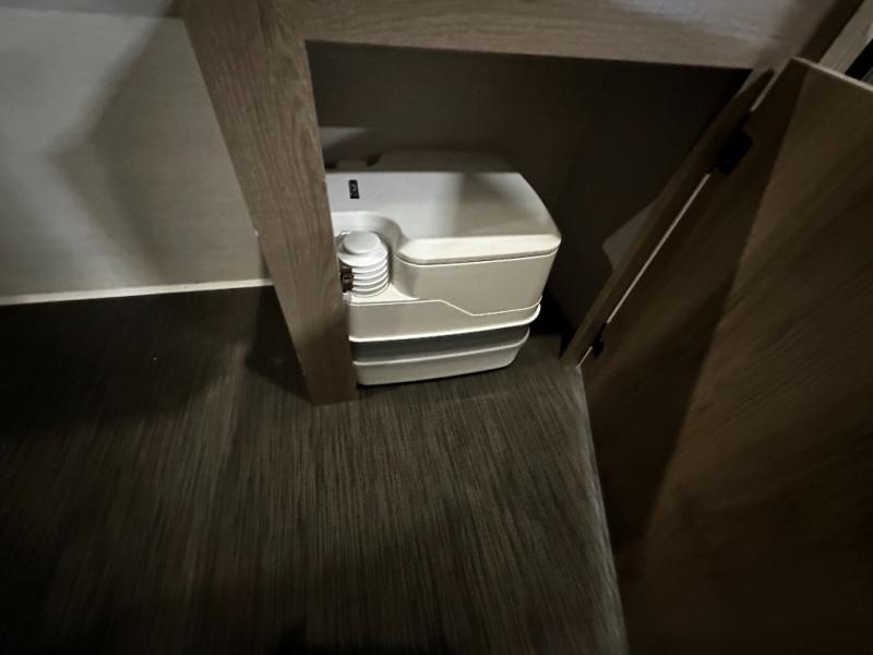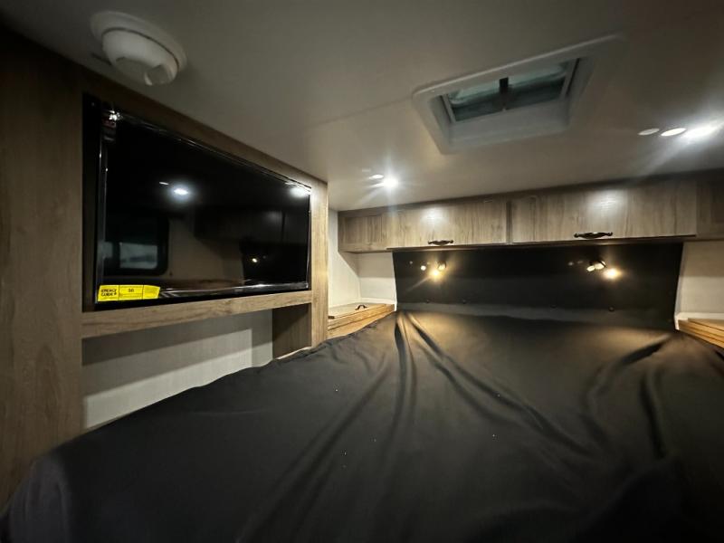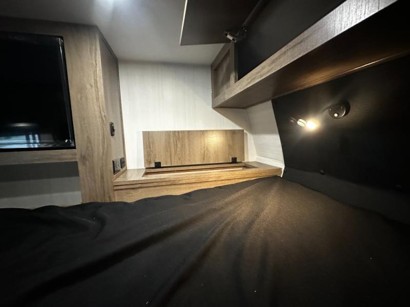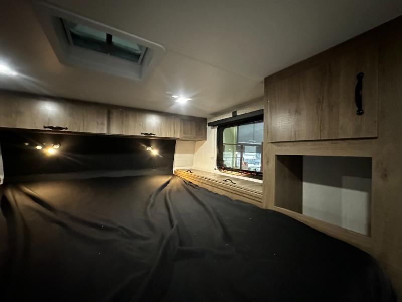 You'll love this cozy truck camper which is packed with amenities! An RV queen bed with a skylight above offers a relaxing place to sleep, and there's storage on all sides including a pair of nightstands with drawers. One storage unit has room to add an optional TV. The kitchen area offers a 72" U-shape dinette which can also be used for additional sleeping space if needed. The kitchen has a two-burner stainless steel stove, 12V refrigerator, and microwave for all your cooking needs, plus a sink with a high-rise faucet so you can clean up easily. A multi-shelf pantry and overhead console provide more storage space. There's even room to add an optional porta potty in a cabinet beneath the dinette bench.