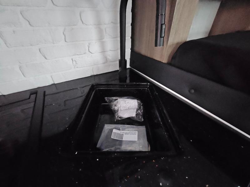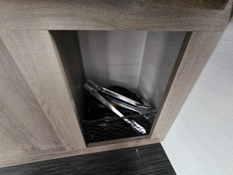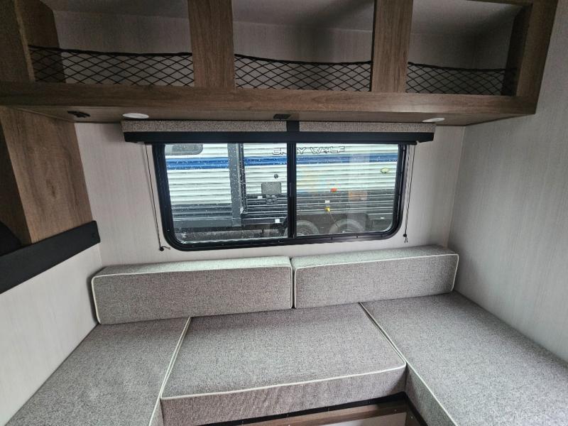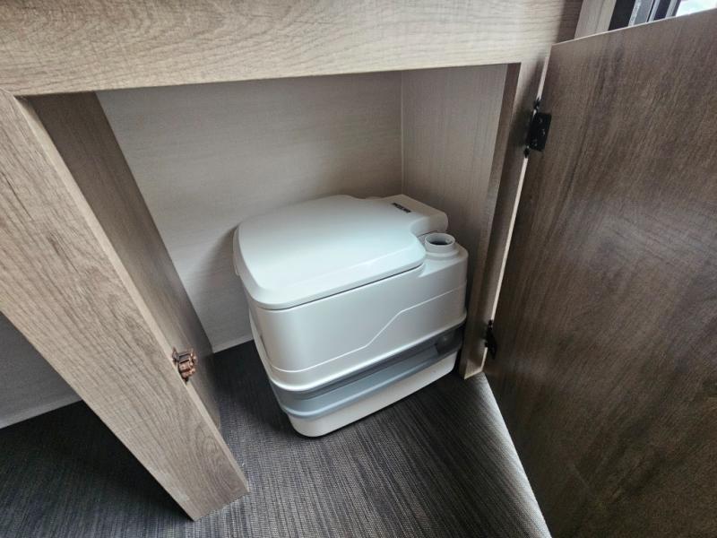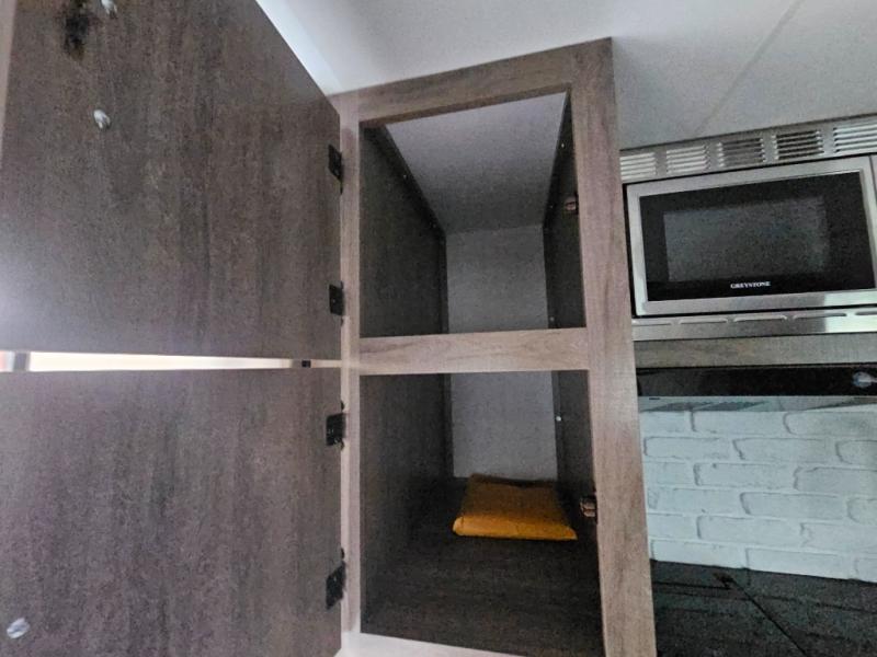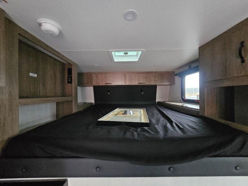 You'll love this cozy truck camper which is packed with amenities! An RV queen bed with a skylight above offers a relaxing place to sleep, and there's storage on all sides including a pair of nightstands with drawers. One storage unit has room to add an optional TV. The kitchen area offers a 72" U-shape dinette which can also be used for additional sleeping space if needed. The kitchen has a two-burner stainless steel stove, 12V refrigerator, and microwave for all your cooking needs, plus a sink with a high-rise faucet so you can clean up easily. A multi-shelf pantry and overhead console provide more storage space. There's even room to add an optional porta potty in a cabinet beneath the dinette bench.
