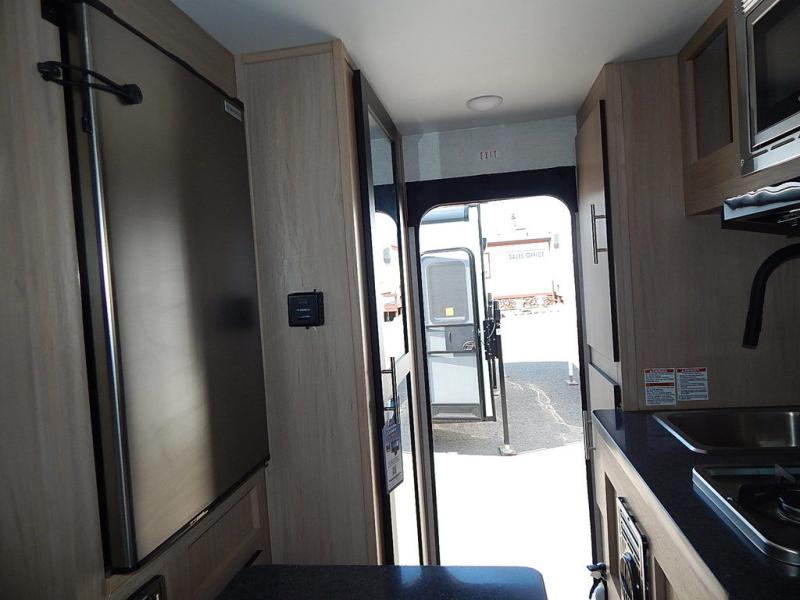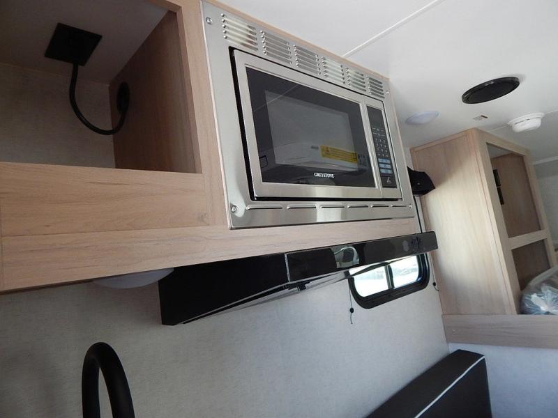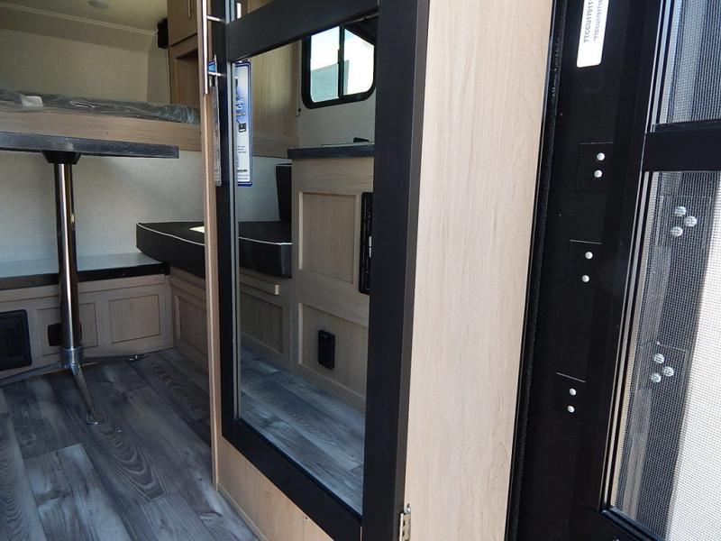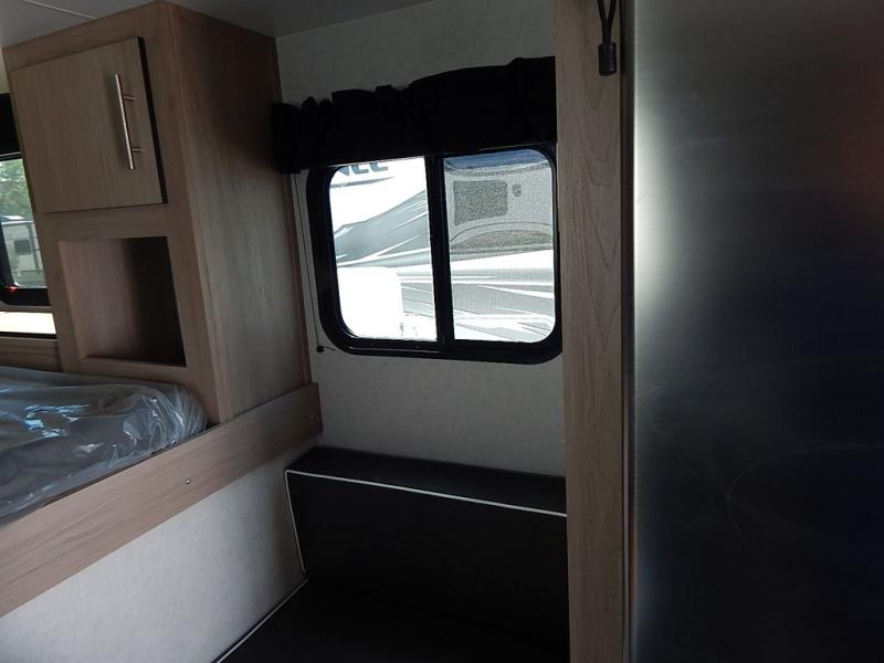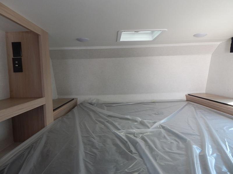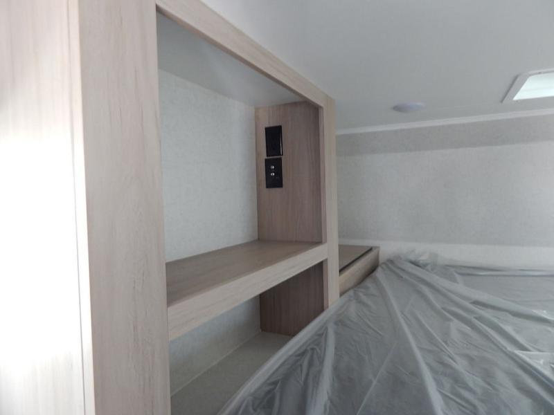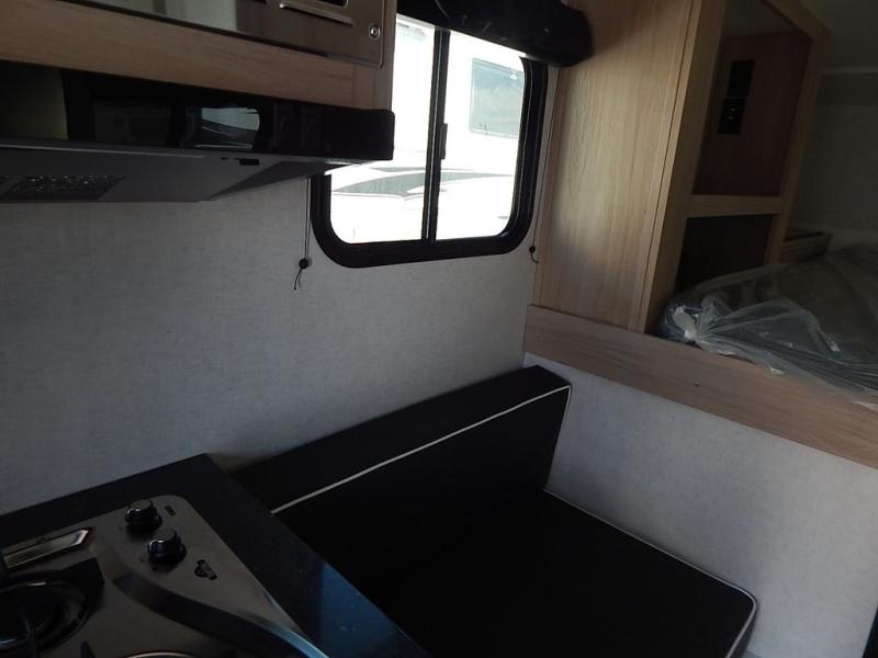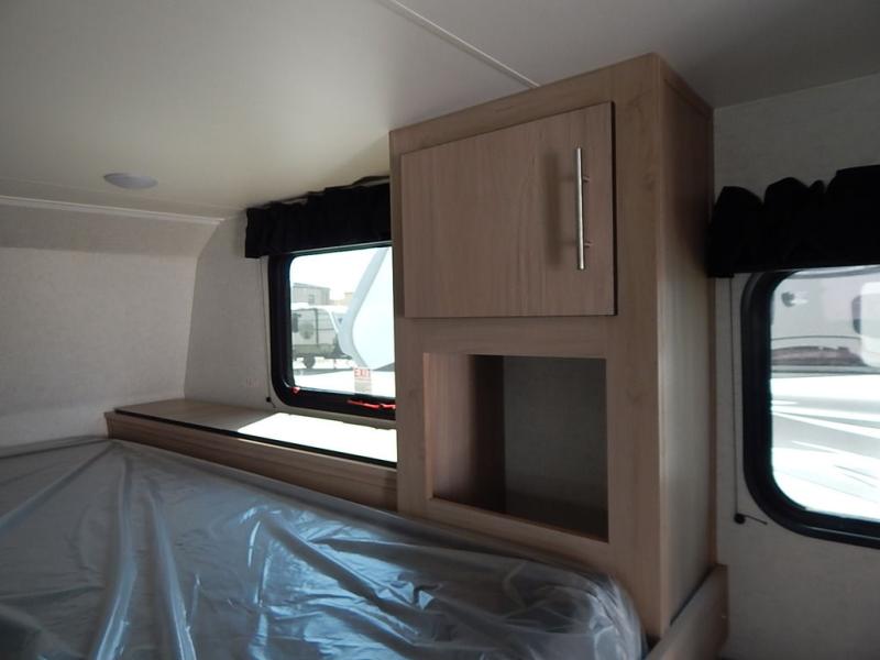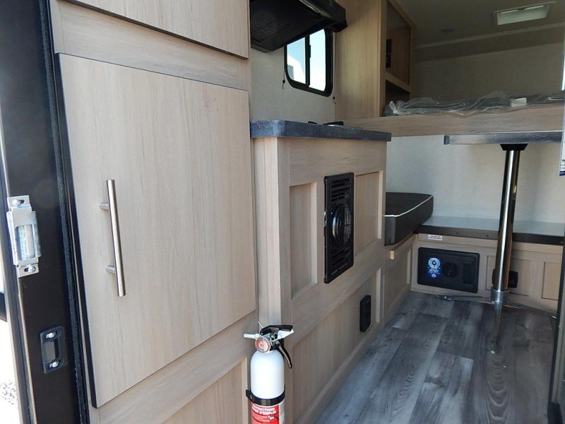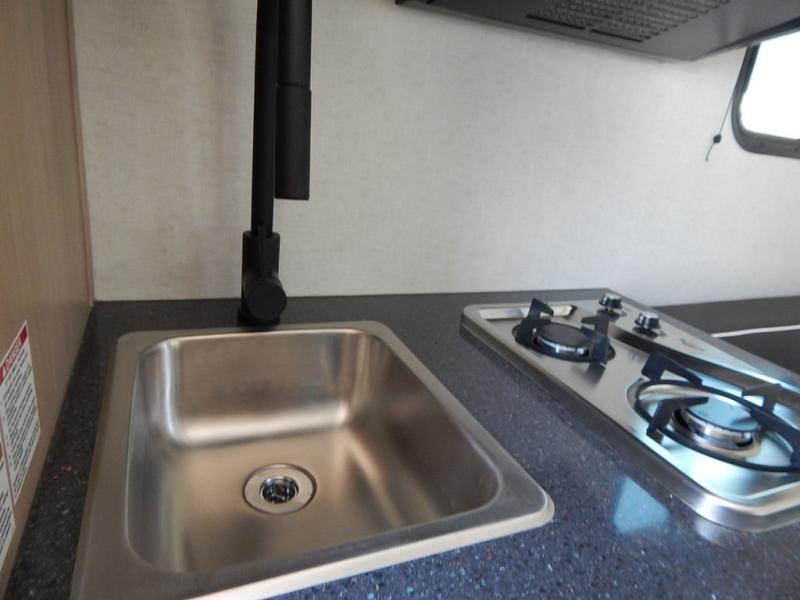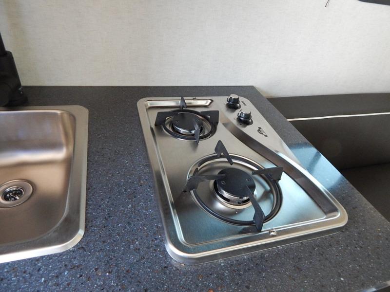 The Up Country 775 has everything you will need to get away! A cozy sleeping space features a roomy bed. Tuck your things away in the storage areas including dual footlockers with integrated USB ports so you can charge your electronics while you snooze. A shelving unit also has room for an optional TV. The kitchen has a dinette which can be converted for additional sleeping space as needed. Enjoy meals cooked on your two-burner stainless steel stove, and clean up in the sink with high rise faucet. A 12V refrigerator keeps your food fresh and cold. As if that's not enough, there's even a bathroom with a 23" x 32" shower!