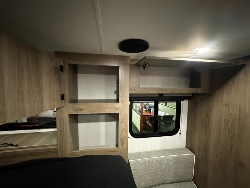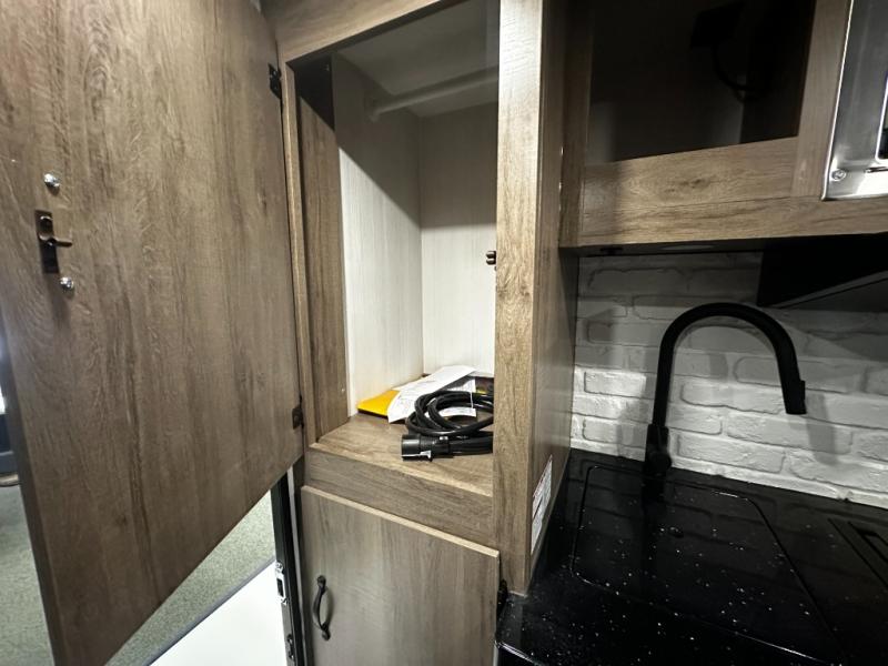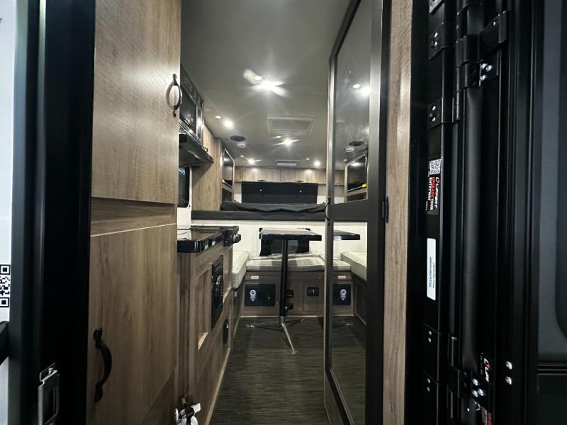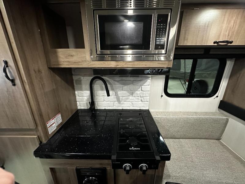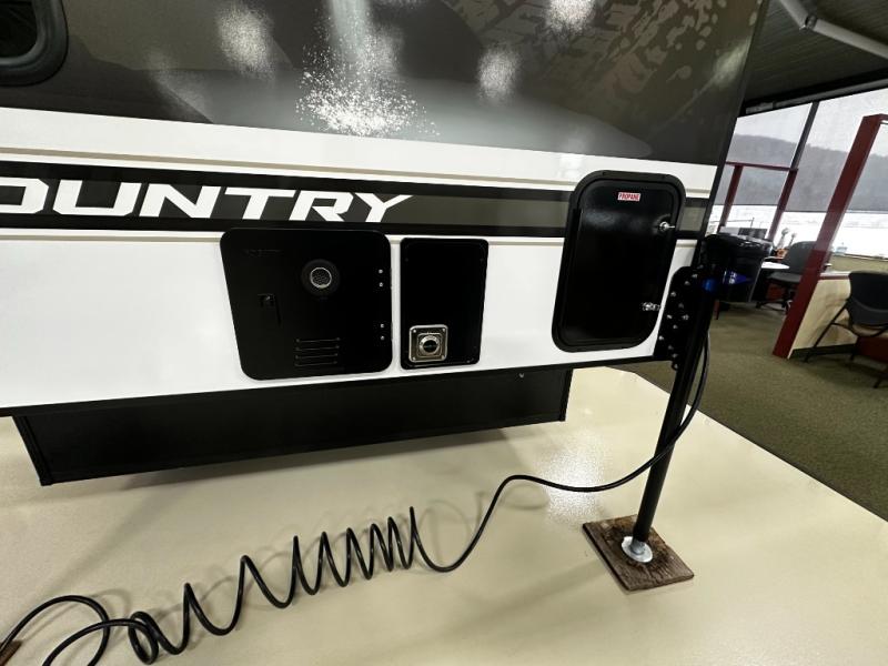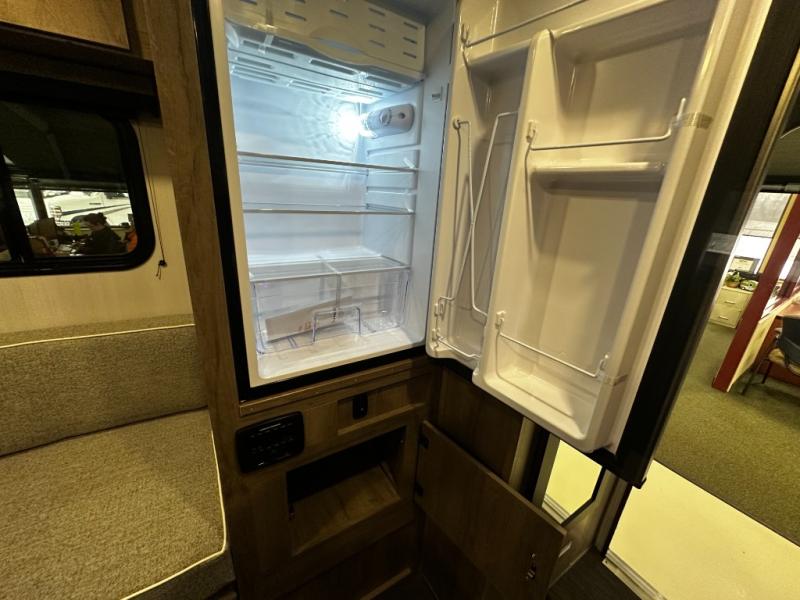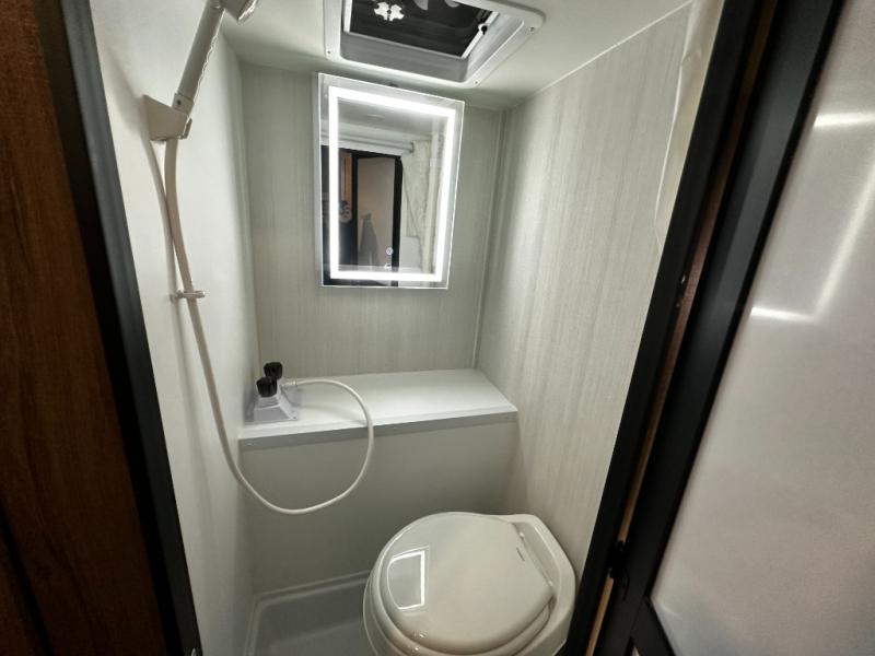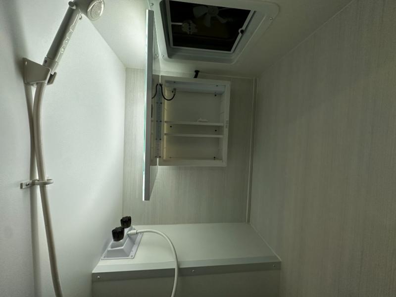 The Up Country 775 has everything you will need to get away! A cozy sleeping space features a roomy bed. Tuck your things away in the storage areas including dual footlockers with integrated USB ports so you can charge your electronics while you snooze. A shelving unit also has room for an optional TV. The kitchen has a dinette which can be converted for additional sleeping space as needed. Enjoy meals cooked on your two-burner stainless steel stove, and clean up in the sink with high rise faucet. A 12V refrigerator keeps your food fresh and cold. As if that's not enough, there's even a bathroom with a 23" x 32" shower!