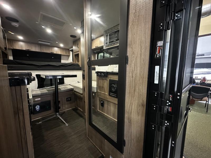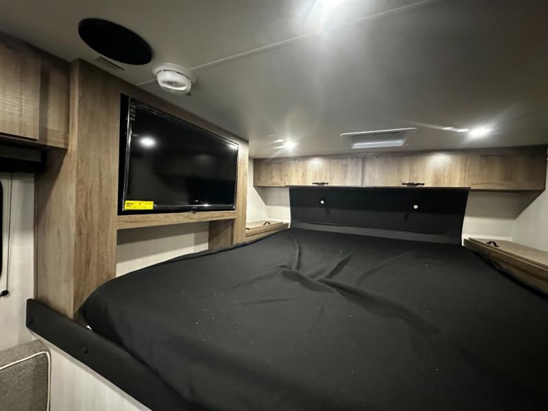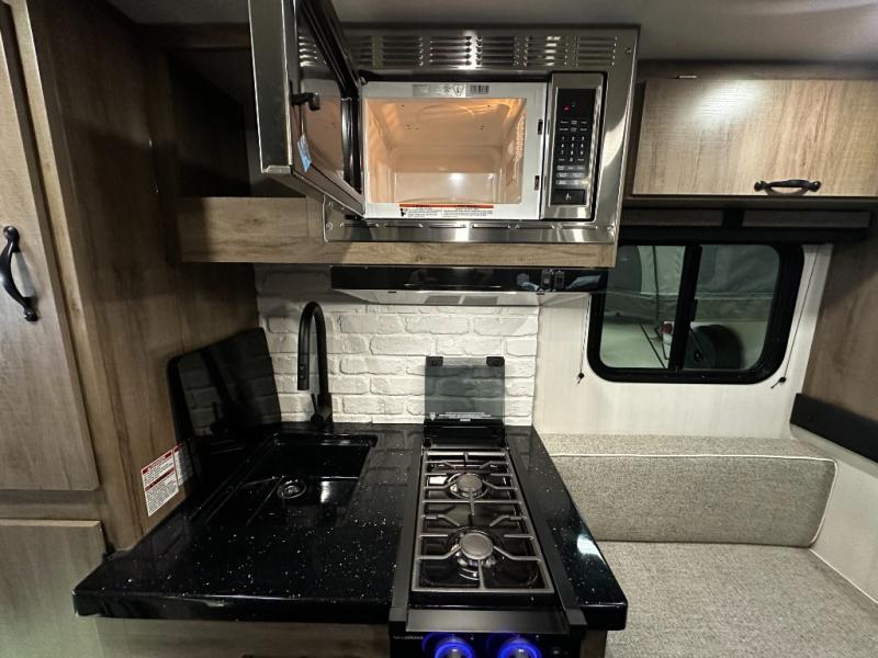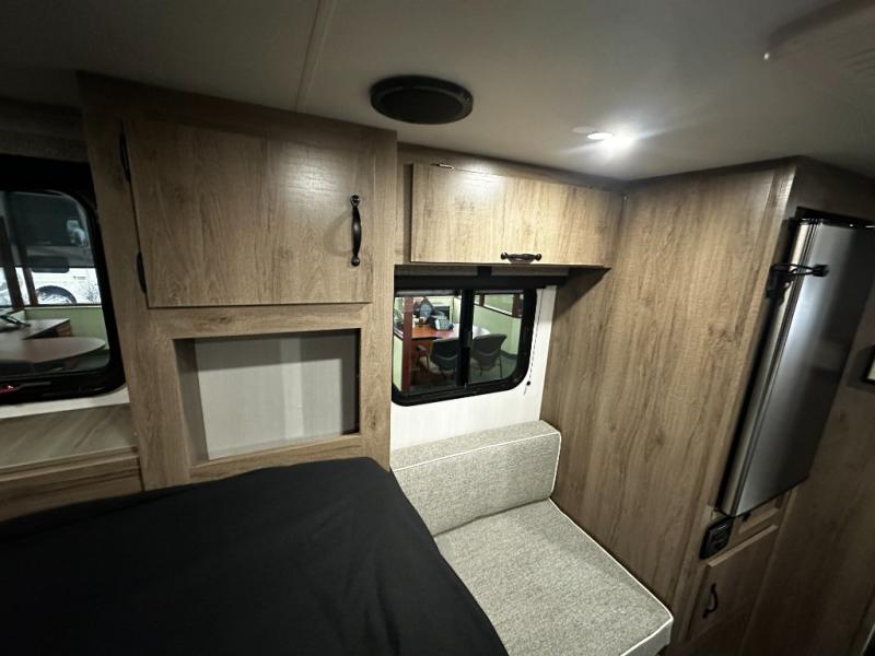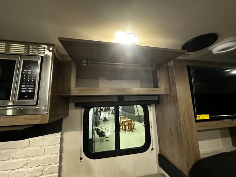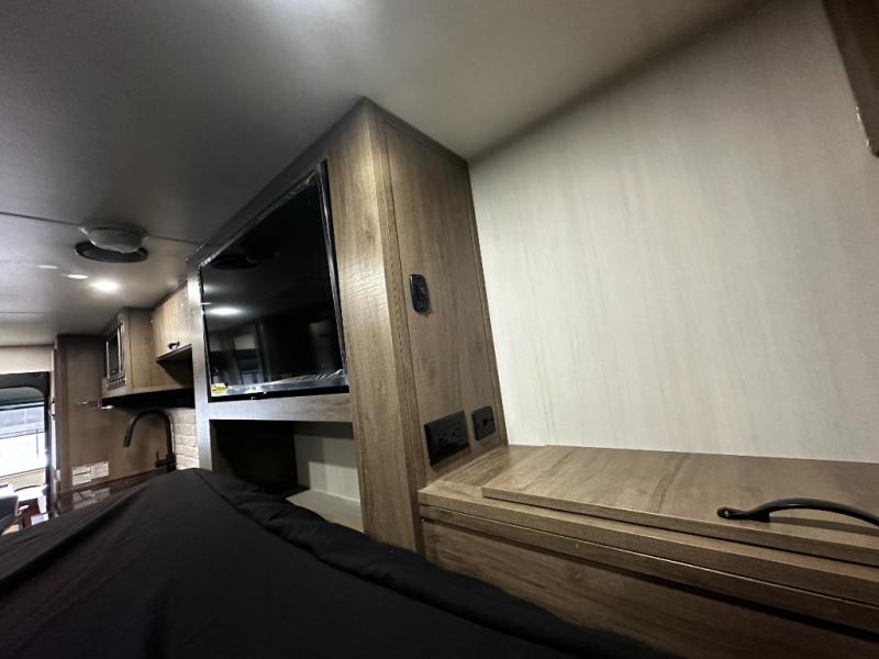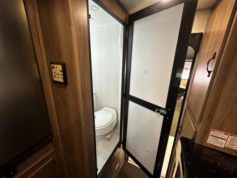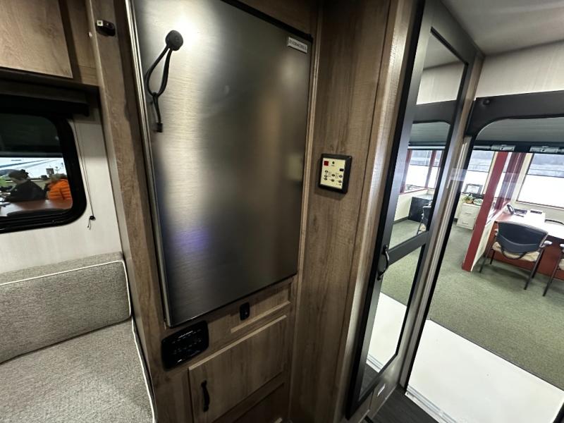 The Up Country 775 has everything you will need to get away! A cozy sleeping space features a roomy bed. Tuck your things away in the storage areas including dual footlockers with integrated USB ports so you can charge your electronics while you snooze. A shelving unit also has room for an optional TV. The kitchen has a dinette which can be converted for additional sleeping space as needed. Enjoy meals cooked on your two-burner stainless steel stove, and clean up in the sink with high rise faucet. A 12V refrigerator keeps your food fresh and cold. As if that's not enough, there's even a bathroom with a 23" x 32" shower!