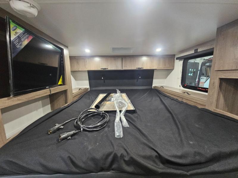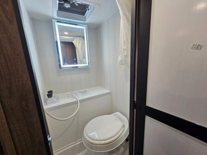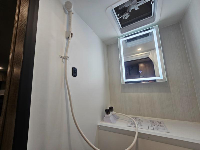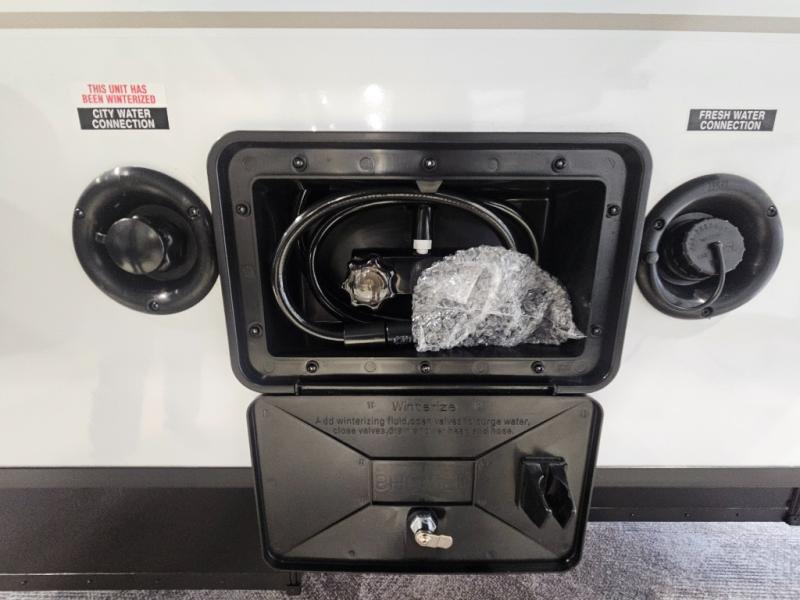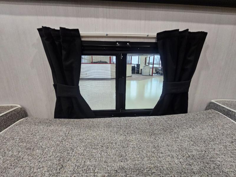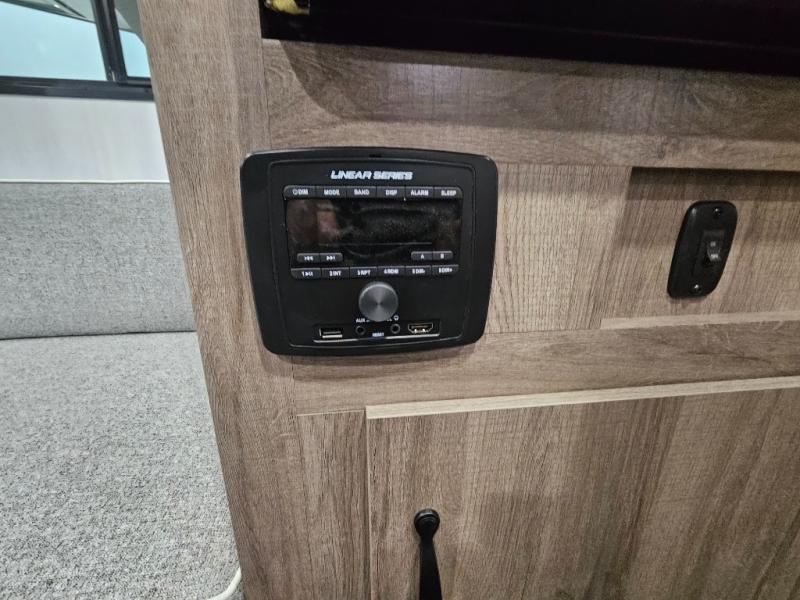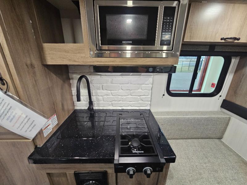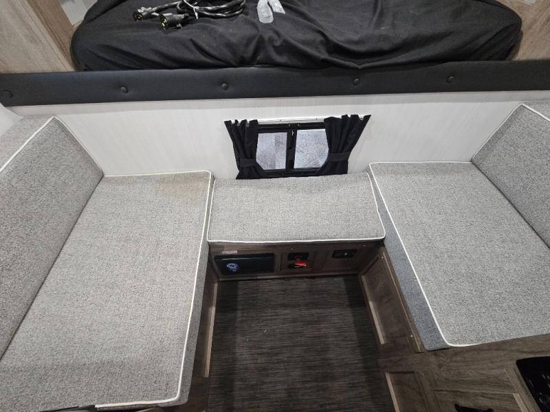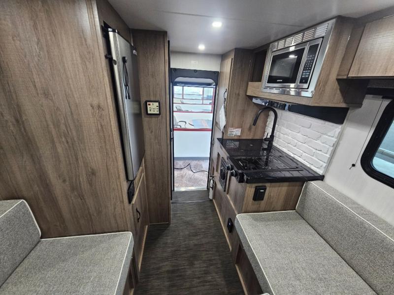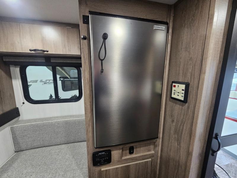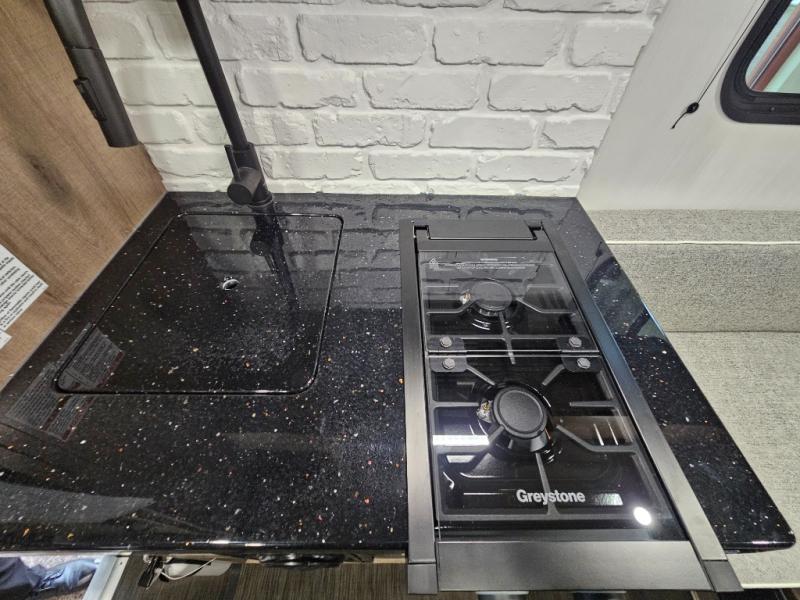 The Up Country 775 has everything you will need to get away! A cozy sleeping space features a roomy bed. Tuck your things away in the storage areas including dual footlockers with integrated USB ports so you can charge your electronics while you snooze. A shelving unit also has room for an optional TV. The kitchen has a dinette which can be converted for additional sleeping space as needed. Enjoy meals cooked on your two-burner stainless steel stove, and clean up in the sink with high rise faucet. A 12V refrigerator keeps your food fresh and cold. As if that's not enough, there's even a bathroom with a 23" x 32" shower!