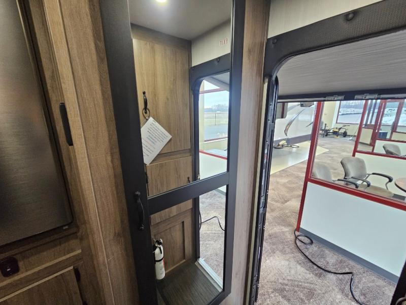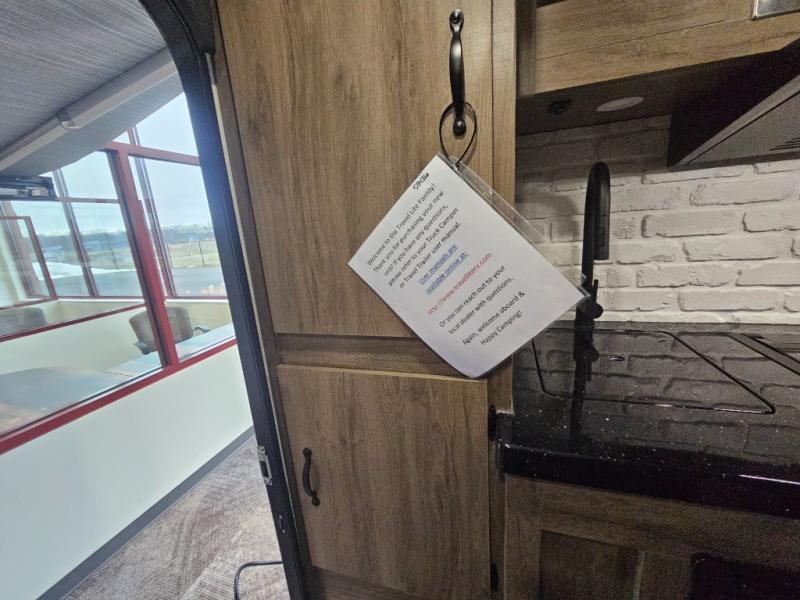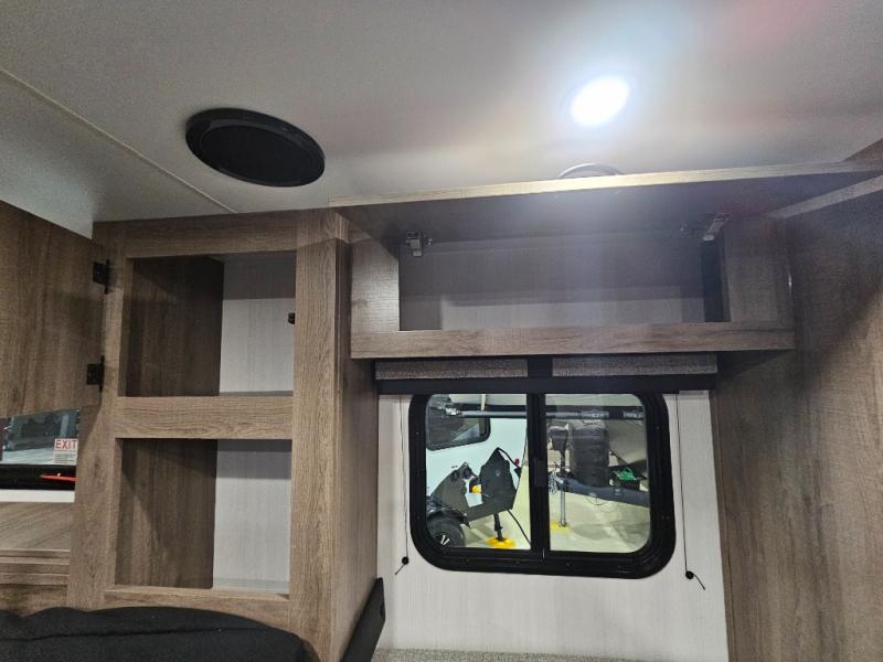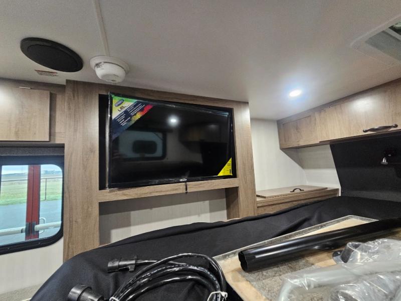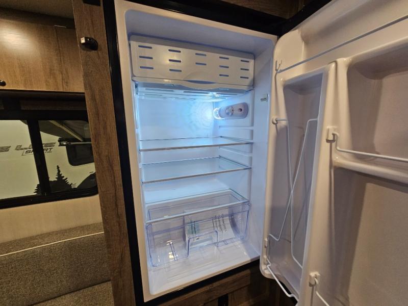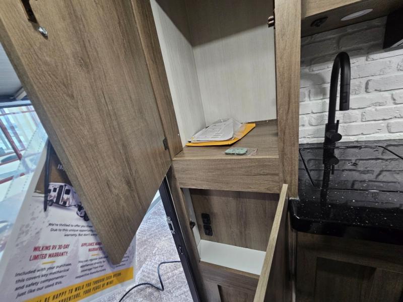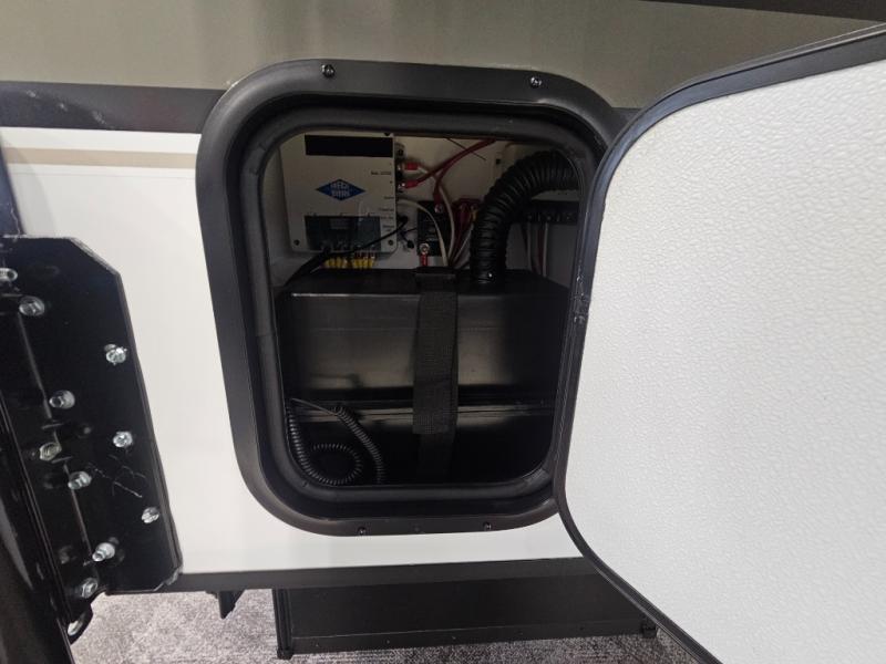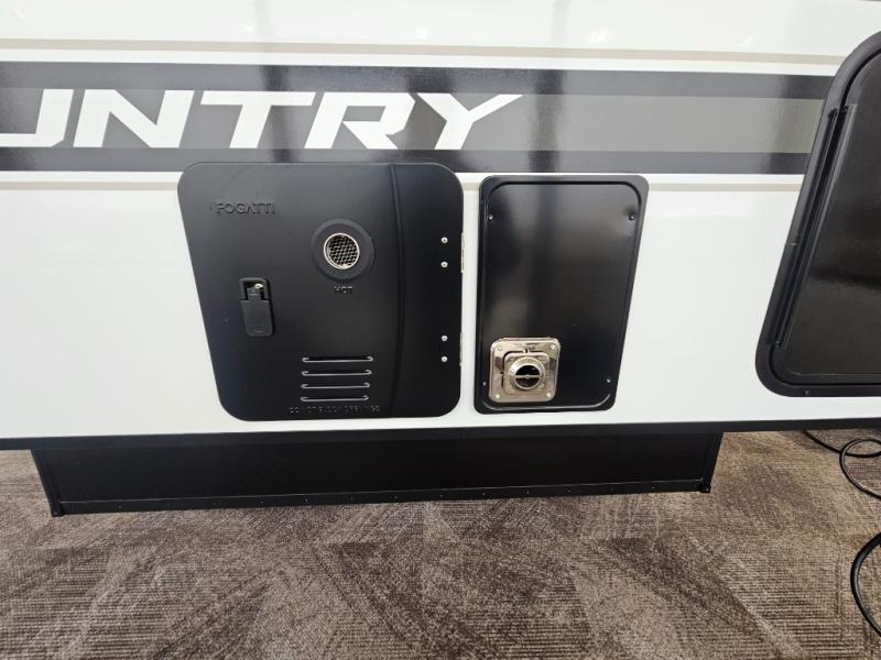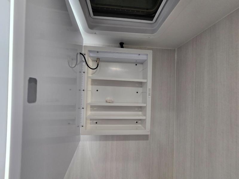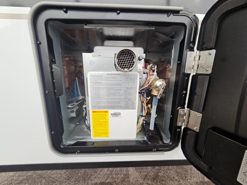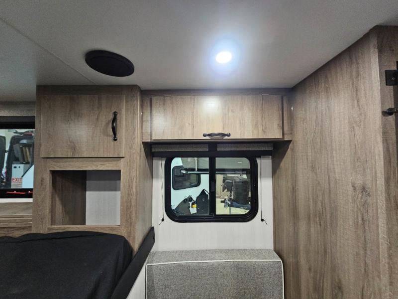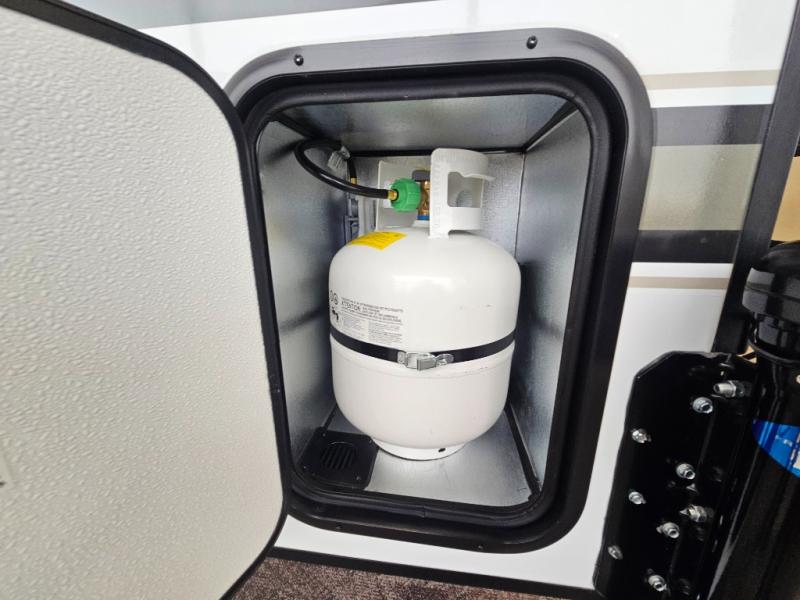 The Up Country 775 has everything you will need to get away! A cozy sleeping space features a roomy bed. Tuck your things away in the storage areas including dual footlockers with integrated USB ports so you can charge your electronics while you snooze. A shelving unit also has room for an optional TV. The kitchen has a dinette which can be converted for additional sleeping space as needed. Enjoy meals cooked on your two-burner stainless steel stove, and clean up in the sink with high rise faucet. A 12V refrigerator keeps your food fresh and cold. As if that's not enough, there's even a bathroom with a 23" x 32" shower!