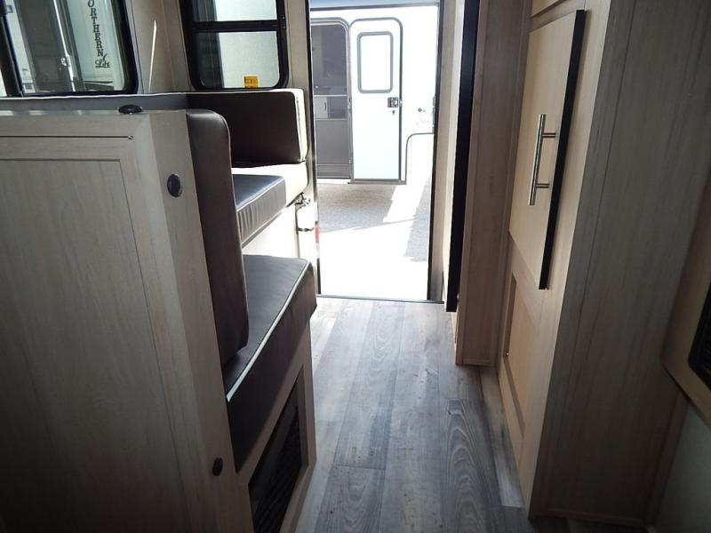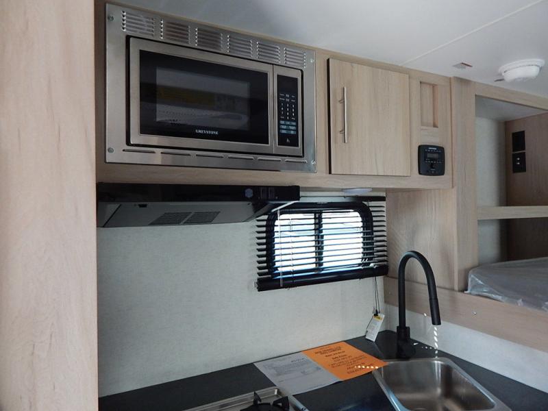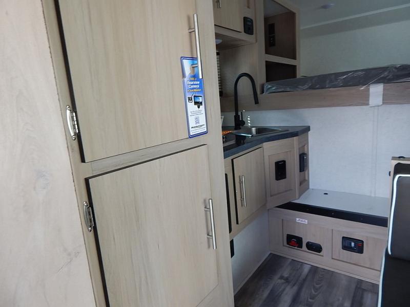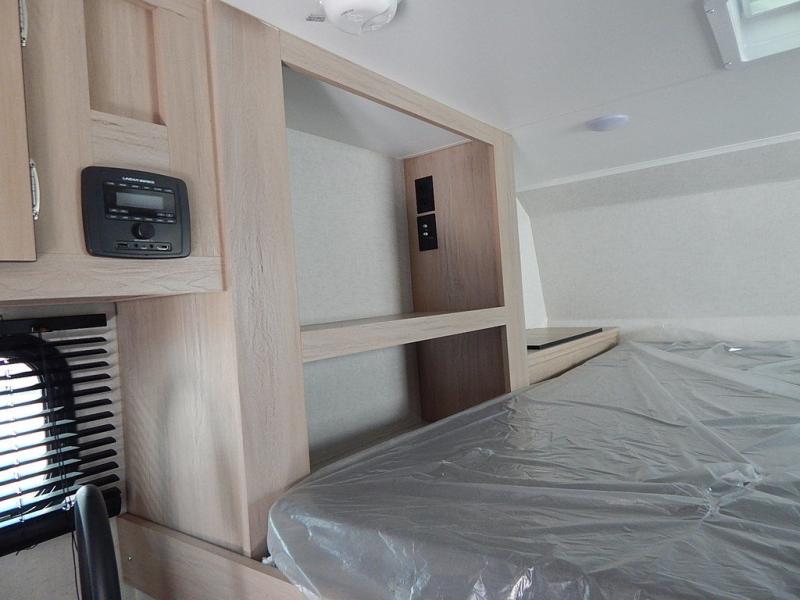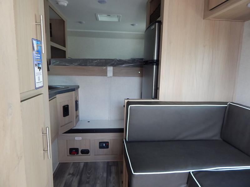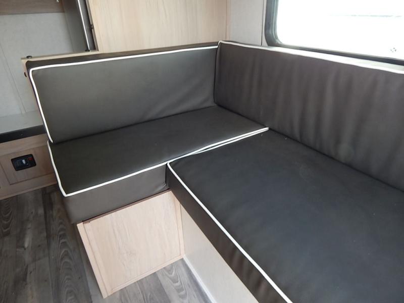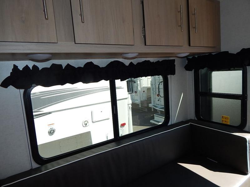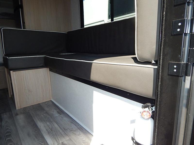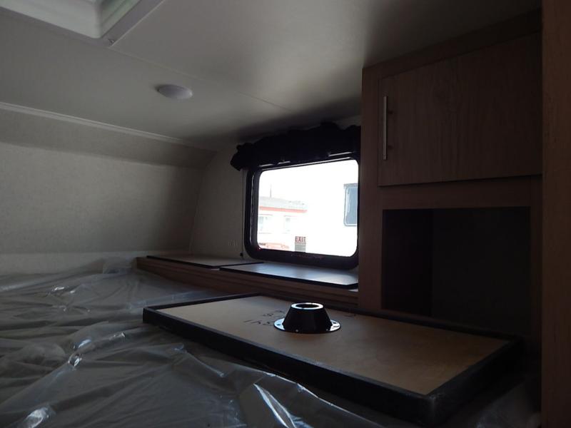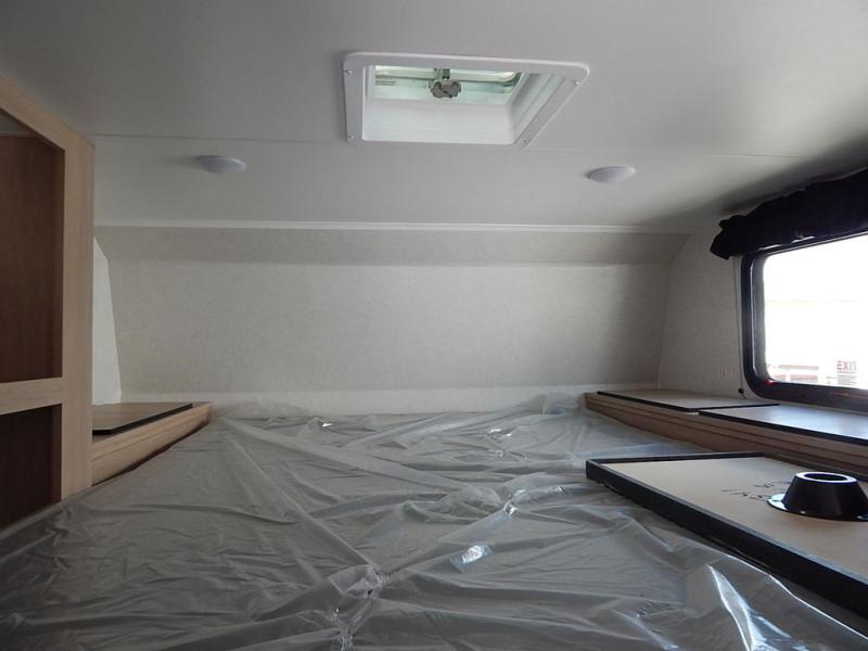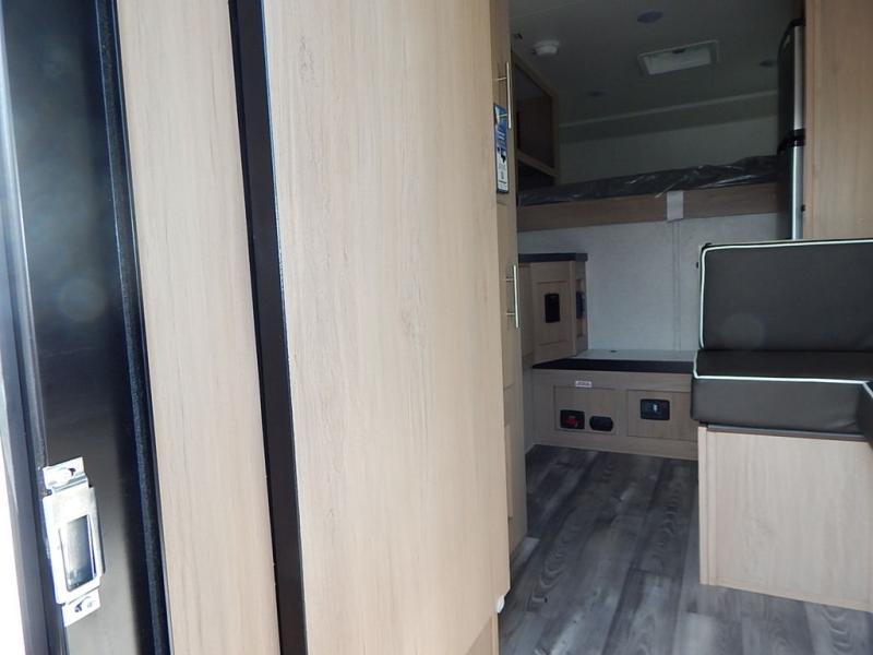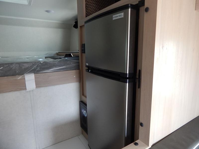 This truck camper has everything you need while you're away from home! There is a queen-size bed up front with footlockers with USB ports and additional storage for your belongings. And the sofa with a bunk above will provide additional sleeping space for guests. You can prepare meals on the two burner stainless steel stove or in the stainless steel microwave, and the 12V refrigerator will be perfect for cold items. There is also a wardrobe/pantry that can be used for storage. This model includes a convenient wet bath with a sliding door, so you won't even have to use the camp's facilities when you stop for the night!
