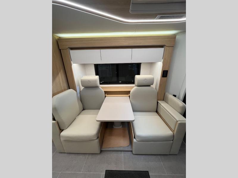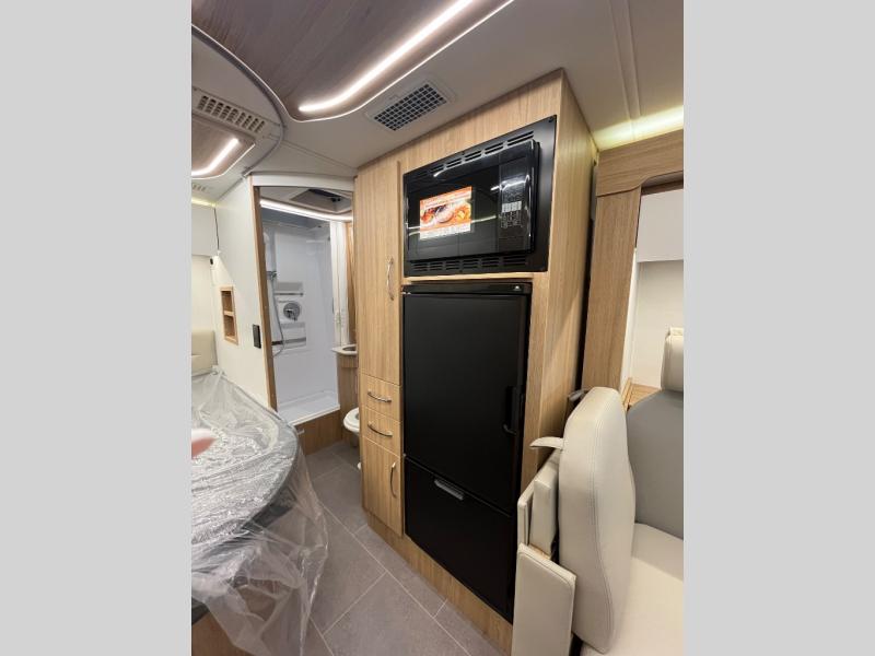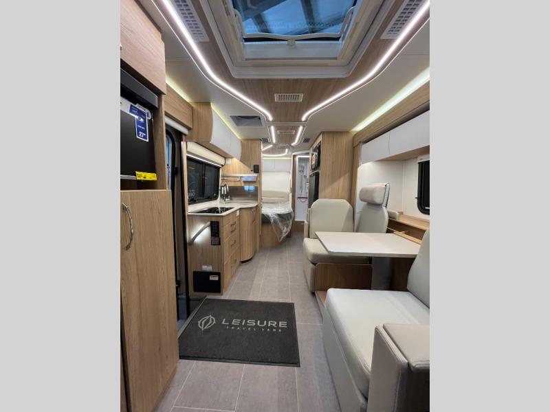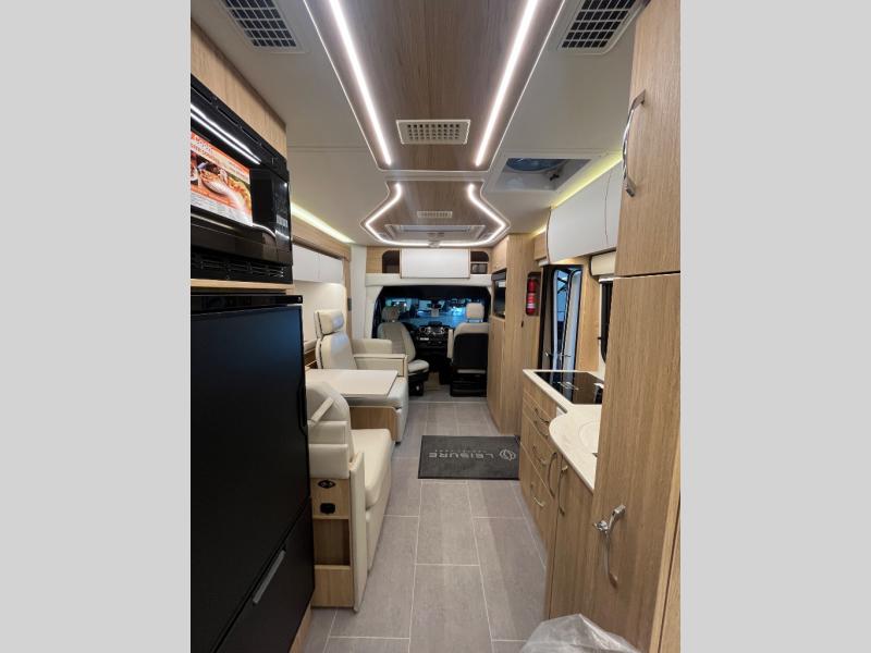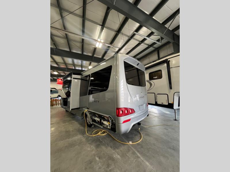 Each Unity Class C motorhome by Leisure Travel sits on a durable Mercedes-Benz Sprinter 3500 dual rear wheel chassis with a 2.0-L Turbocharged engine to power your adventures. The powder coated steel undercarriage support structure and vacuum-bonded construction provide a coach that will last for years, and there are eight sleek exterior paint options to make the coach your own. You'll love driving the Unity with its electronic stability control, adaptive cruise control, 9-speed automatic transmission with quieter noise levels and more comfort. There is even a digital mirror with sharp high-resolution that can be switched between convectional display and digital display for convenience. The luxurious interior includes Ultraleather furniture, a contoured solid surface Corian countertop in the kitchen, new decor options, plus many more comforts. And all of your power need will be met with 270-Ah 12V Lithium coach batteries with an internal heating system, plus a 3000W pure sine inverter and a 30 Amp power cord. If you choose the optional 60th Anniversary Edition, you will enjoy the Diamond White exterior paint, diamond-quilted upholstery, Cool Ice Ultrafabrics, matte black hardware, and more elegant features that are exclusive to this package!
