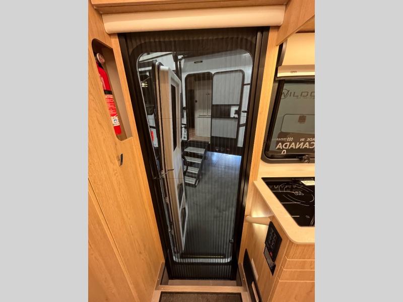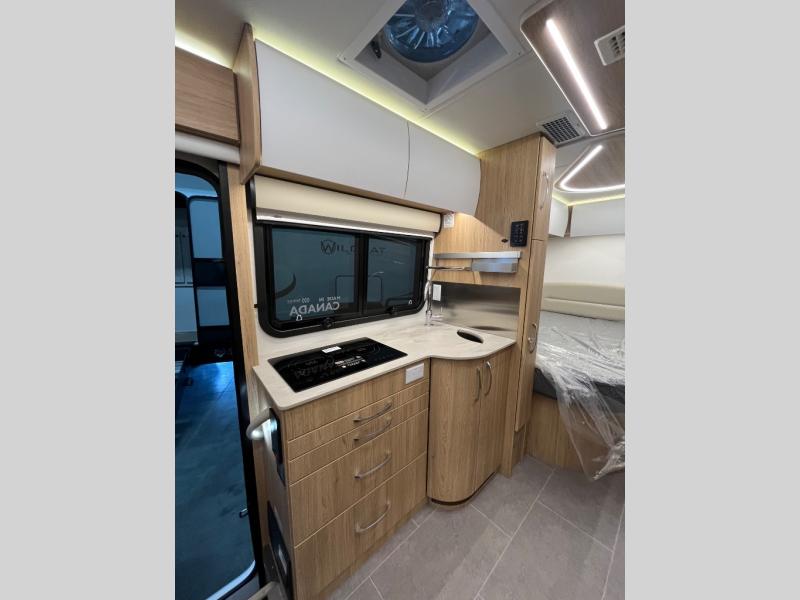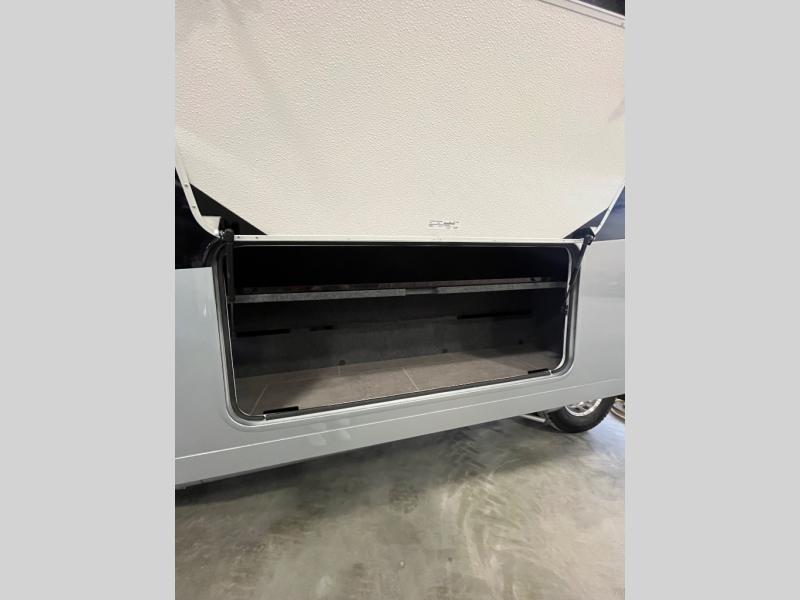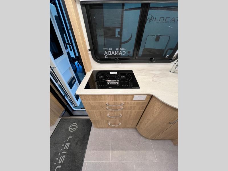 You can sleep four comfortably in this coach thanks to the 52" x 76" rear corner bed, and the dinette+, or you might want to choose the optional leisure lounge. The galley includes a stainless steel sink, a two burner cooktop, plus a pull-out panty and a 12V compressor refrigerator for food storage. The rear corner bath will allow you to stay clean throughout your many travels, and there is plenty of storage space for your essentials. You will also love the powered box awning with a wind sensor and LED lights for those late-night evenings outdoors with friends.