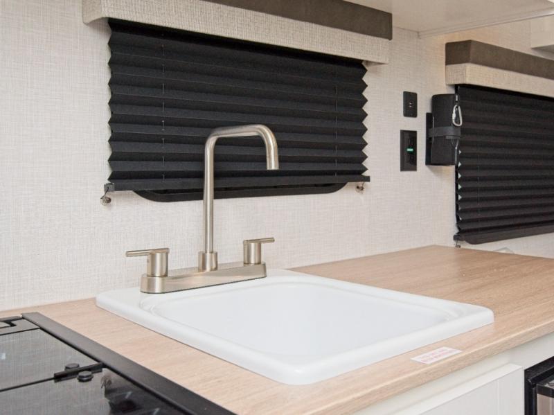 Functional Kitchen: Cook up hearty meals or quick snacks with the flush-mounted 2-burner cooktop, microwave oven, and efficient 12V refrigerator. Everything you need to stay fueled is right at your fingertips.