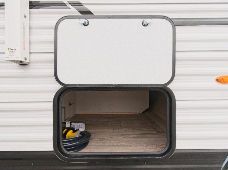 Convenience & Connectivity: A 9' power awning, exterior trunk door, leash latch with beverage opener, exterior speakers, solar prep, and backup camera prep make camping life easy and enjoyable. Key-alike doors simplify access for stress-free travel.