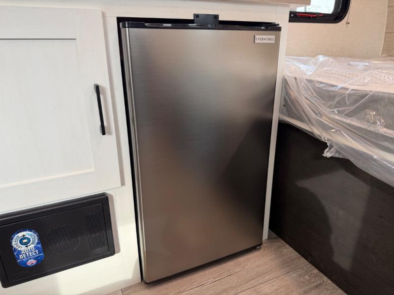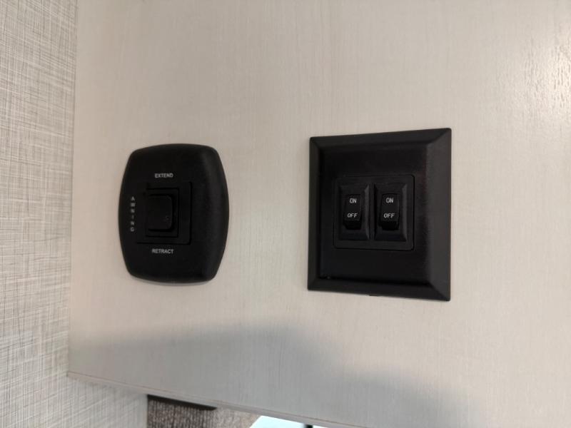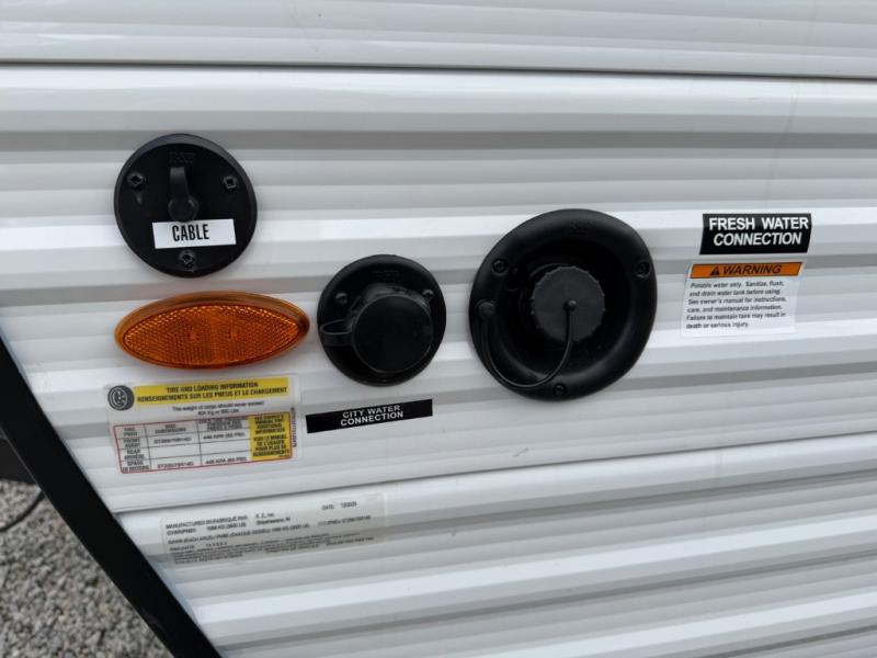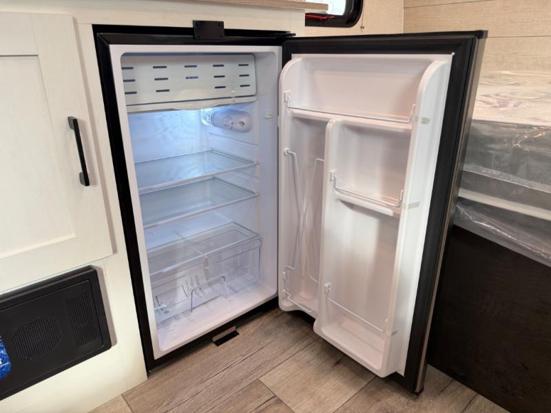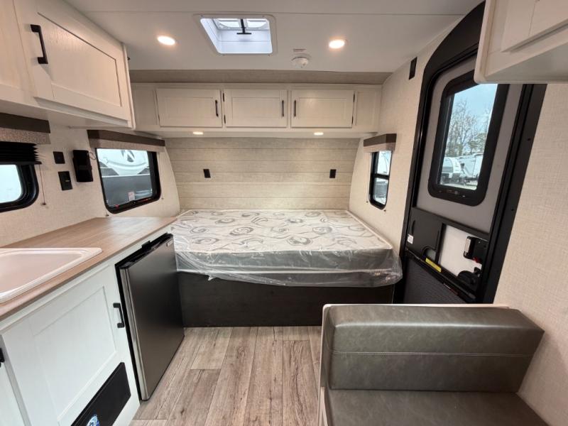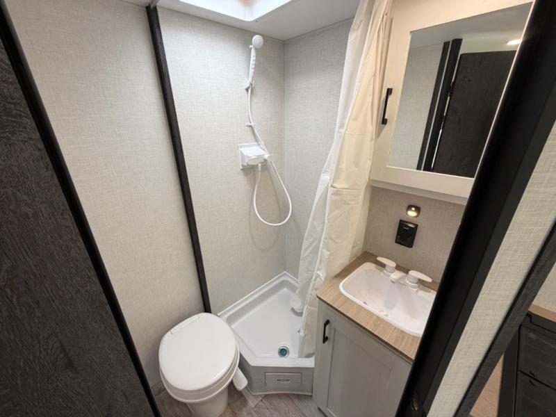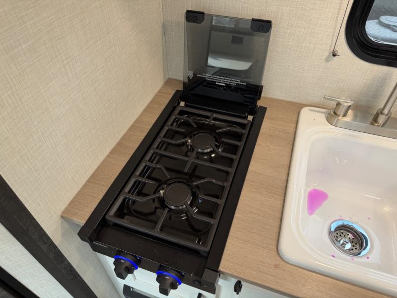 Escape to a cozy and functional space that's perfect for making memories with loved ones! The full bathroom has everything you need to get ready for the day or unwind after a big adventure, plus, you'll appreciate the closet for storing your clothes and essentials. The sit n’ slide table is perfect for sharing meals or enjoying a quiet morning, and the overhead cabinets provide ample storage for snacks and gear. You will be able to whip up delicious meals with the two-burner cooktop and sink, and keep drinks cold in the 12V refrigerator. At the front of the unit, the comfy bed is a great spot to rest and recharge, and the exterior awning provides a shaded area to relax
