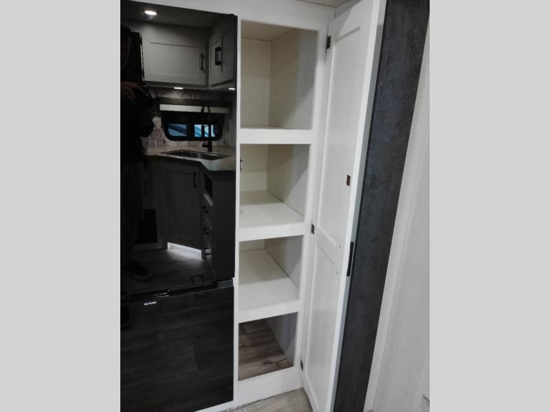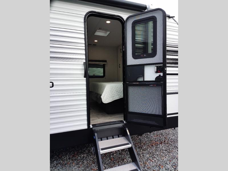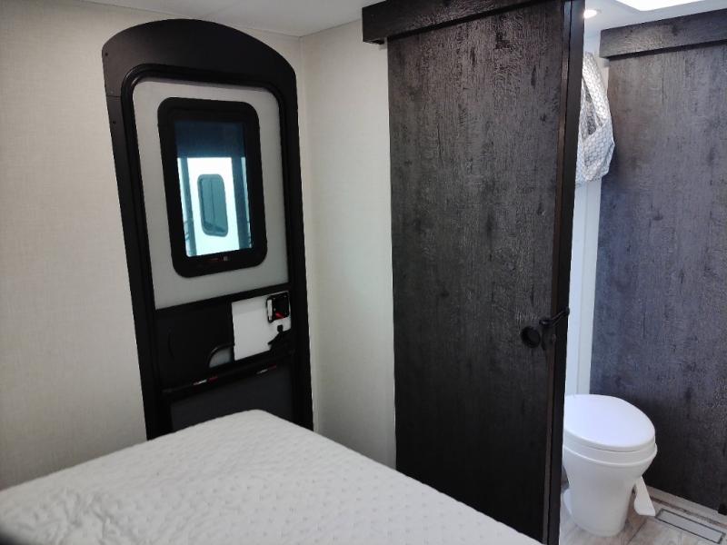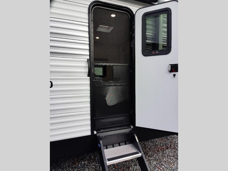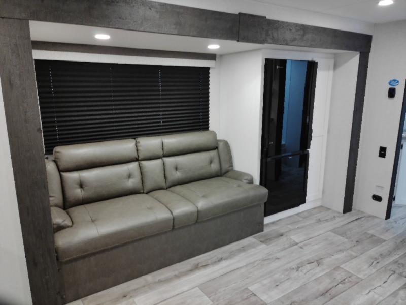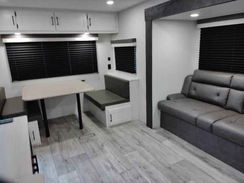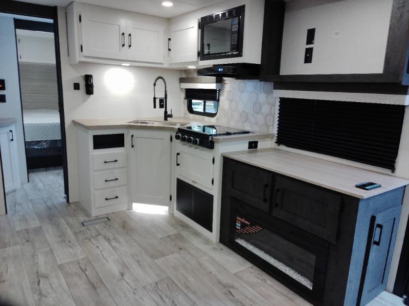 Unwind in a luxurious space that's perfect for creating unforgettable memories with loved ones. The inviting booth dinette is great for sharing meals or enjoying a quiet morning, while the plush sofa is perfect for lounging. Gather around the cozy fireplace on chilly evenings, or enjoy entertainment galore at the entertainment center. Whip up delicious meals with the powerful three-burner cooktop and handy sink, and keep snacks and drinks within reach in the refrigerator and pantry. Further, the walk-through bathroom is a refreshing haven to get ready in style and move freely, and the front bedroom's a peaceful retreat with a king bed, and you can stash your clothes and essentials in the overhead cabinets, wardrobes, and shelves. Plus, the double entry and exit doors make it easy to come and go.