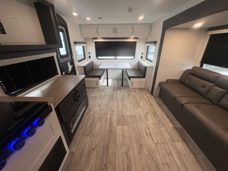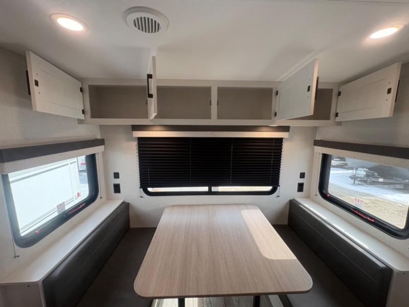 Inside, the Campbound 241CRD offers a bright, open living space with large windows that bring the outdoors in. The well-equipped kitchen provides ample counter space, modern appliances, and smart storage, making meal prep easy wherever your travels take you. A comfortable dining area creates a welcoming place to relax, plan your next destination, or enjoy time together after a day of adventure.