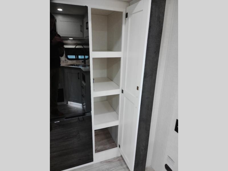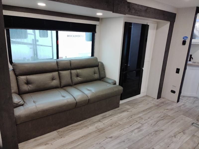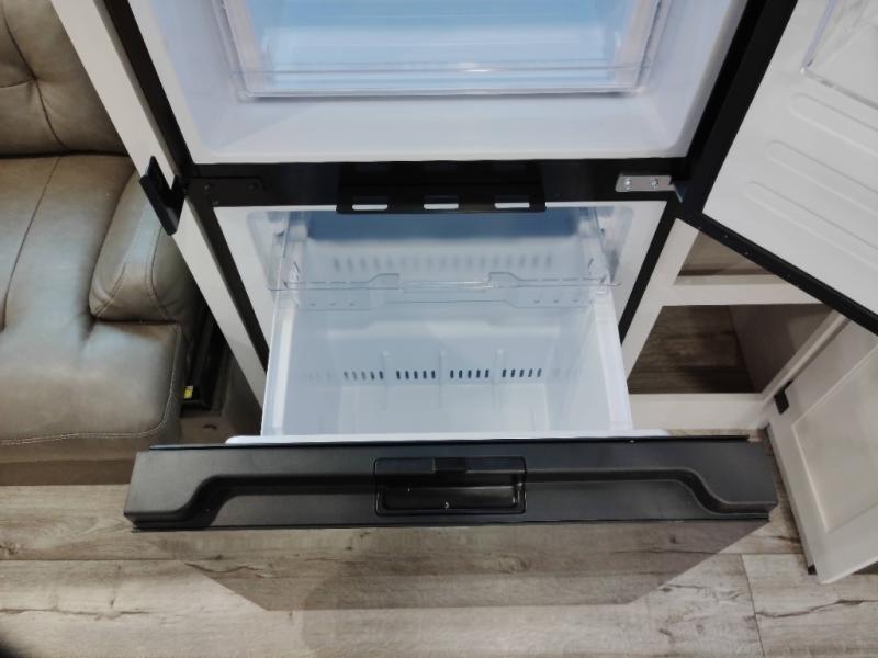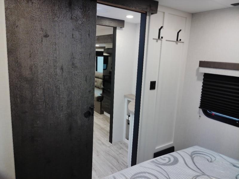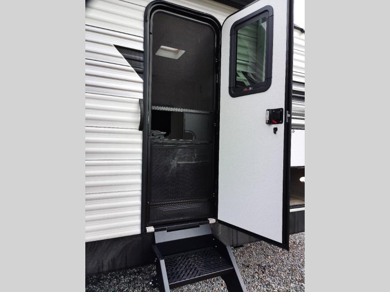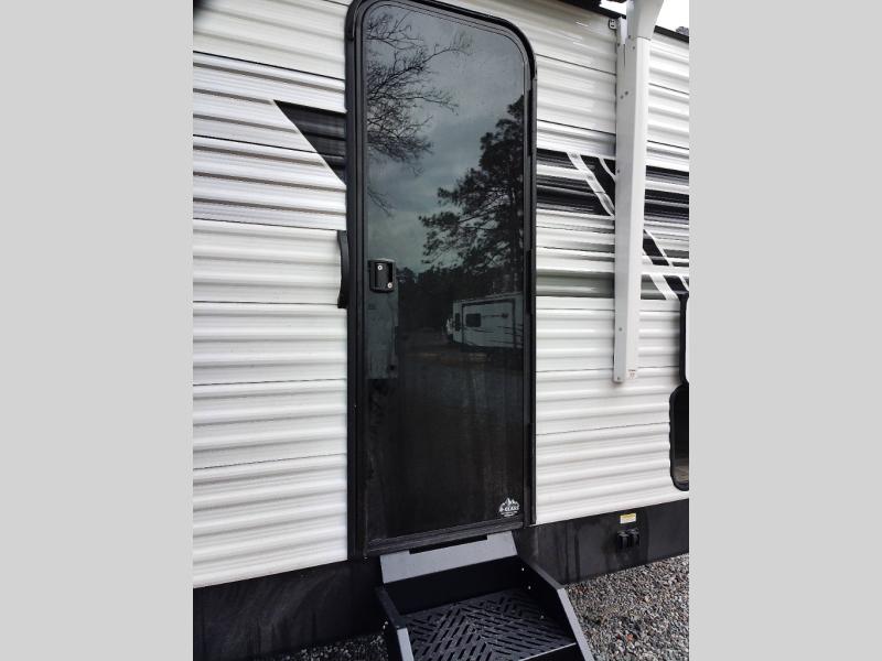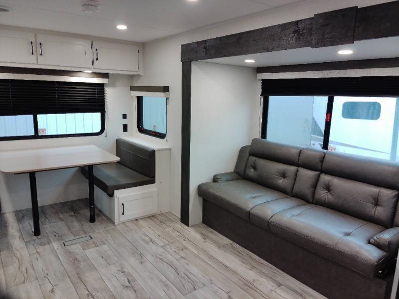 Unwind in a luxurious space that's perfect for creating unforgettable memories with loved ones. The inviting booth dinette is great for sharing meals or enjoying a quiet morning, while the plush sofa is perfect for lounging. Gather around the cozy fireplace on chilly evenings, or enjoy entertainment galore at the entertainment center. Whip up delicious meals with the powerful three-burner cooktop and handy sink, and keep snacks and drinks within reach in the refrigerator and pantry. Further, the walk-through bathroom is a refreshing haven to get ready in style and move freely, and the front bedroom's a peaceful retreat with a king bed, and you can stash your clothes and essentials in the overhead cabinets, wardrobes, and shelves. Plus, the double entry and exit doors make it easy to come and go.