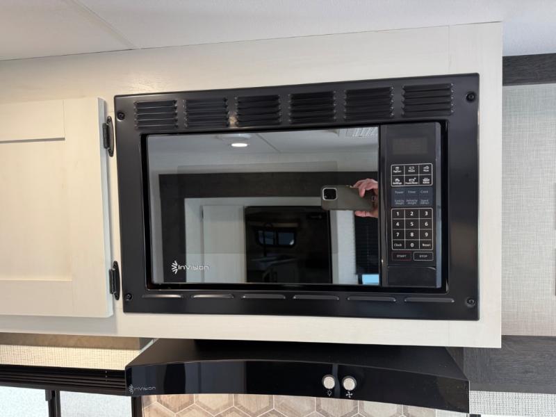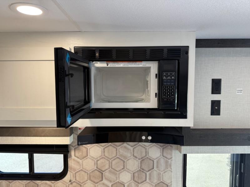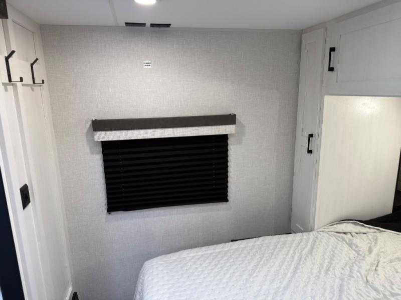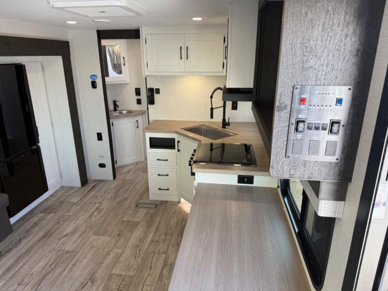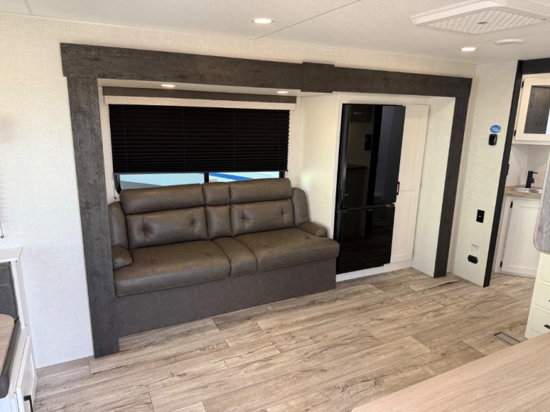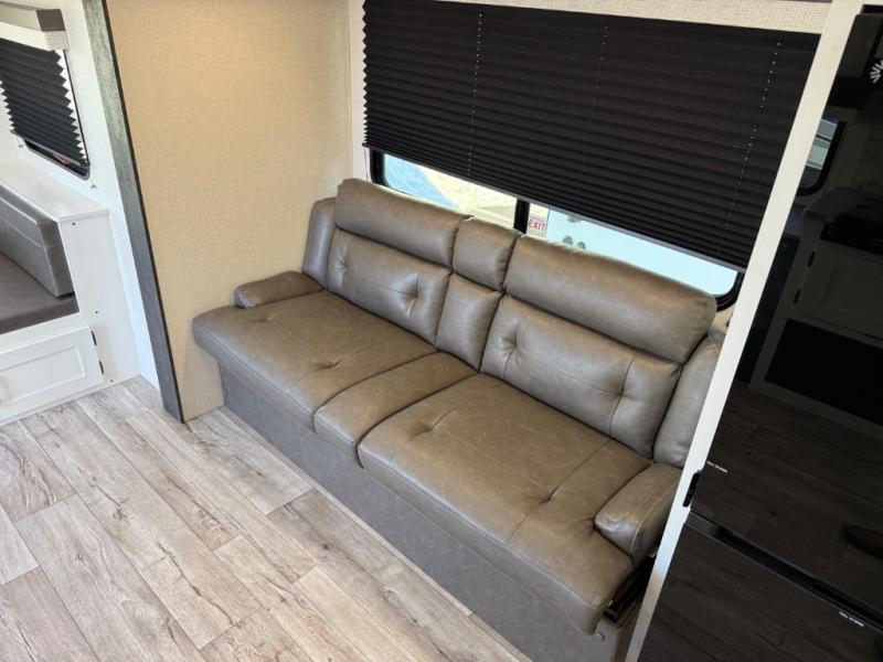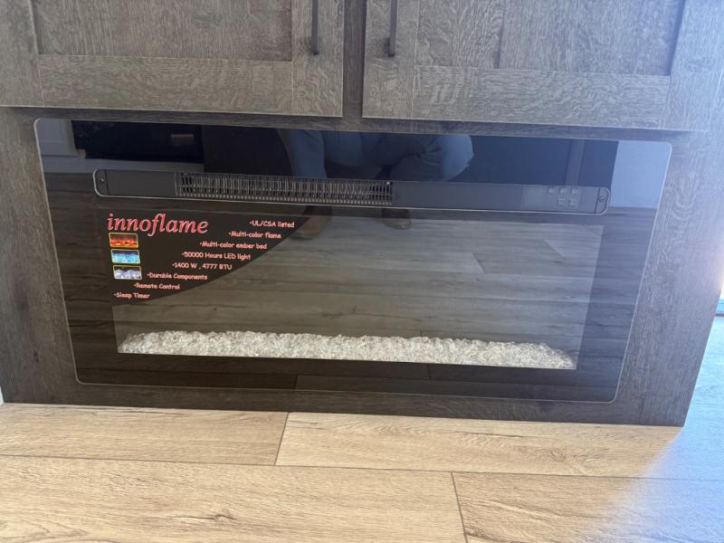 Unwind in a luxurious space that's perfect for creating unforgettable memories with loved ones. The inviting booth dinette is great for sharing meals or enjoying a quiet morning, while the plush sofa is perfect for lounging. Gather around the cozy fireplace on chilly evenings, or enjoy entertainment galore at the entertainment center. Whip up delicious meals with the powerful three-burner cooktop and handy sink, and keep snacks and drinks within reach in the refrigerator and pantry. Further, the walk-through bathroom is a refreshing haven to get ready in style and move freely, and the front bedroom's a peaceful retreat with a king bed, and you can stash your clothes and essentials in the overhead cabinets, wardrobes, and shelves. Plus, the double entry and exit doors make it easy to come and go.
