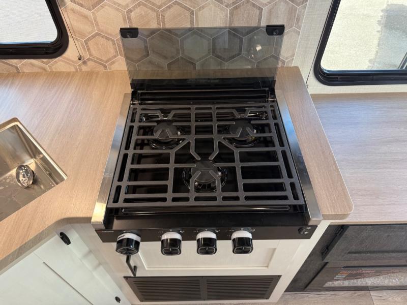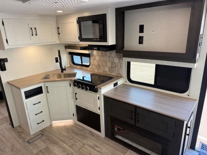 Elevate your travel experience with Venture RV Campbound travel trailers, where every journey is a great one, combining rugged construction with luxurious comfort for the ultimate adventure season. The BAL frame, with American steel and powder-coated & baked, is engineered for durability and strength, ensuring a smooth and stable ride. Dexter axles with EZ lube hubs make towing a breeze, while insulated baggage doors with magnetic catches provide secure and convenient storage. Plus, the Dicor Tufflex PVC walkable roof gives you peace of mind and easy maintenance. Step inside to experience our luxurious interior design, where style meets comfort. You can also enjoy the convenience of a tankless water heater and many other interior features.
