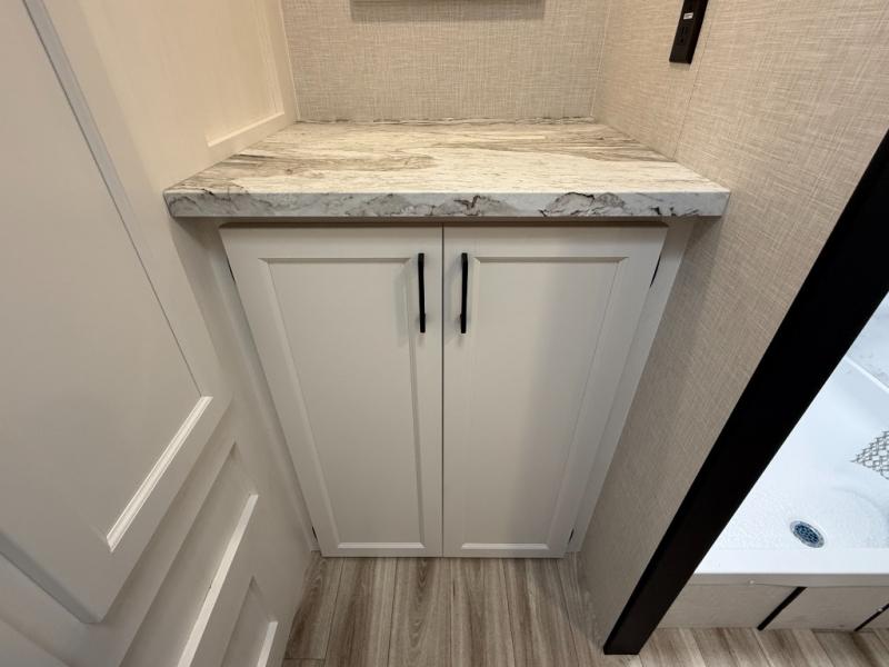 - Bathroom: Oversized rear bath with a roomy shower and linen storage.