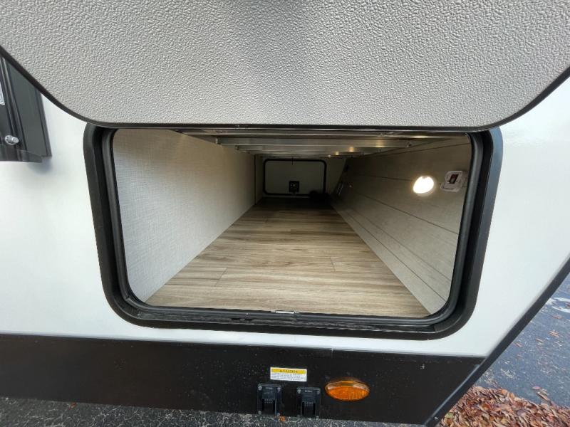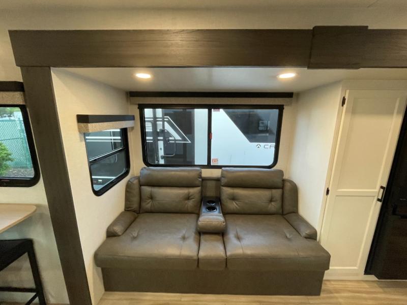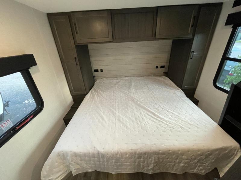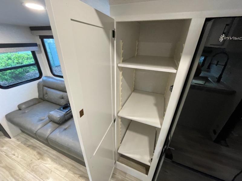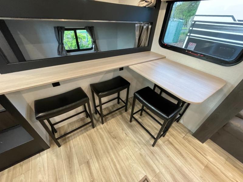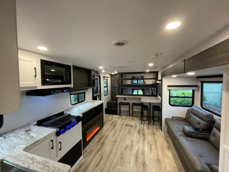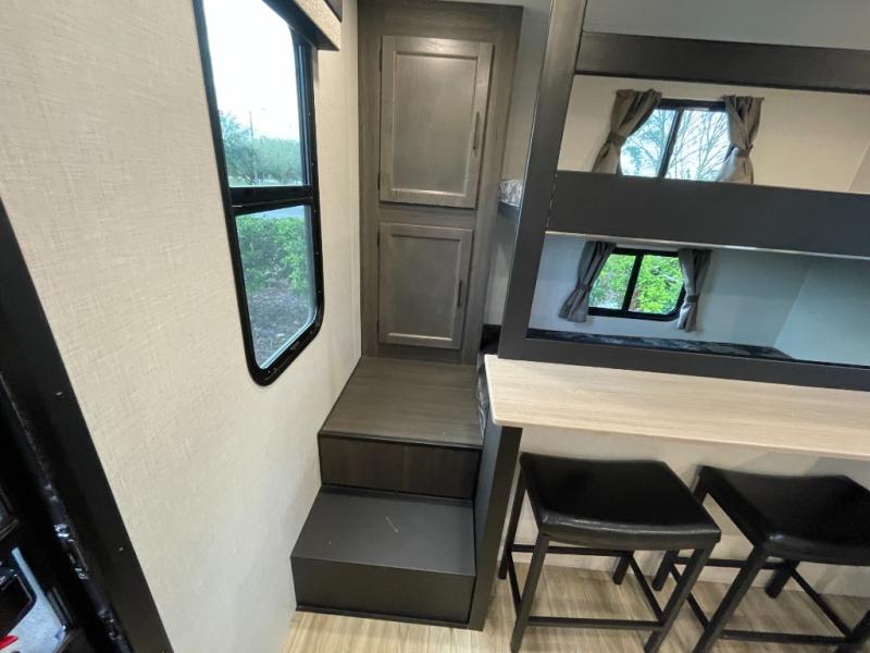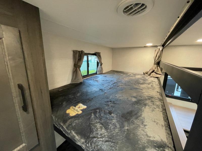 At the front of the trailer, a private bedroom offers a peaceful retreat with a spacious 70" x 80" king bed for a great night’s sleep, complemented by overhead cabinets and wardrobes on each side for clothing and essentials. Just steps away, the walk-through bathroom features a 30" x 36" shower, allowing you to freshen up in comfort without leaving the convenience of your trailer. The center of the floorplan opens into a welcoming living and kitchen area, where a slide-out houses the jiffy sofa for relaxing, along with a pantry and a 10 cu. ft. refrigerator to keep groceries and dry goods well stocked. Across from this space, the L-shaped kitchen is equipped with a three-burner cooktop, seamless countertops for easy meal prep, and abundant overhead cabinets for added storage. A bar and Sit n’ Slide table provide the perfect spot to enjoy meals or gather for board games. At the rear, a 40" x 70" bunk-over-bunk setup ensures the whole crew can rest comfortably after a day of adventure, with an additional wardrobe nearby for even more storage.