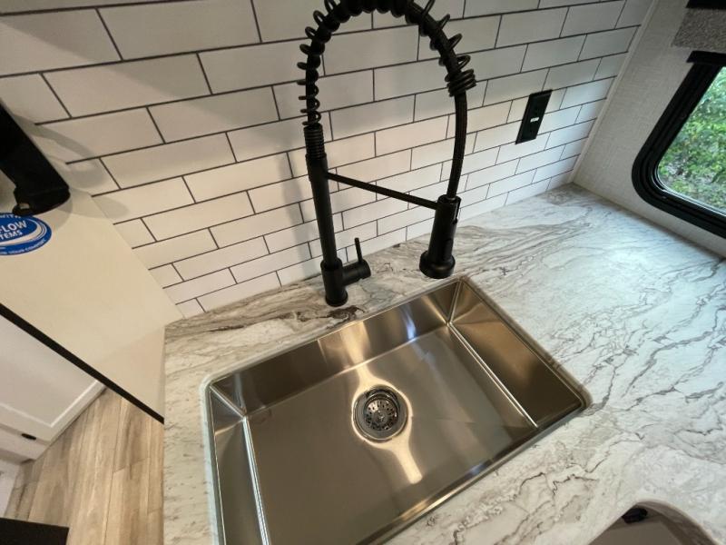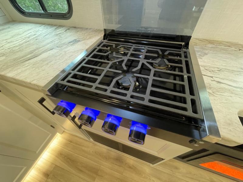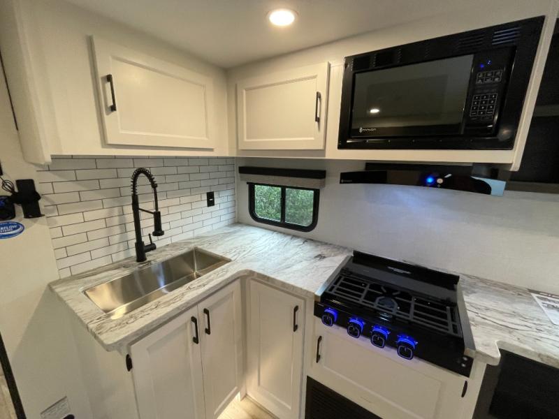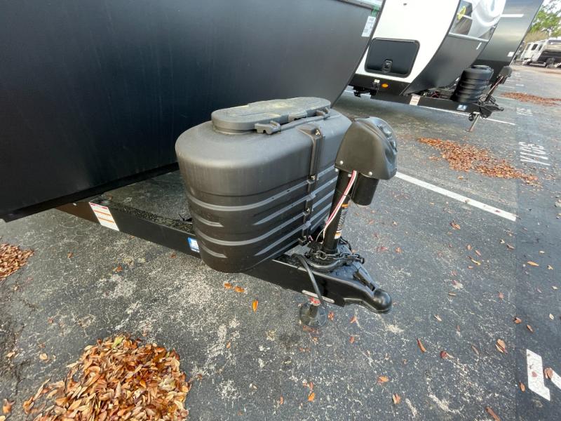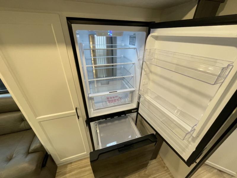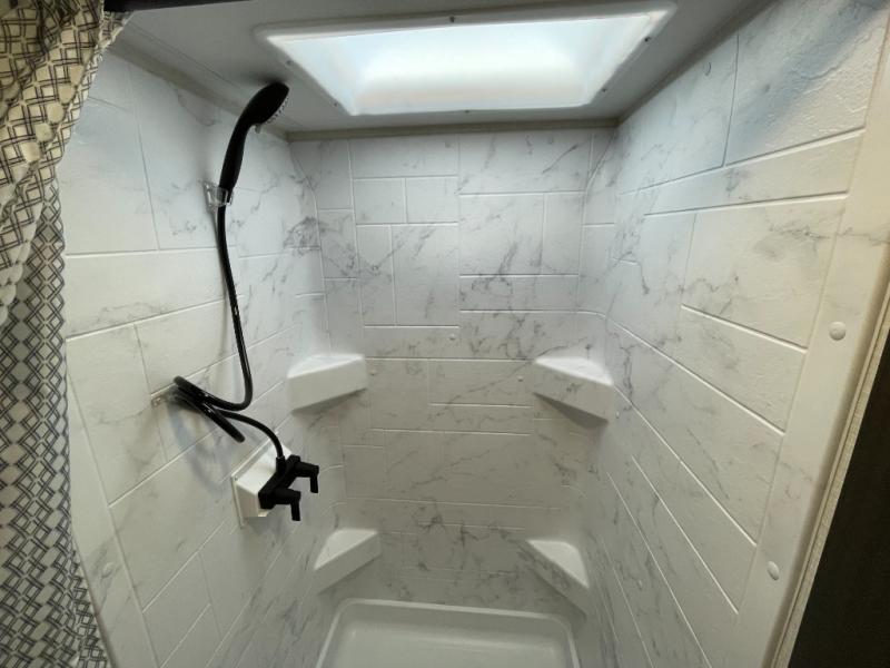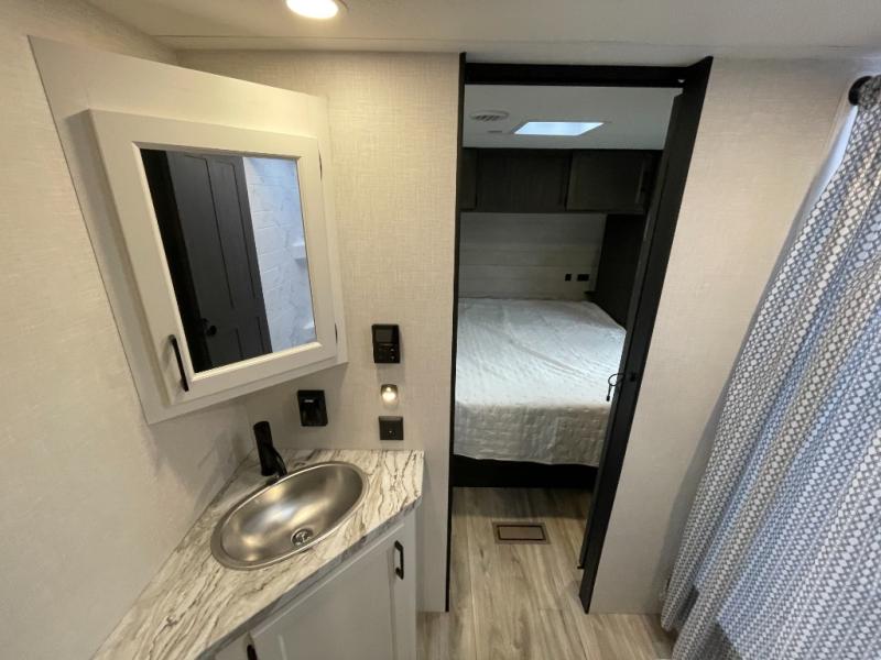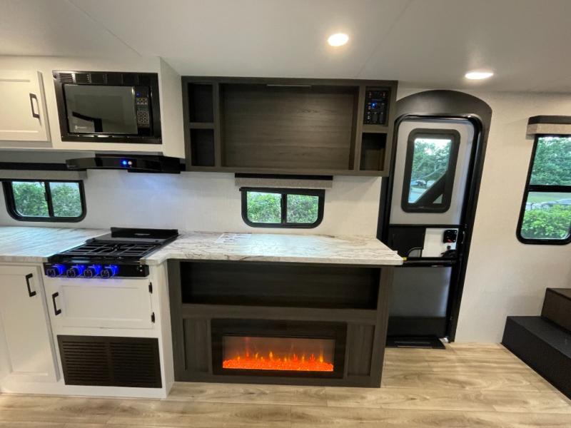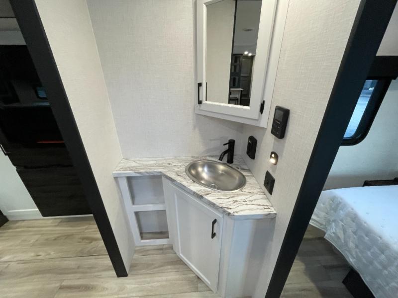 At the front of the trailer, a private bedroom offers a peaceful retreat with a spacious 70" x 80" king bed for a great night’s sleep, complemented by overhead cabinets and wardrobes on each side for clothing and essentials. Just steps away, the walk-through bathroom features a 30" x 36" shower, allowing you to freshen up in comfort without leaving the convenience of your trailer. The center of the floorplan opens into a welcoming living and kitchen area, where a slide-out houses the jiffy sofa for relaxing, along with a pantry and a 10 cu. ft. refrigerator to keep groceries and dry goods well stocked. Across from this space, the L-shaped kitchen is equipped with a three-burner cooktop, seamless countertops for easy meal prep, and abundant overhead cabinets for added storage. A bar and Sit n’ Slide table provide the perfect spot to enjoy meals or gather for board games. At the rear, a 40" x 70" bunk-over-bunk setup ensures the whole crew can rest comfortably after a day of adventure, with an additional wardrobe nearby for even more storage.