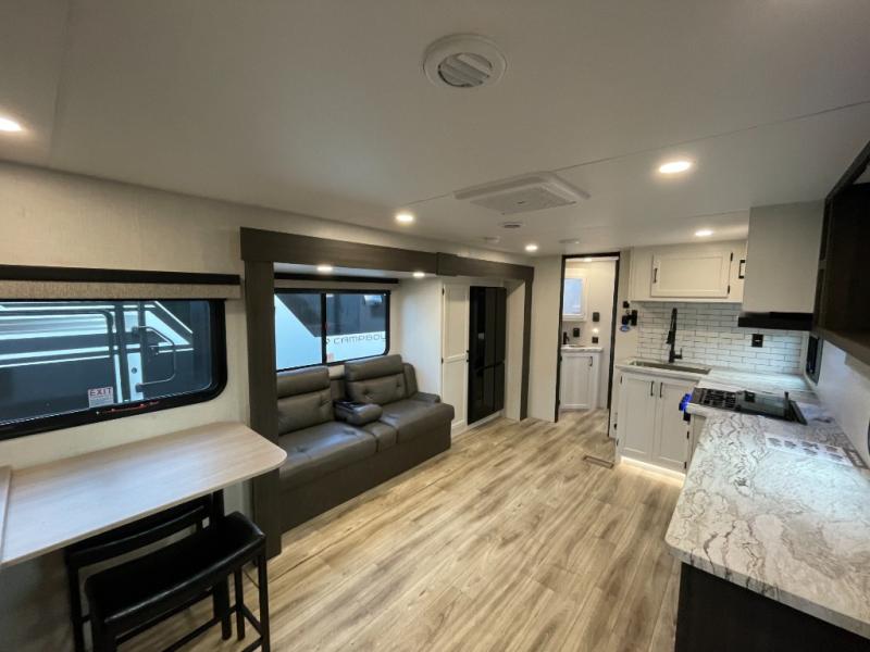 Designed to elevate every journey, these Venture RV Campbound Platinum travel trailers blend rugged construction with smart comfort features that make life on the road effortless. Dexter axles with EZ Lube hubs provide smooth towing and simplified maintenance, while power stabilizing jacks allow for quick, steady setup at every campsite. The Weather Shield insulation package, featuring a heated enclosed underbelly and radiant foil insulation, ensures dependable performance across changing climates. Inside, the living space is enhanced by a king-size bed with gas-strut storage supports, offering exceptional comfort along with practical, easy-access organization for life on the move.