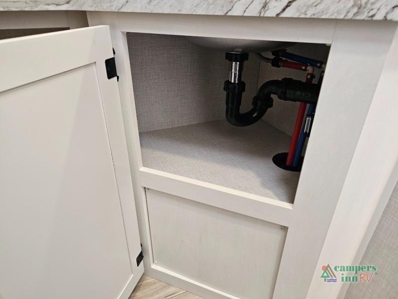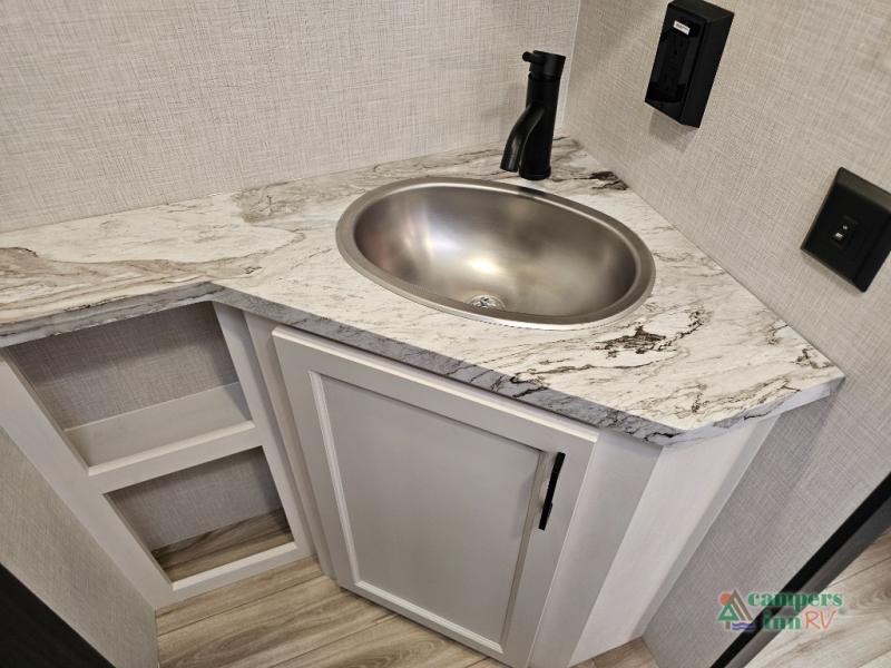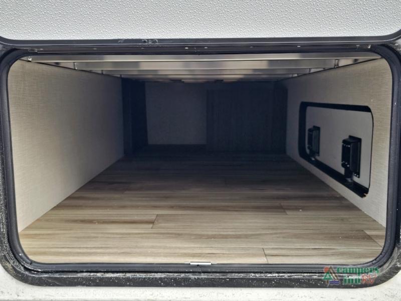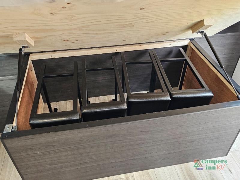 At the front of the trailer, a private bedroom offers a peaceful retreat with a spacious 70" x 80" king bed for a great night’s sleep, complemented by overhead cabinets and wardrobes on each side for clothing and essentials. Just steps away, the walk-through bathroom features a 30" x 36" shower, allowing you to freshen up in comfort without leaving the convenience of your trailer. The center of the floorplan opens into a welcoming living and kitchen area, where a slide-out houses the jiffy sofa for relaxing, along with a pantry and a 10 cu. ft. refrigerator to keep groceries and dry goods well stocked. Across from this space, the L-shaped kitchen is equipped with a three-burner cooktop, seamless countertops for easy meal prep, and abundant overhead cabinets for added storage. A bar and Sit n’ Slide table provide the perfect spot to enjoy meals or gather for board games. At the rear, a 40" x 70" bunk-over-bunk setup ensures the whole crew can rest comfortably after a day of adventure, with an additional wardrobe nearby for even more storage.