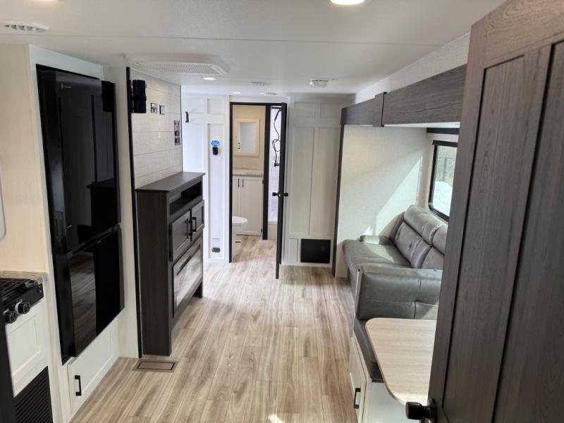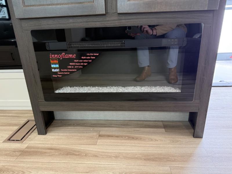 At the front of the trailer, the private bedroom offers a relaxing retreat with a spacious 70" x 80" king bed designed for a restful night’s sleep, along with overhead cabinets and dual wardrobes on each side to keep clothing and essentials neatly organized. Moving into the center of the trailer, the open kitchen and living area sits on a slide-out, creating extra room to move and unwind. Here you’ll find a comfortable 70" sofa and a Side N’ Slide dinette that easily converts into additional sleeping space, perfect for relaxing or gathering at the end of the day. Across from the seating area, the well-equipped kitchen includes a 10 cu. ft. refrigerator for groceries and cold drinks, while a cozy fireplace and entertainment center add warmth and ambiance. Tucked behind the entertainment center is a walk-in pantry with coat hooks, ideal for storing dry goods and outerwear. At the rear, the spacious full bathroom features a corner sink, a 30" x 36" shower, a porcelain foot-flush toilet, and a three-door linen closet that provides generous storage for towels and bathroom essentials.