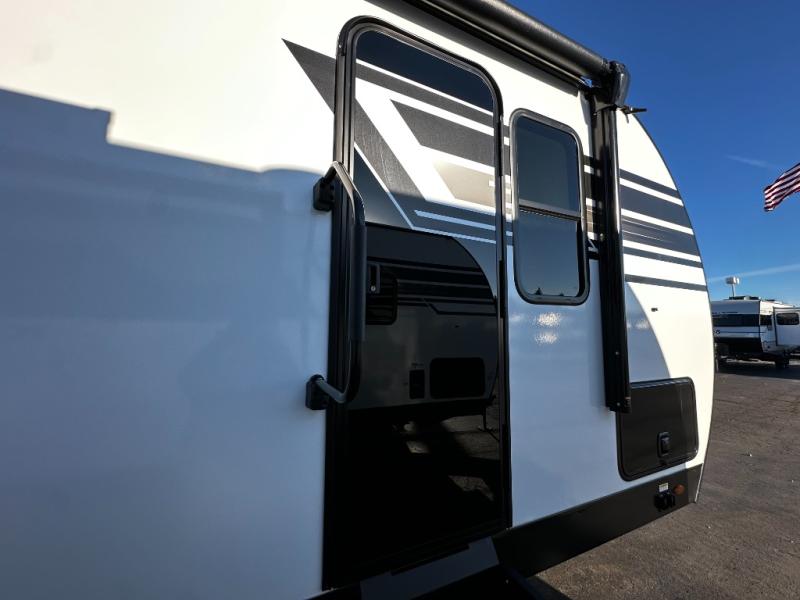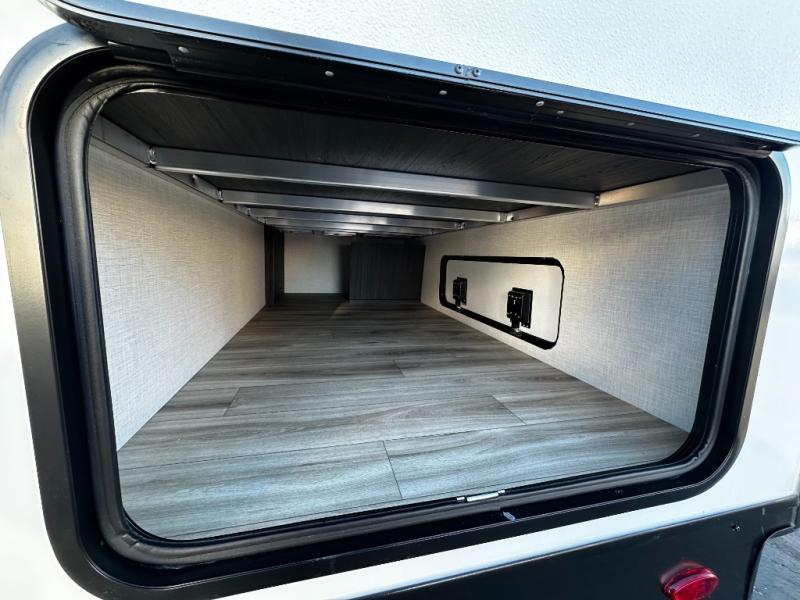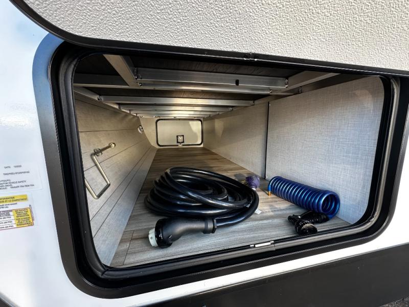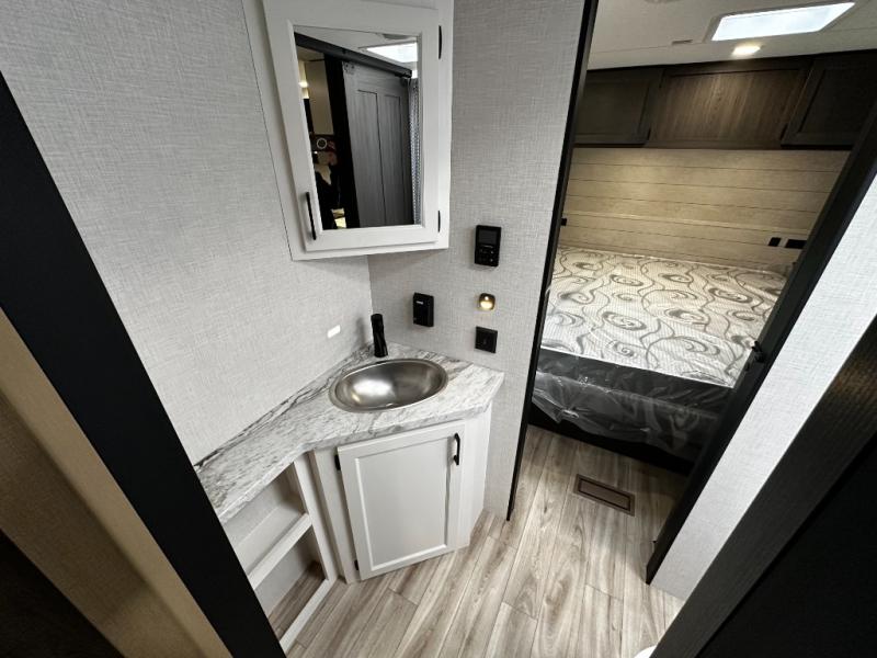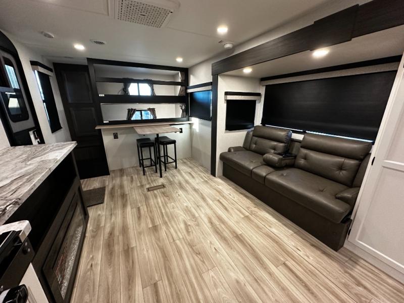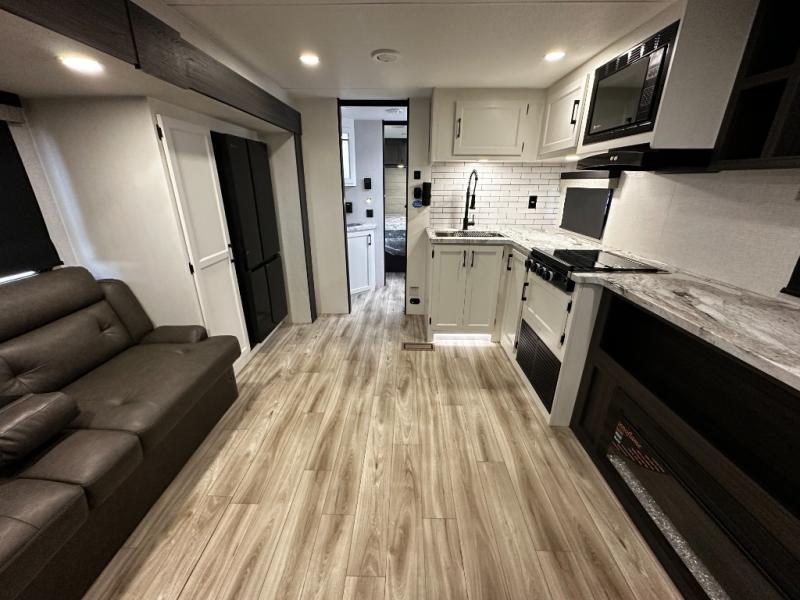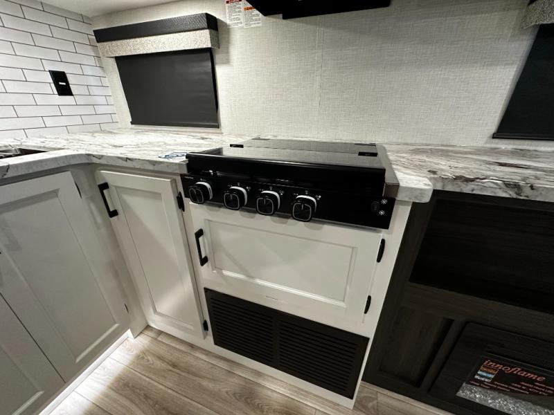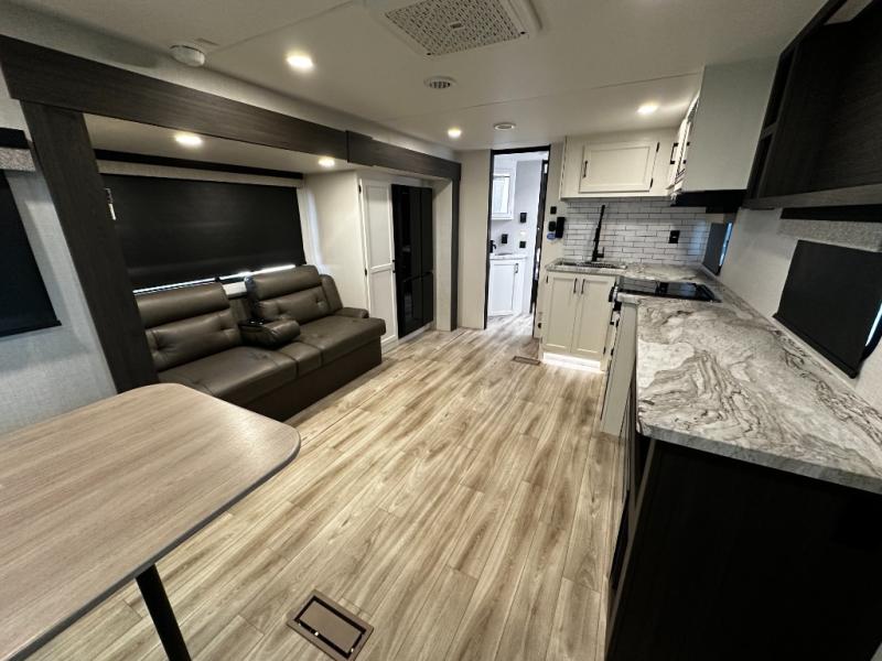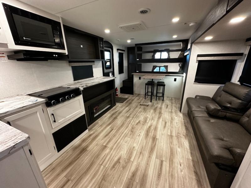 At the front of the trailer, a private bedroom offers a peaceful retreat with a spacious 70" x 80" king bed for a great night’s sleep, complemented by overhead cabinets and wardrobes on each side for clothing and essentials. Just steps away, the walk-through bathroom features a 30" x 36" shower, allowing you to freshen up in comfort without leaving the convenience of your trailer. The center of the floorplan opens into a welcoming living and kitchen area, where a slide-out houses the jiffy sofa for relaxing, along with a pantry and a 10 cu. ft. refrigerator to keep groceries and dry goods well stocked. Across from this space, the L-shaped kitchen is equipped with a three-burner cooktop, seamless countertops for easy meal prep, and abundant overhead cabinets for added storage. A bar and Sit n’ Slide table provide the perfect spot to enjoy meals or gather for board games. At the rear, a 40" x 70" bunk-over-bunk setup ensures the whole crew can rest comfortably after a day of adventure, with an additional wardrobe nearby for even more storage.