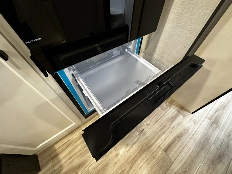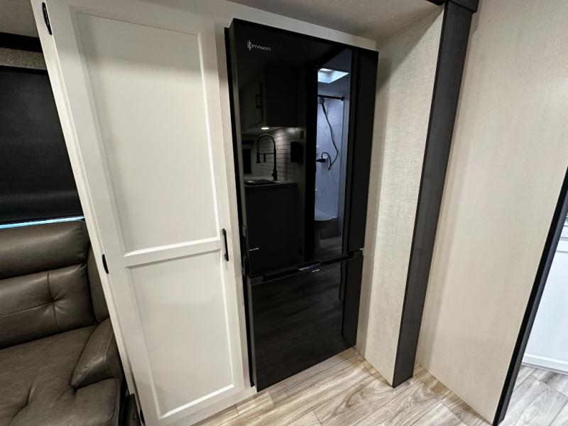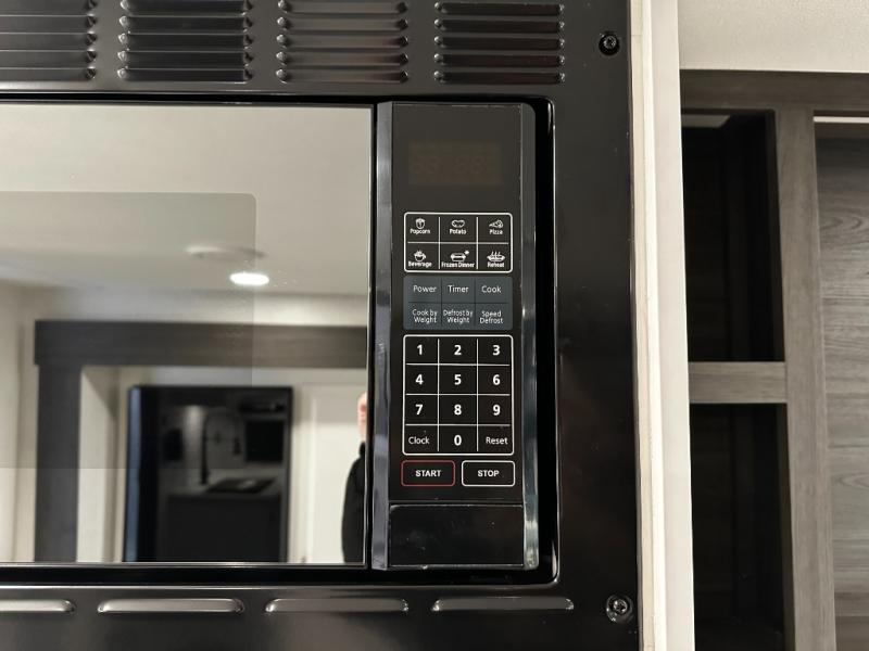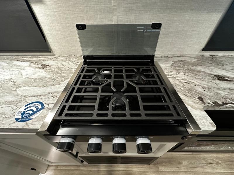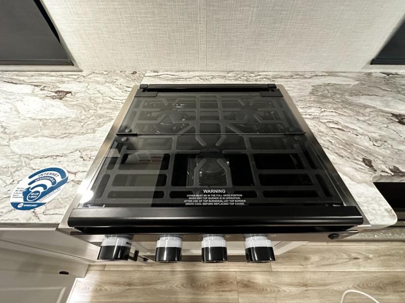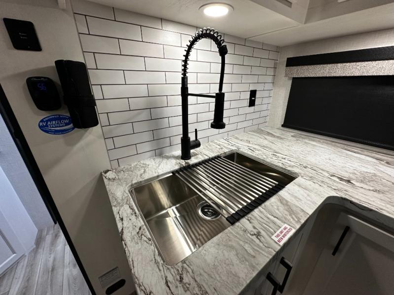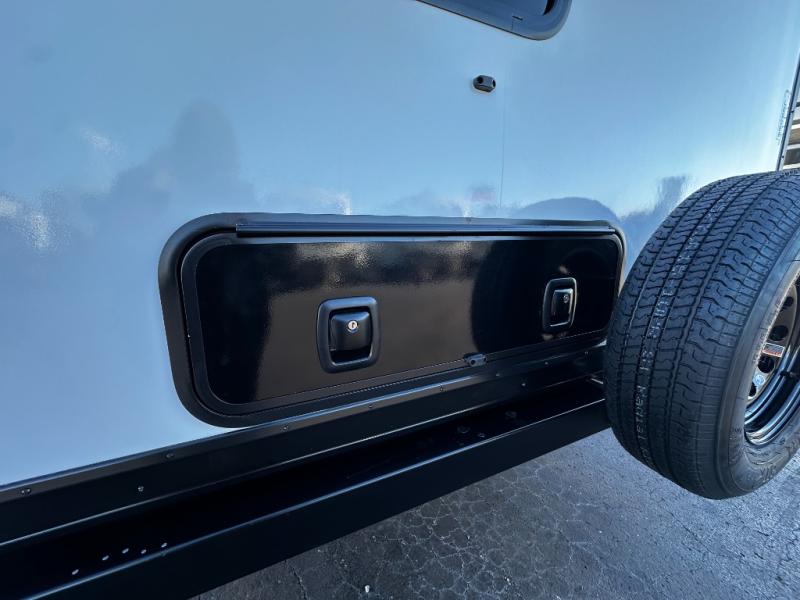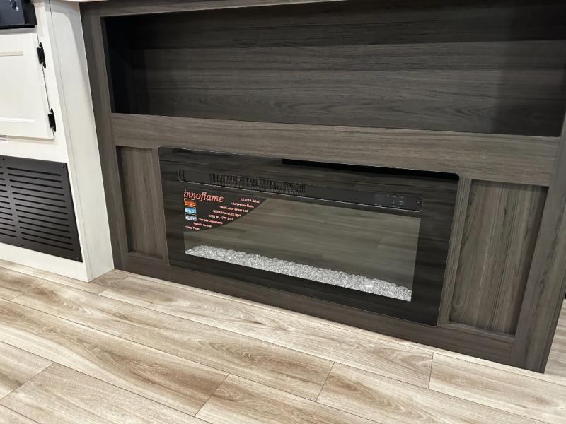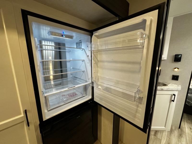 At the front of the trailer, a private bedroom offers a peaceful retreat with a spacious 70" x 80" king bed for a great night’s sleep, complemented by overhead cabinets and wardrobes on each side for clothing and essentials. Just steps away, the walk-through bathroom features a 30" x 36" shower, allowing you to freshen up in comfort without leaving the convenience of your trailer. The center of the floorplan opens into a welcoming living and kitchen area, where a slide-out houses the jiffy sofa for relaxing, along with a pantry and a 10 cu. ft. refrigerator to keep groceries and dry goods well stocked. Across from this space, the L-shaped kitchen is equipped with a three-burner cooktop, seamless countertops for easy meal prep, and abundant overhead cabinets for added storage. A bar and Sit n’ Slide table provide the perfect spot to enjoy meals or gather for board games. At the rear, a 40" x 70" bunk-over-bunk setup ensures the whole crew can rest comfortably after a day of adventure, with an additional wardrobe nearby for even more storage.