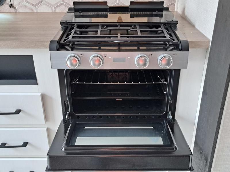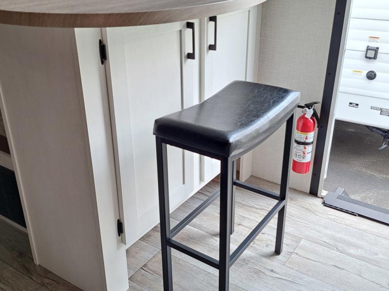 You'll love every minute spent in this dual entry travel trailer. The front master bedroom includes one of these doors, along with a Sleep Tight queen bed, dual wardrobes, and easy access into the walk-thru bath. Your crew can relax on the theater seating within the large slide out, play a game at the Sit N' Slide table with flipside reversible cushions, or dine at the bartop with stools. There is also a rear kitchen with ample counter space. Head outdoors to enjoy the 20' power awning in your camp chairs!