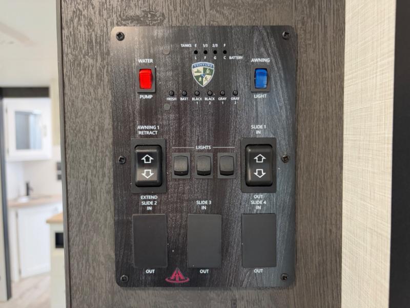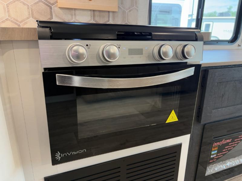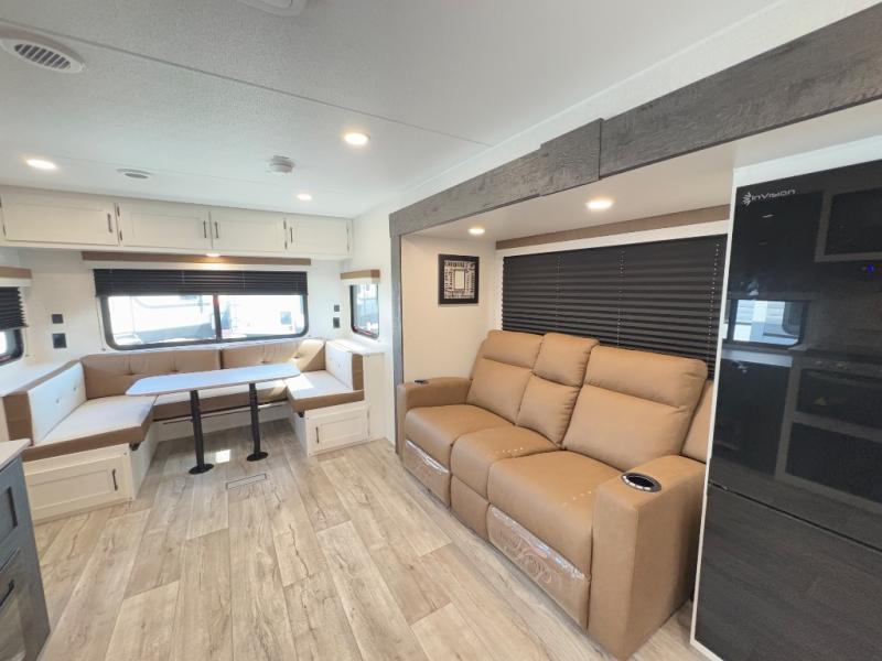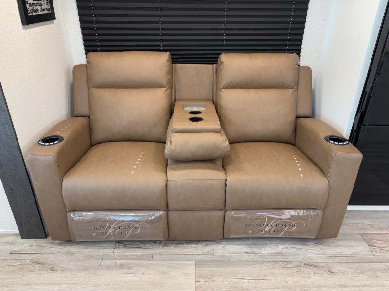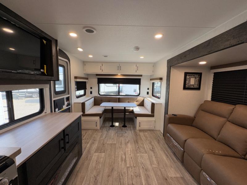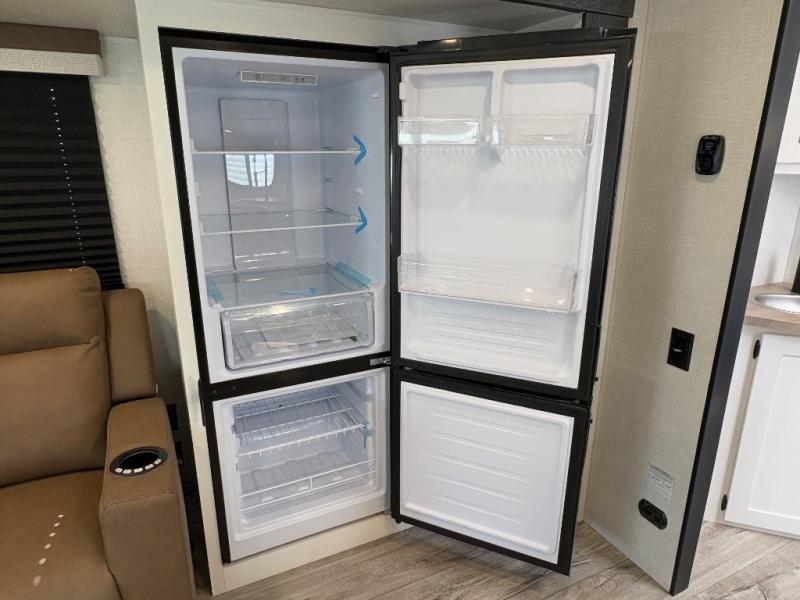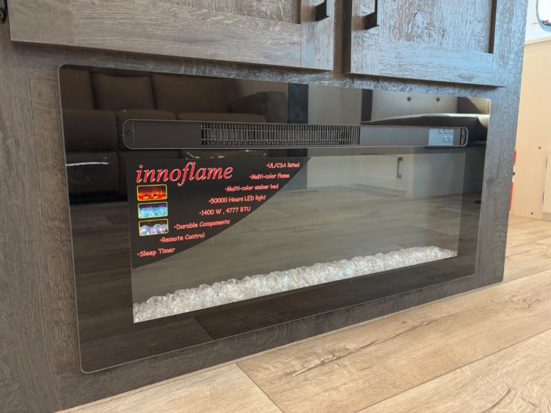 This fantastic trailer is packed with features that will make your travels comfortable, convenient, and unforgettable. In its luxurious interior you will find the U-shaped dinette perfect for meals or socializing, while the 70” sofa provides ample space for relaxation. The fireplace adds a cozy touch, creating a warm and inviting atmosphere. For the entertainment and leisure, the 40” TV is perfect for family movie nights or enjoying your favorite shows on the go. The entertainment system is designed to keep you entertained and relaxed. Moving to the kitchen area, the three-burner cooktop and pantry provide everything you need to prepare delicious meals on the go and the 12V refrigerator keeps your food and drinks fresh, ensuring you have everything you need for a comfortable trip. Convenience is found in the amazing walk-through bath offering easy access while the front bedroom is a serene retreat featuring a spacious queen bed, overhead cabinets, and wardrobes. Additional features like the two entry/exit doors provide added flexibility and ease of use, while the exterior awning furnish shade and protection from the elements.