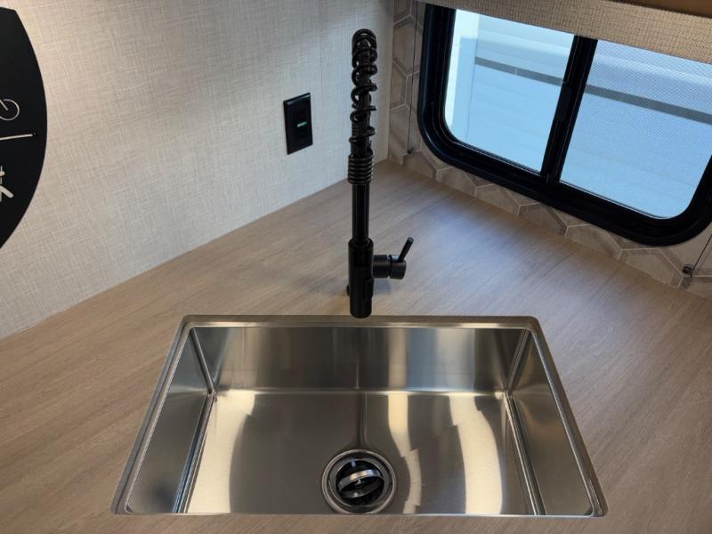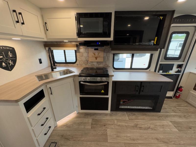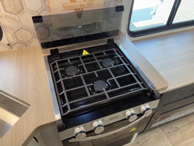 With any Sienna travel trailer by Venture RV, you will enjoy a lightweight unit, convenient amenities, and a durable construction that includes a BAL NXG-bolted frame. There is also a heated and enclosed one-piece underbelly, residential fiberglass insulation, and a reflective PVC roof membrane within the Weather-Shield Package to help extend your camping season. Outside, the BAL 5.0 power stabilizer jacks and power tongue jack will have you set up in no-time, and the Venture RV bottle opener/dog tie down will make it easy to bring your furry friends along. Head inside to enjoy the modern farmhouse design, along with Beauflor throughout with no carpet, custom backsplash, large underbed storage, and a bath skylight to name a few comforts!