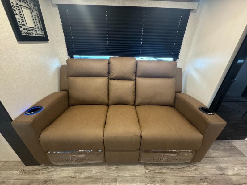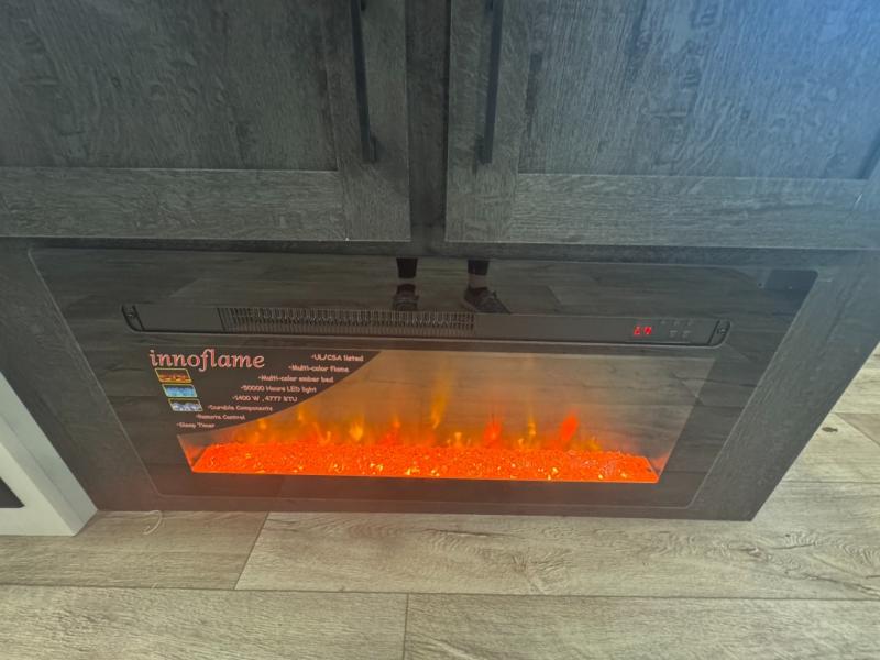 Rear Living Room Comfort: The spacious rear living area is the perfect place to relax after a day of exploring. With large panoramic windows, plush theater seating, and a cozy entertainment center with a fireplace, you’ll feel right at home wherever you park.
