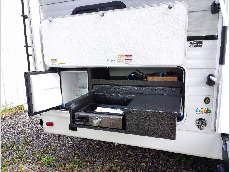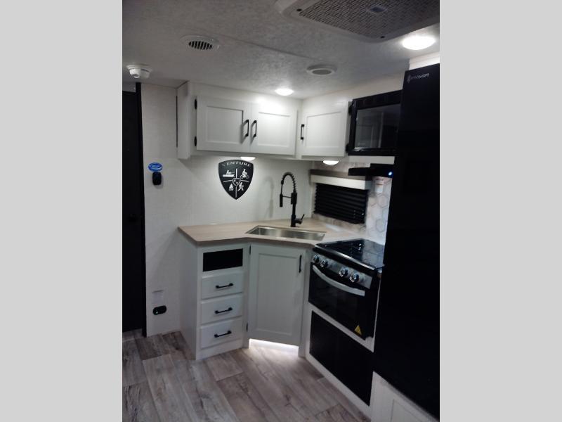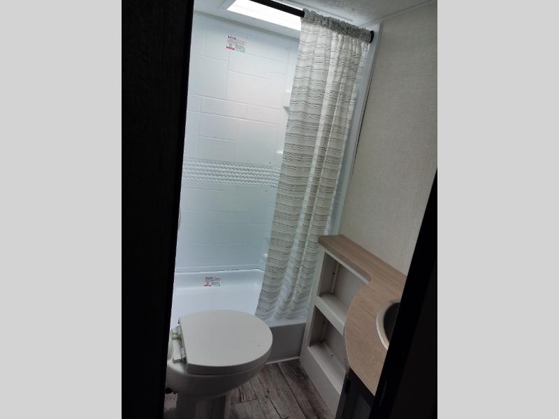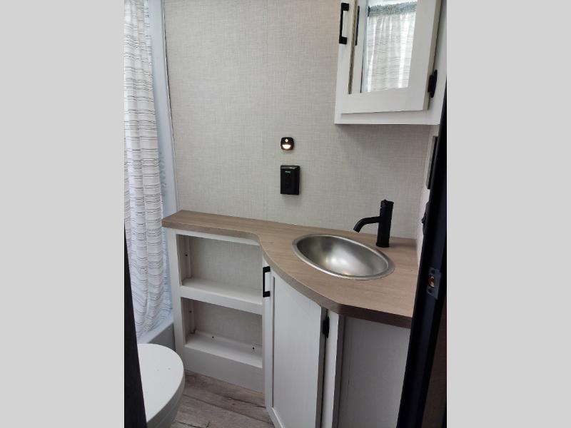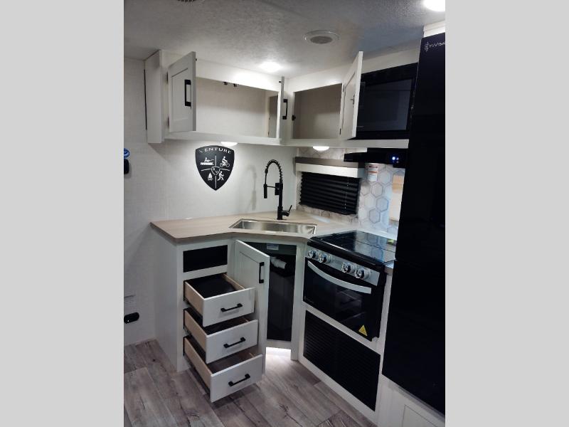 With any Sienna travel trailer by Venture RV, you will enjoy a lightweight unit, convenient amenities, and a durable construction that includes a BAL NXG-bolted frame. There is also a heated and enclosed one-piece underbelly, residential fiberglass insulation, and a reflective PVC roof membrane within the Weather-Shield Package to help extend your camping season. Outside, the BAL 5.0 power stabilizer jacks and power tongue jack will have you set up in no-time, and the Venture RV bottle opener/dog tie down will make it easy to bring your furry friends along. Head inside to enjoy the modern farmhouse design, along with Beauflor throughout with no carpet, custom backsplash, large underbed storage, and a bath skylight to name a few comforts!