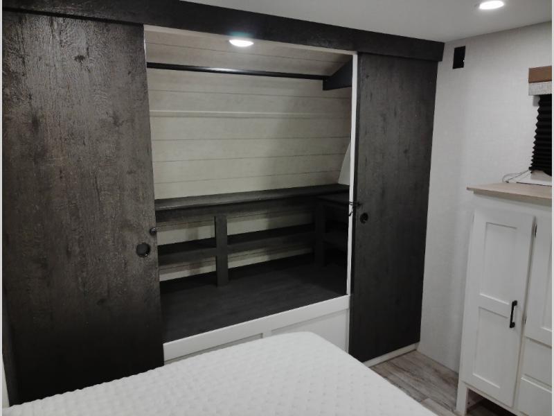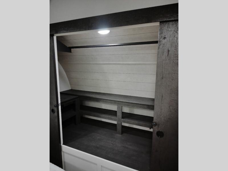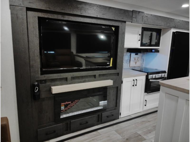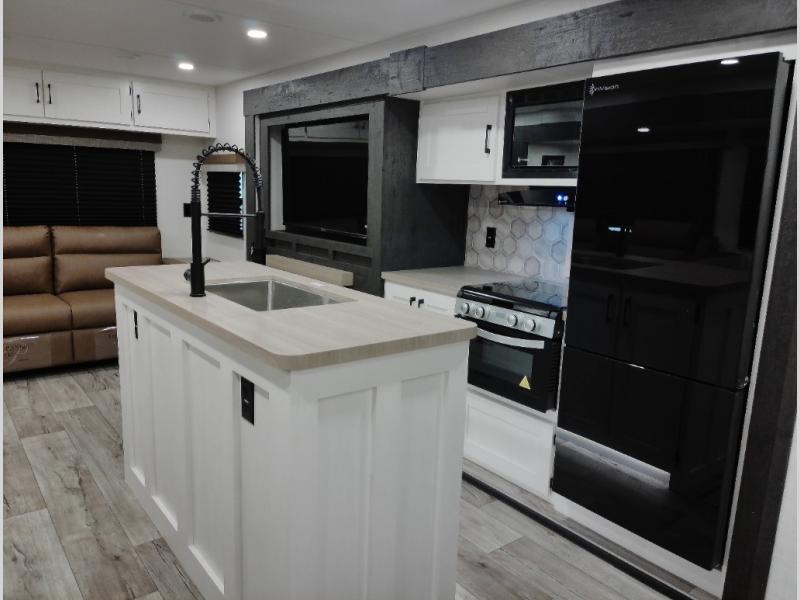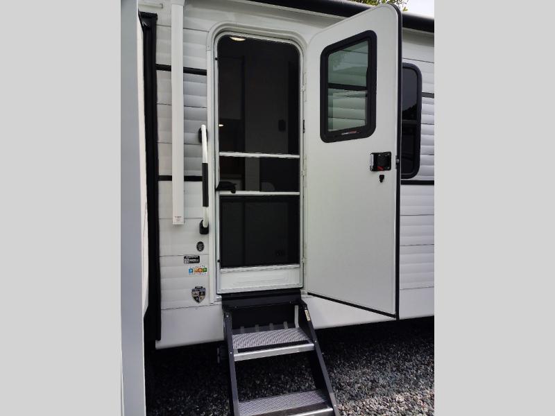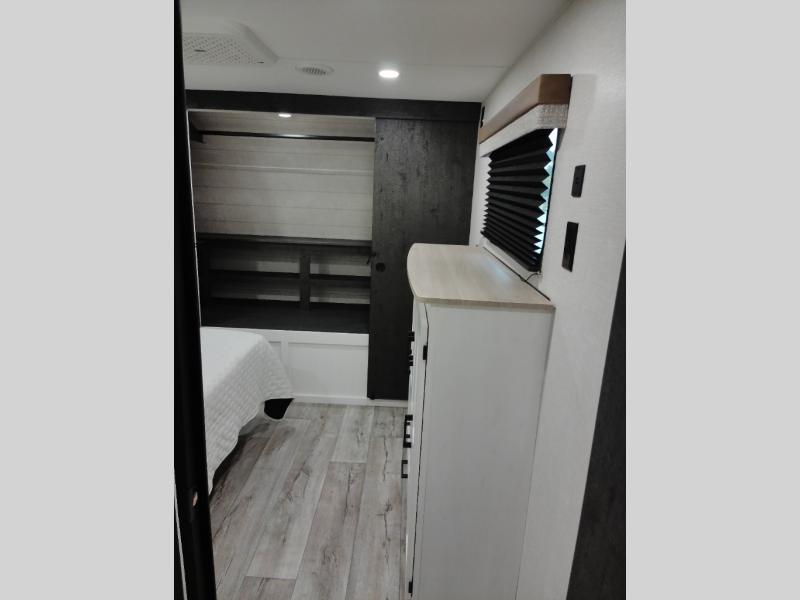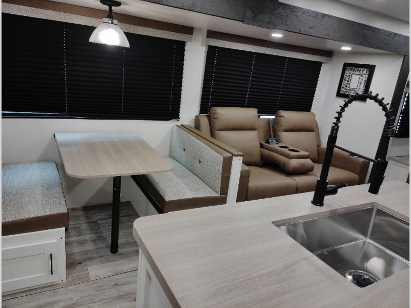 This travel trailer will feel just like home thanks to its spacious interior, large front private bedroom, and kitchen island. There are plenty of places to seating space, including a rear 70" sofa plus theater seating and a Sit N' Slide table within one of the slides. The opposing slide here includes the entertainment center and some of the kitchen appliances. You will also appreciate two pantries, one with washer and dryer prep if you want to add those appliances. A full bath lets you stay clean throughout your trip without having to use the campground's facilities, and the front bedroom is sure to make you feel at home. There is a Sleep Tight queen bed slide, a large front closet, plus a dresser and a second closet for ample storage space!