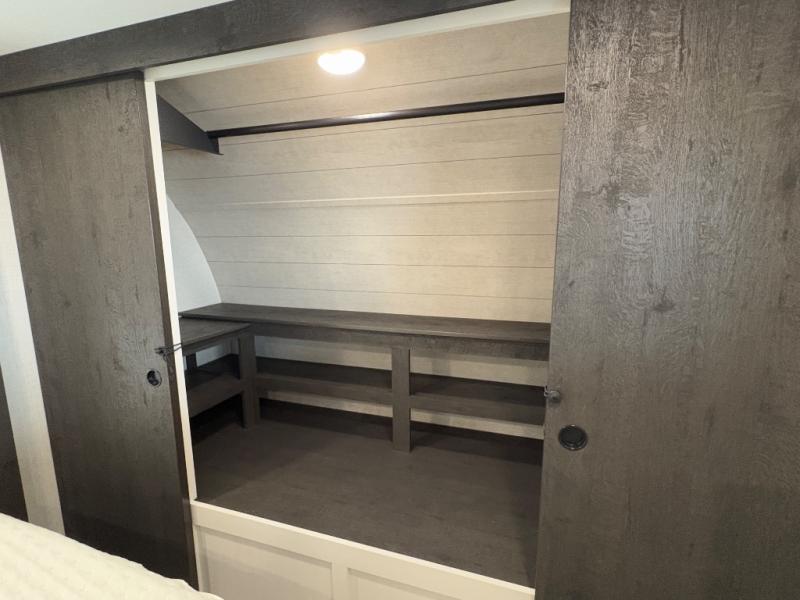 This travel trailer will feel just like home thanks to its spacious interior, large front private bedroom, and kitchen island. There are plenty of places to seating space, including a rear 70" sofa plus theater seating and a Sit N' Slide table within one of the slides. The opposing slide here includes the entertainment center and some of the kitchen appliances. You will also appreciate two pantries, one with washer and dryer prep if you want to add those appliances. A full bath lets you stay clean throughout your trip without having to use the campground's facilities, and the front bedroom is sure to make you feel at home. There is a Sleep Tight queen bed slide, a large front closet, plus a dresser and a second closet for ample storage space!