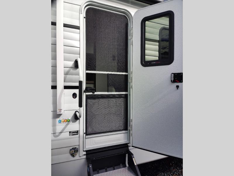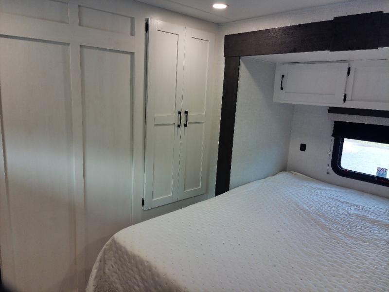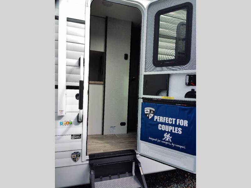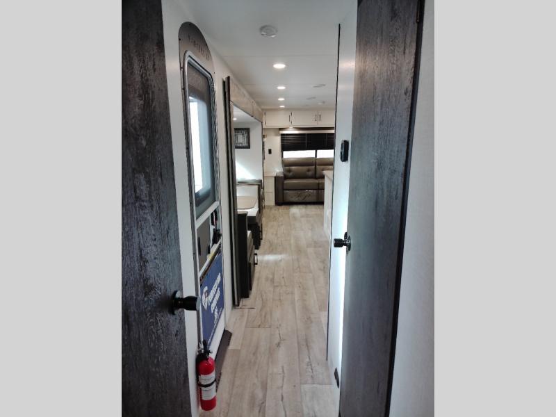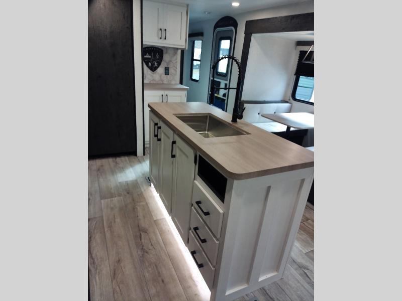 This travel trailer will feel just like home thanks to its spacious interior, large front private bedroom, and kitchen island. There are plenty of places to seating space, including a rear 70" sofa plus theater seating and a Sit N' Slide table within one of the slides. The opposing slide here includes the entertainment center and some of the kitchen appliances. You will also appreciate two pantries, one with washer and dryer prep if you want to add those appliances. A full bath lets you stay clean throughout your trip without having to use the campground's facilities, and the front bedroom is sure to make you feel at home. There is a Sleep Tight queen bed slide, a large front closet, plus a dresser and a second closet for ample storage space!