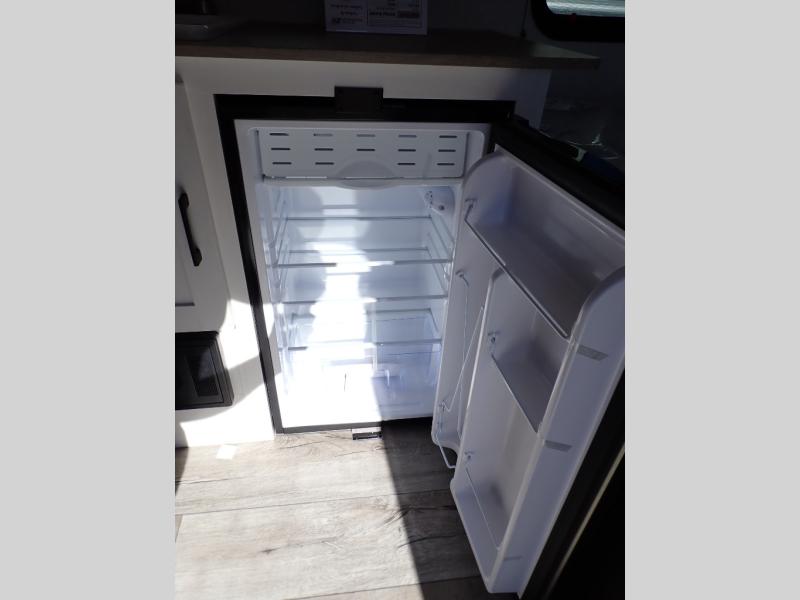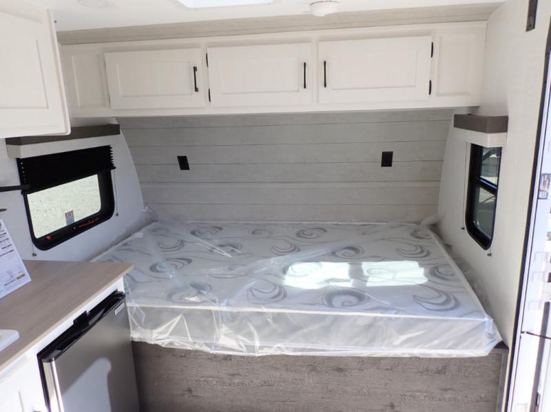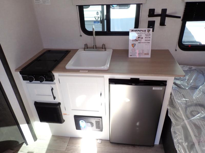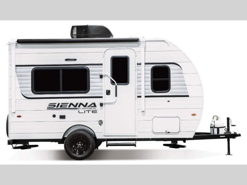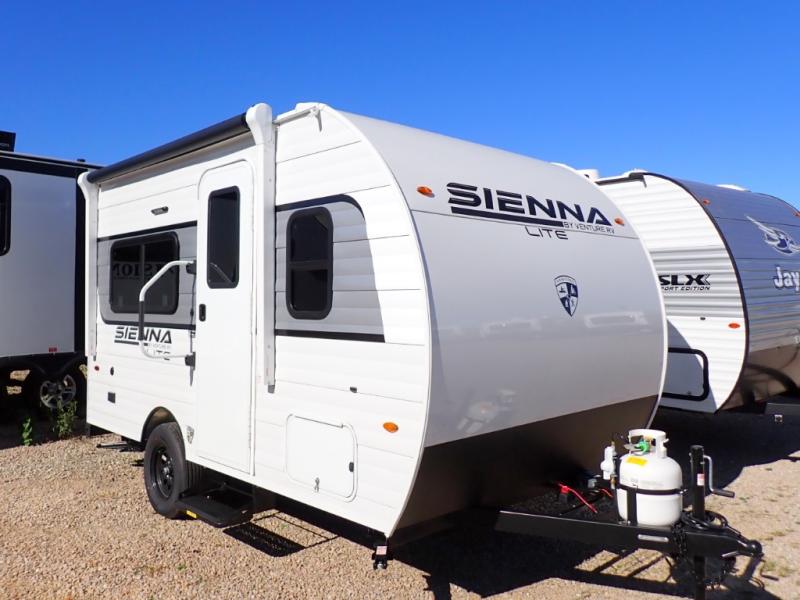 The all new Sienna Lite 130VRD is perfect for a couple. Really great little compact camper. Front 54 x 80 bed, rear dinette, full bath. Unlike similar sized compact RVs, the Sienna Lite 130VRD is NOT a wet bath. It has a corner shower.