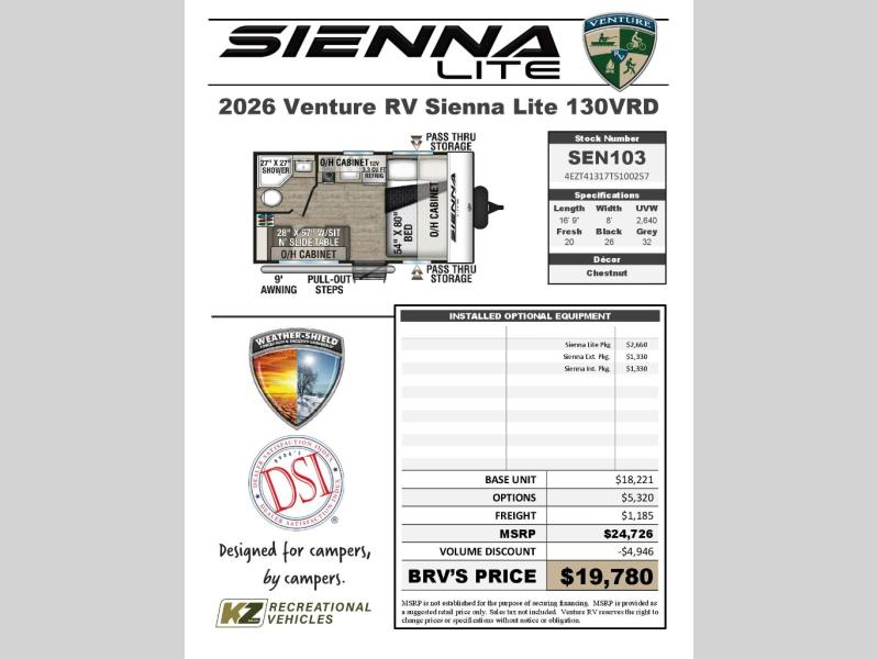 New 2026 Venture RV Sienna Lite 130VRD Travel Trailer