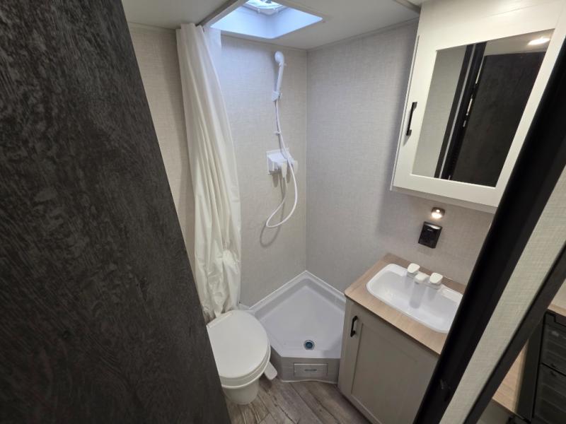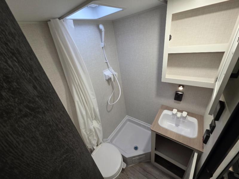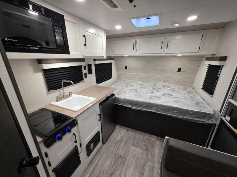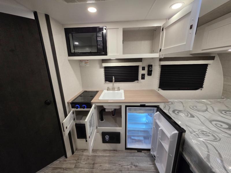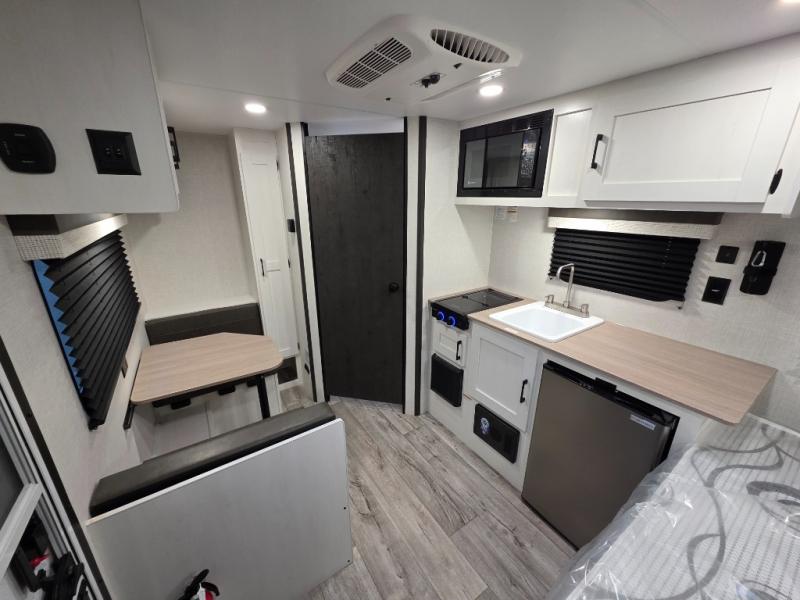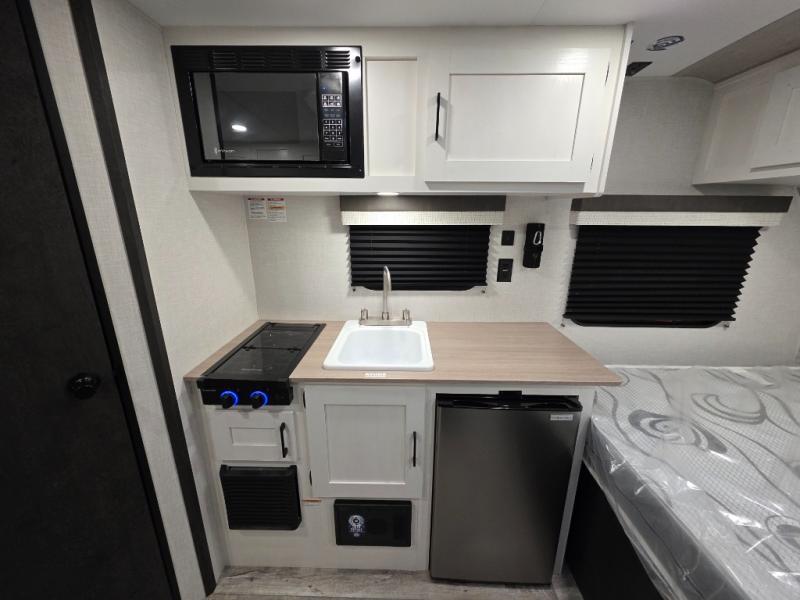 You’re going to love how efficient and comfortable this Sienna Lite 130 travel trailer feels for its size! The kitchen includes a 3.3 cu. ft. refrigerator and an overhead cabinet to keep snacks and essentials organized, and the slide table gives you a convenient spot to eat, work, or plan the day. When it’s time to wind down, the 54" x 80" bed offers a cozy place to recharge, and the 27" x 27" shower in the dry bath makes it easy to freshen up without relying on campground facilities.