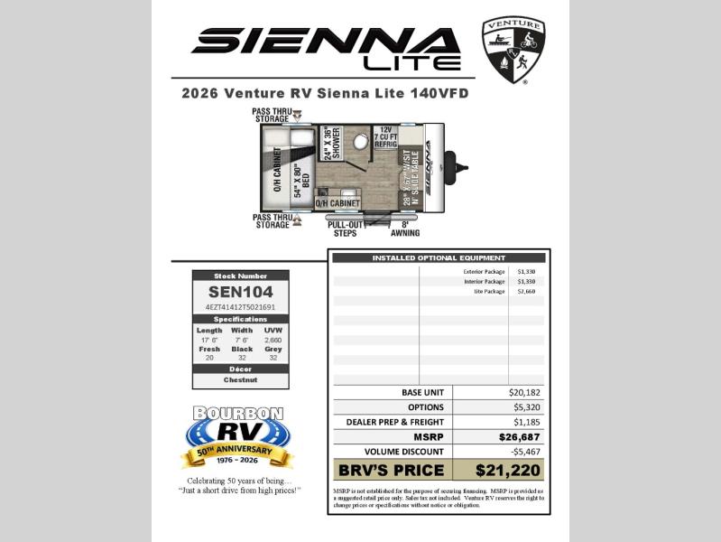 New 2026 Venture RV Sienna Lite SA140VFD Travel Trailer