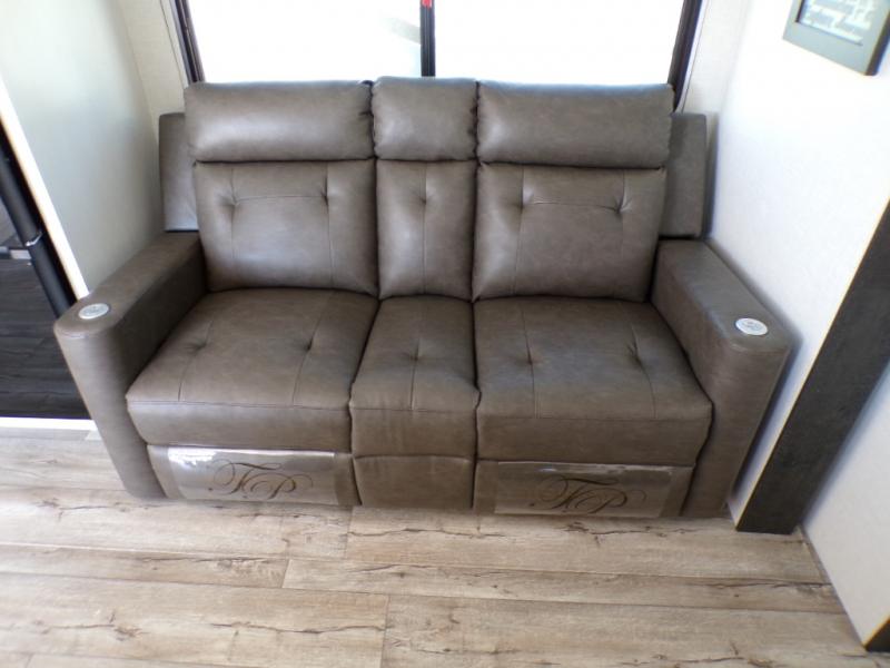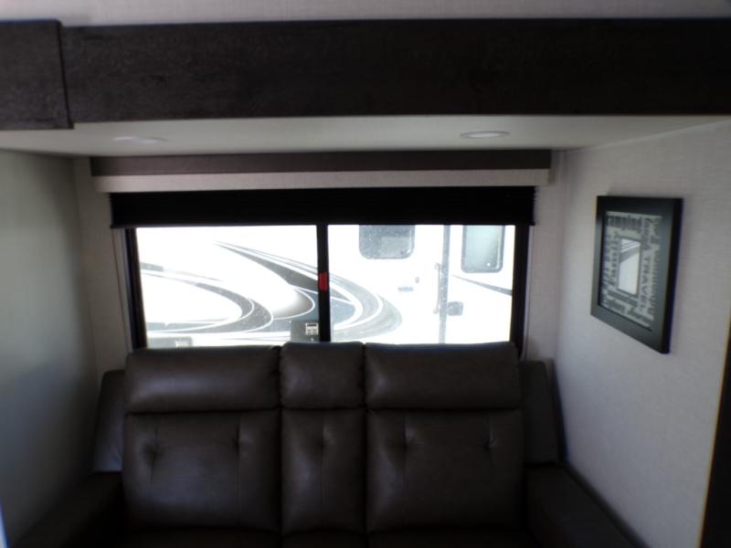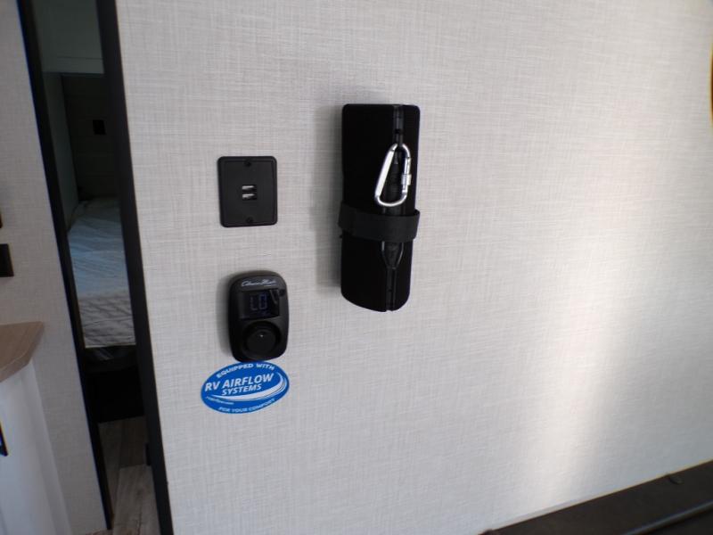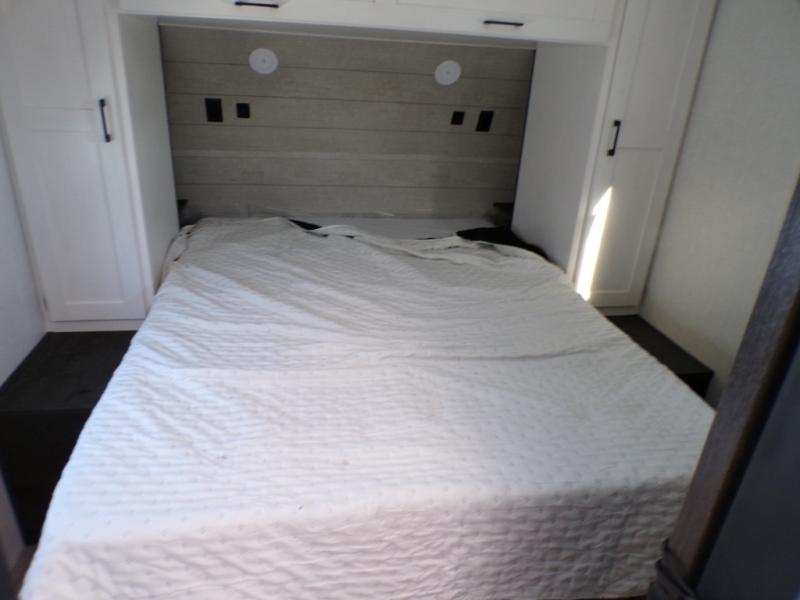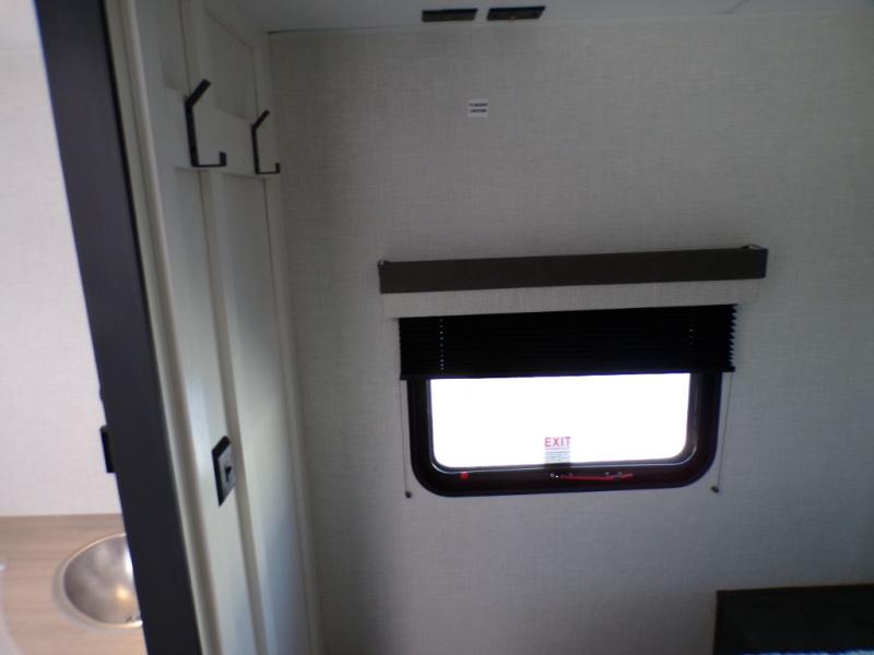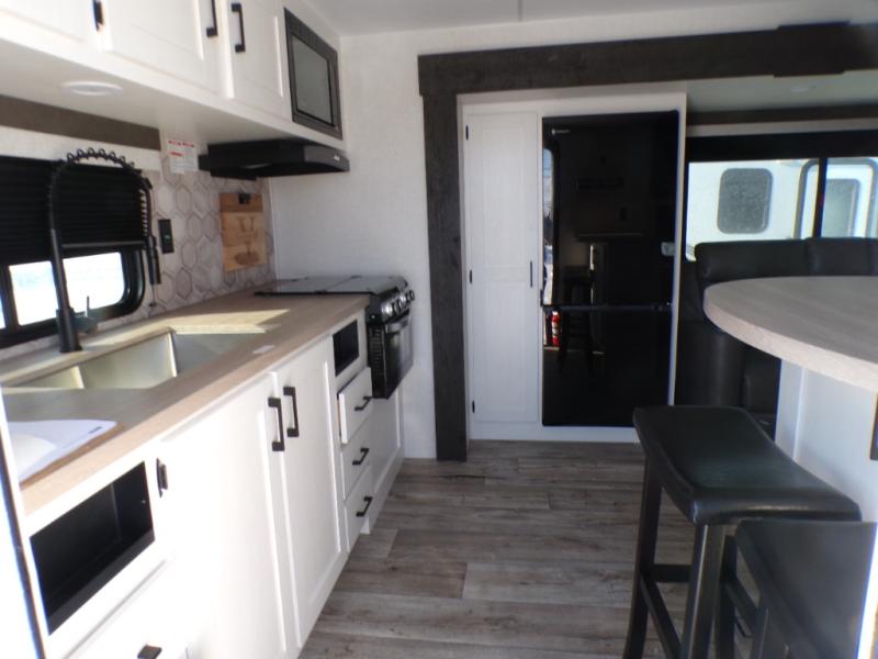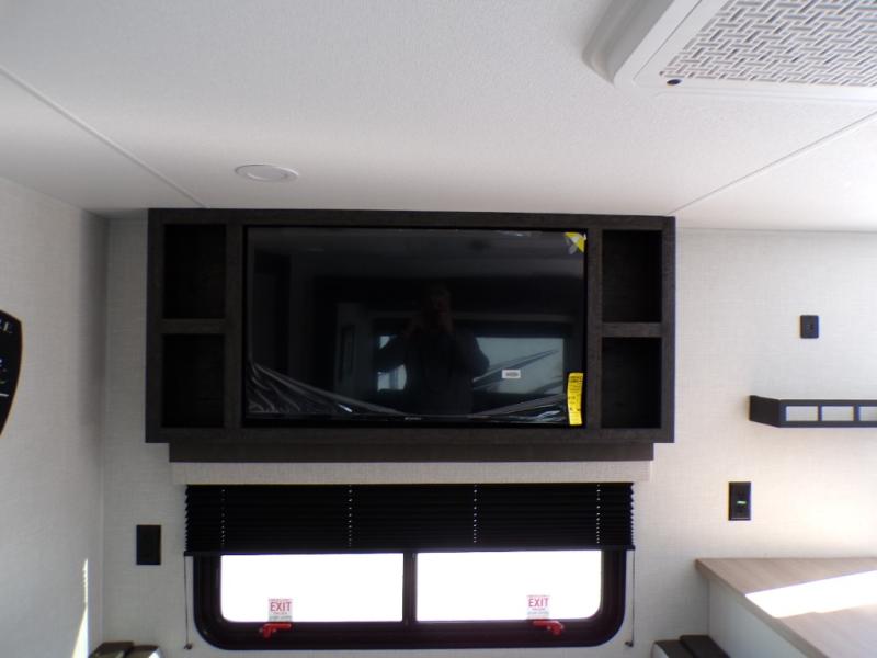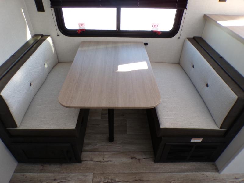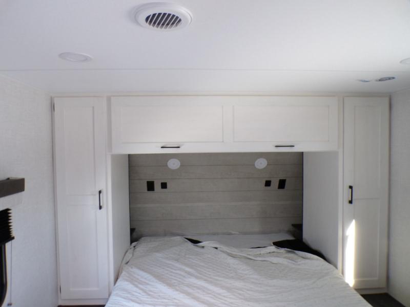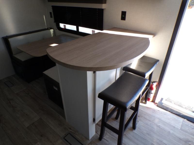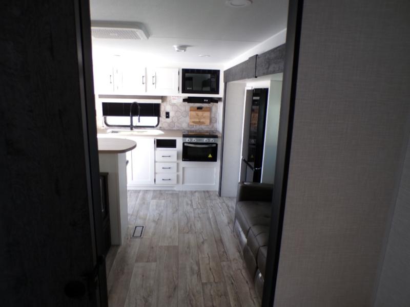 You'll love every minute spent in this dual entry travel trailer. The front master bedroom includes one of these doors, along with a Sleep Tight queen bed, dual wardrobes, and easy access into the walk-thru bath. Your crew can relax on the theater seating within the large slide out, play a game at the Sit N' Slide table with flipside reversible cushions, or dine at the bartop with stools. There is also a rear kitchen with ample counter space. Head outdoors to enjoy the 20' power awning in your camp chairs!