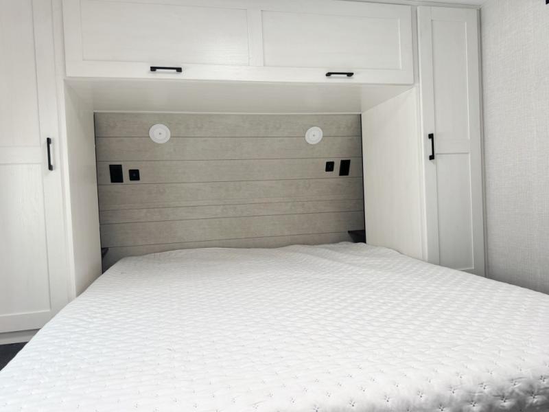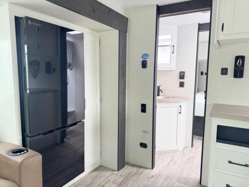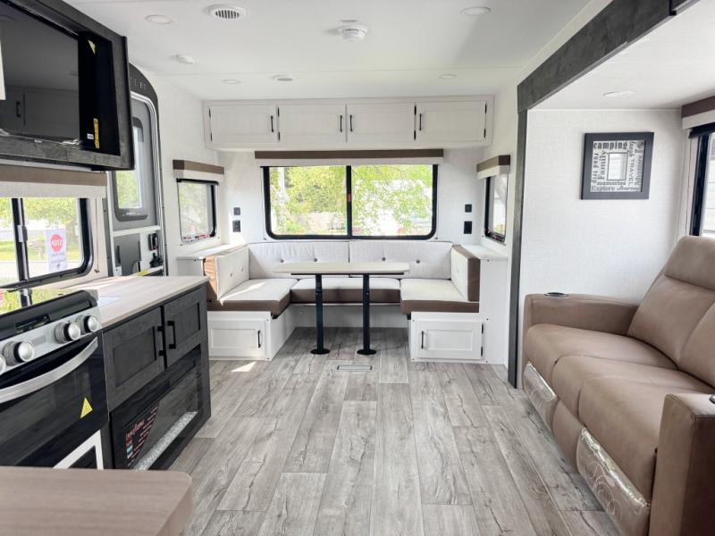 This fantastic trailer is packed with features that will make your travels comfortable, convenient, and unforgettable. In its luxurious interior you will find the U-shaped dinette perfect for meals or socializing, while the 70” sofa provides ample space for relaxation. The fireplace adds a cozy touch, creating a warm and inviting atmosphere. For the entertainment and leisure, the 40” TV is perfect for family movie nights or enjoying your favorite shows on the go. The entertainment system is designed to keep you entertained and relaxed. Moving to the kitchen area, the three-burner cooktop and pantry provide everything you need to prepare delicious meals on the go and the 12V refrigerator keeps your food and drinks fresh, ensuring you have everything you need for a comfortable trip. Convenience is found in the amazing walk-through bath offering easy access while the front bedroom is a serene retreat featuring a spacious queen bed, overhead cabinets, and wardrobes. Additional features like the two entry/exit doors provide added flexibility and ease of use, while the exterior awning furnish shade and protection from the elements.