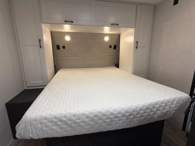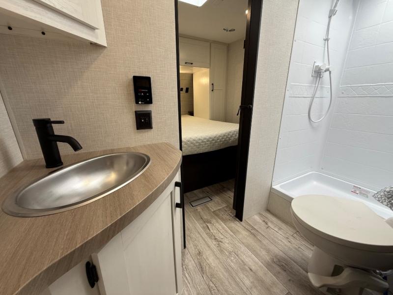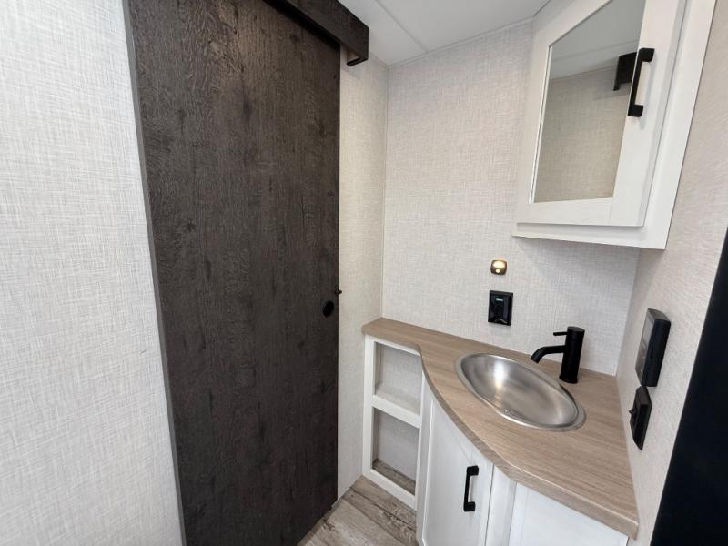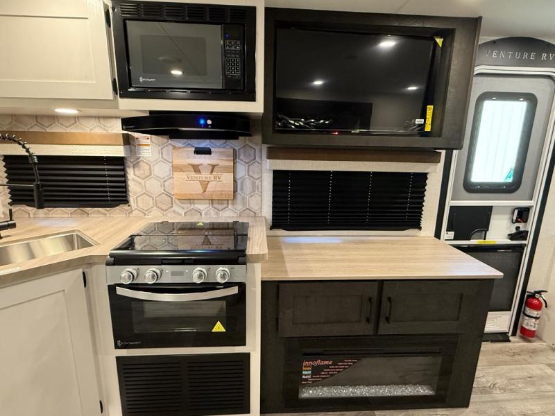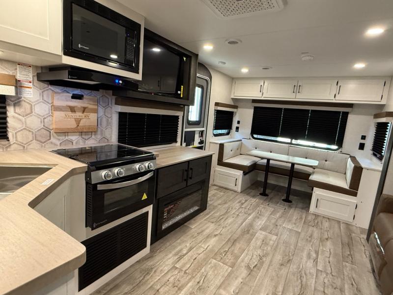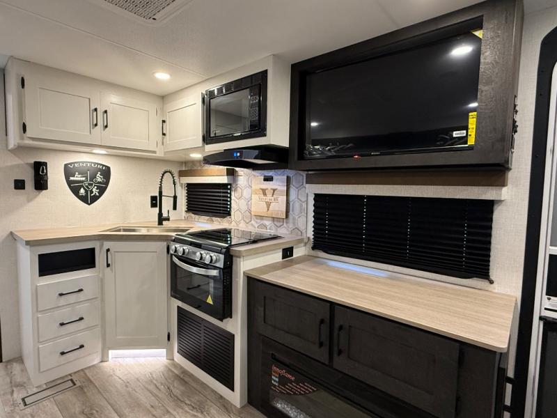 With any Sienna travel trailer by Venture RV, you will enjoy a lightweight unit, convenient amenities, and a durable construction that includes a BAL NXG-bolted frame. There is also a heated and enclosed one-piece underbelly, residential fiberglass insulation, and a reflective PVC roof membrane within the Weather-Shield Package to help extend your camping season. Outside, the BAL 5.0 power stabilizer jacks and power tongue jack will have you set up in no-time, and the Venture RV bottle opener/dog tie down will make it easy to bring your furry friends along. Head inside to enjoy the modern farmhouse design, along with Beauflor throughout with no carpet, custom backsplash, large underbed storage, and a bath skylight to name a few comforts!